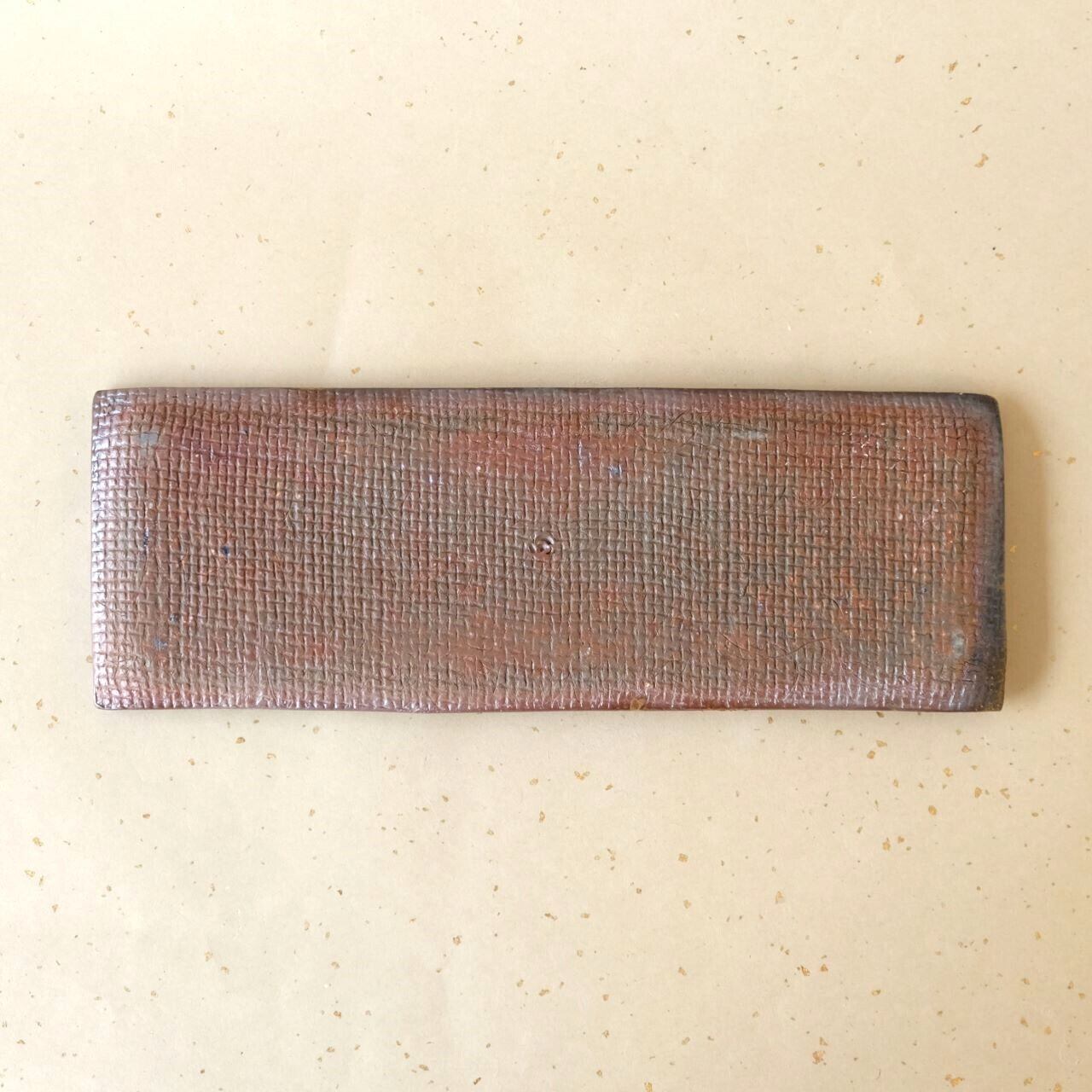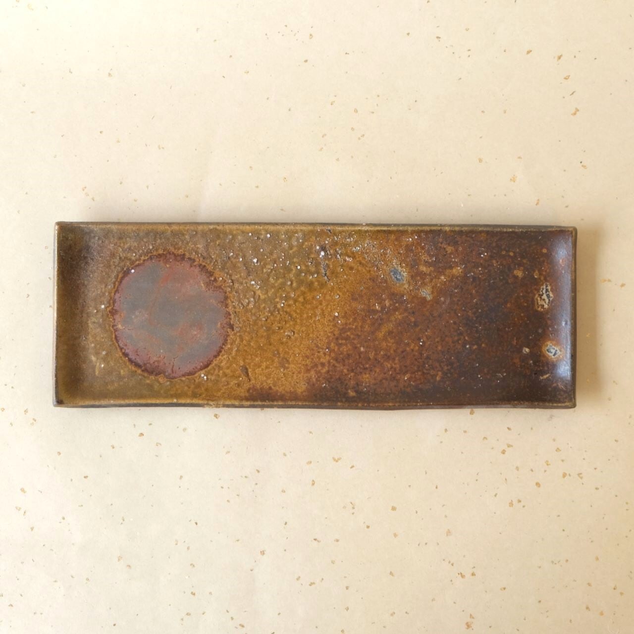シンプルな長方形のお皿です。縁を軽く曲げているので汁気のあるものでも盛り付けることができます。片面には松割木の灰がかかり、丸い抜け模様(牡丹餅)がアクセントになっています。