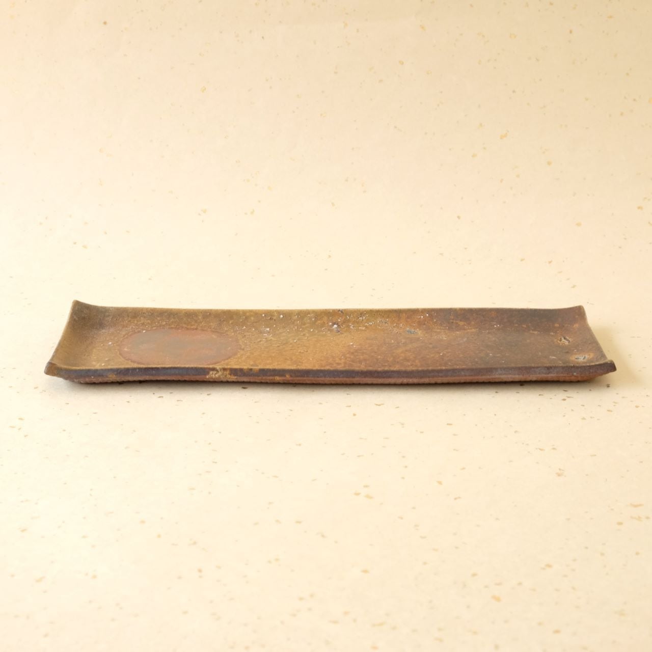 シンプルな長方形のお皿です。縁を軽く曲げているので汁気のあるものでも盛り付けることができます。片面には松割木の灰がかかり、丸い抜け模様(牡丹餅)がアクセントになっています。