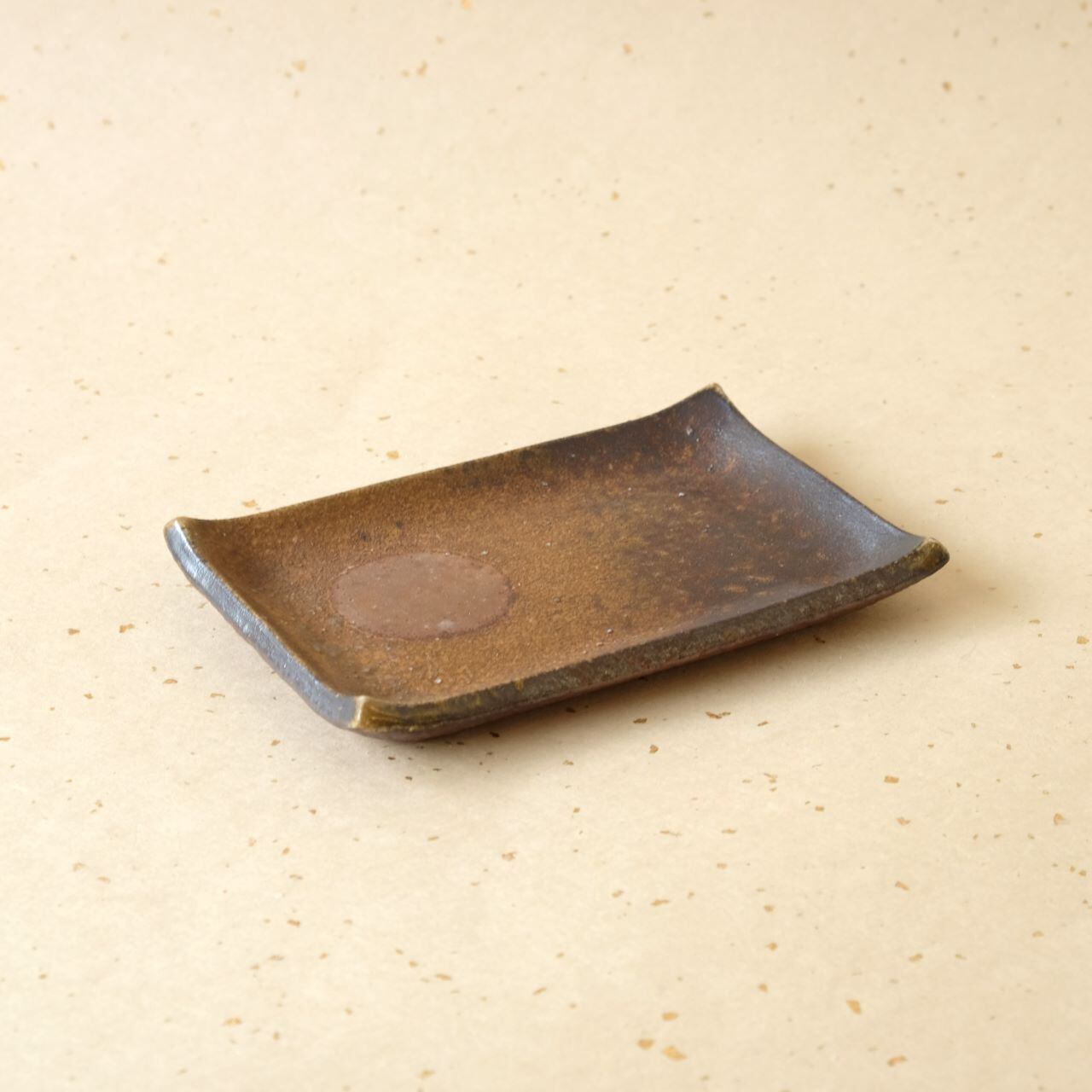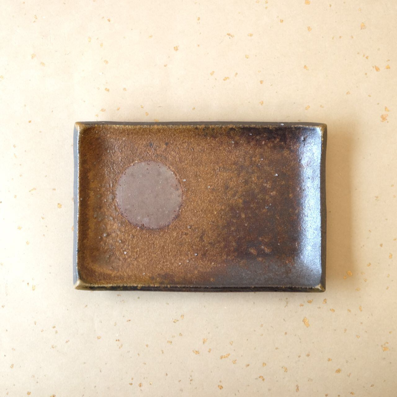 シンプルな長方形のお皿です。縁を軽く曲げているので汁気のあるものでも盛り付けることができます。片面には松割木の灰がかかり、丸い抜け模様(牡丹餅)がアクセントになっています。