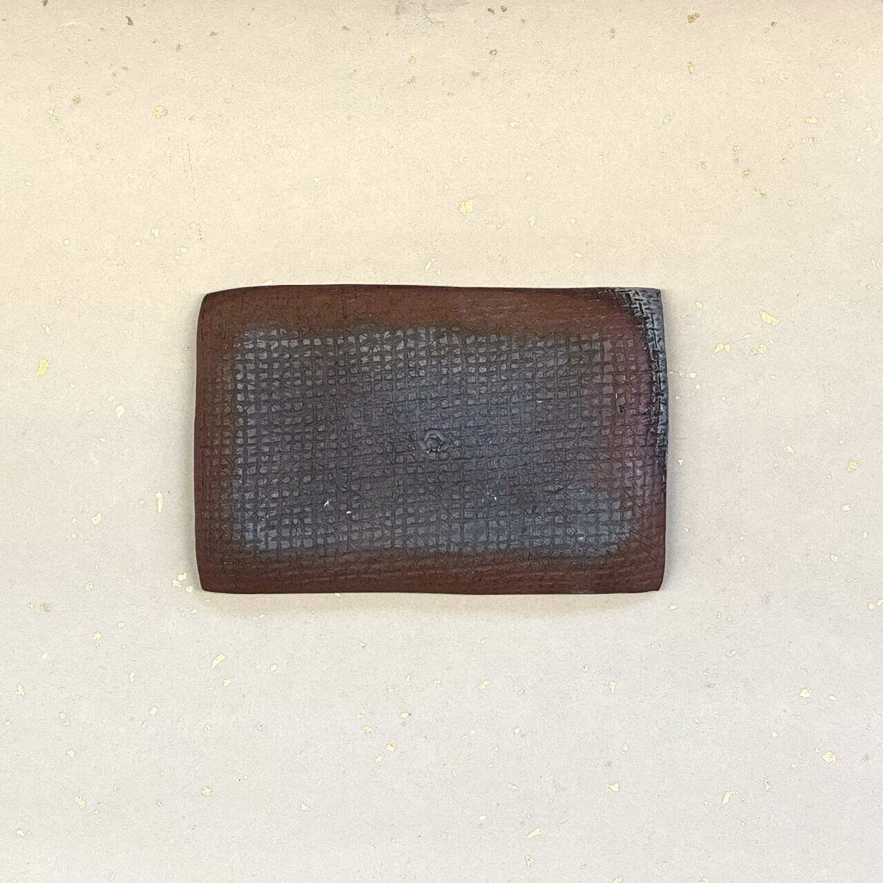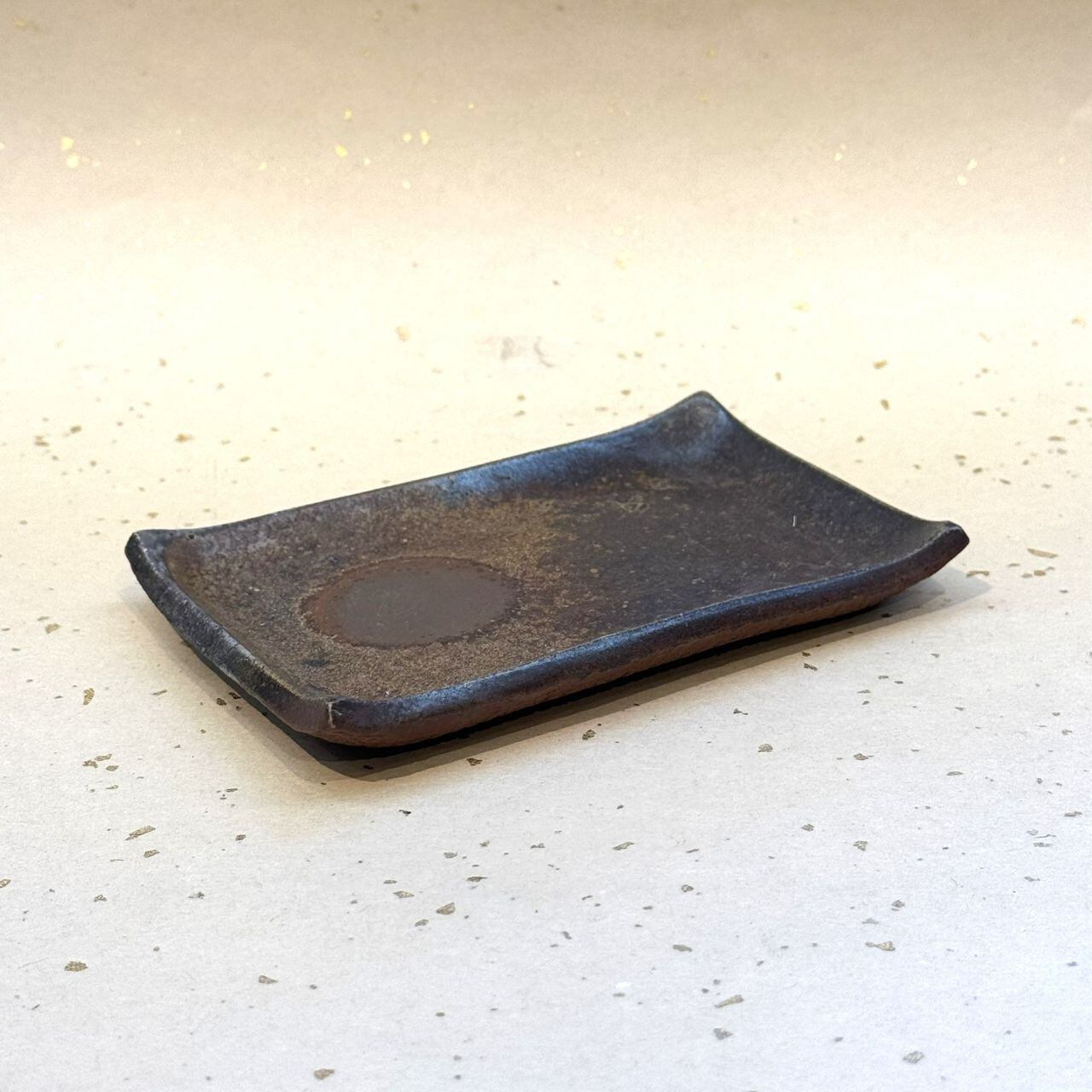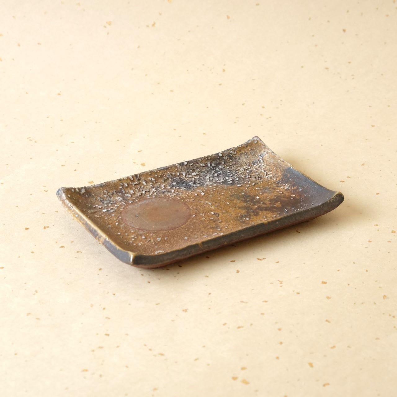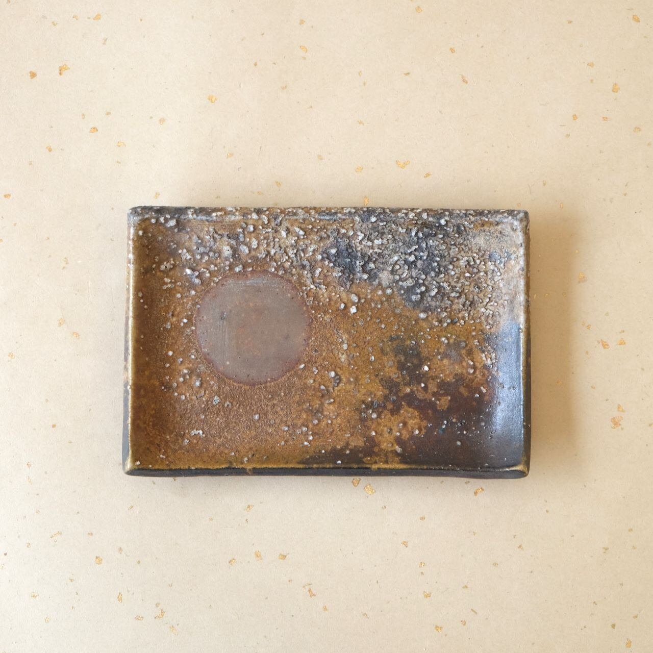 シンプルな長方形のお皿です。縁を軽く曲げているので汁気のあるものでも盛り付けることができます。片面には松割木の灰がかかり、丸い抜け模様(牡丹餅)がアクセントになっています。