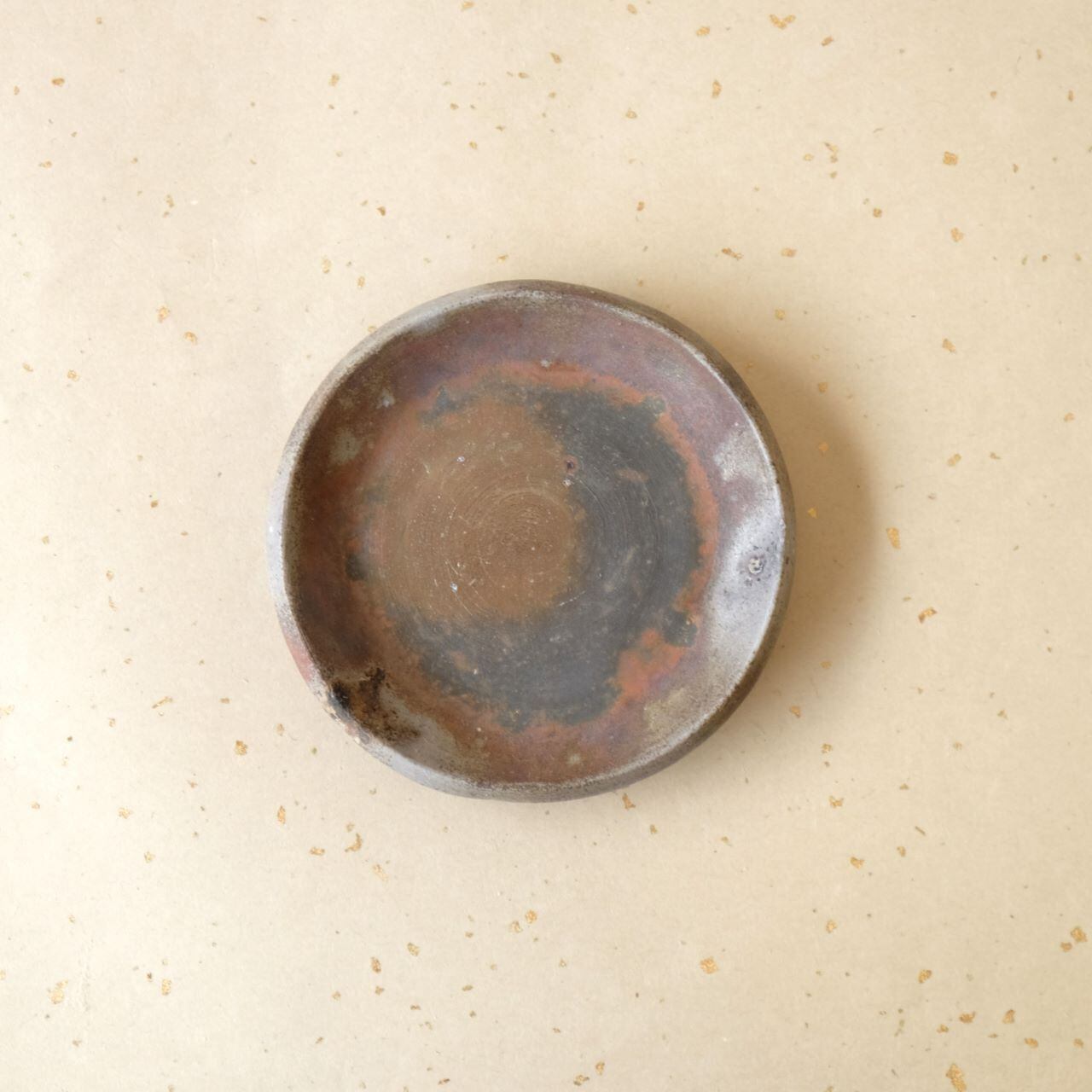 シンプルな丸形の豆皿です。縁を軽く曲げているので汁気のあるものでも盛り付けることができます。木炭とワラの影響を受け、全体的に落ち着いた雰囲気に仕上がっています。