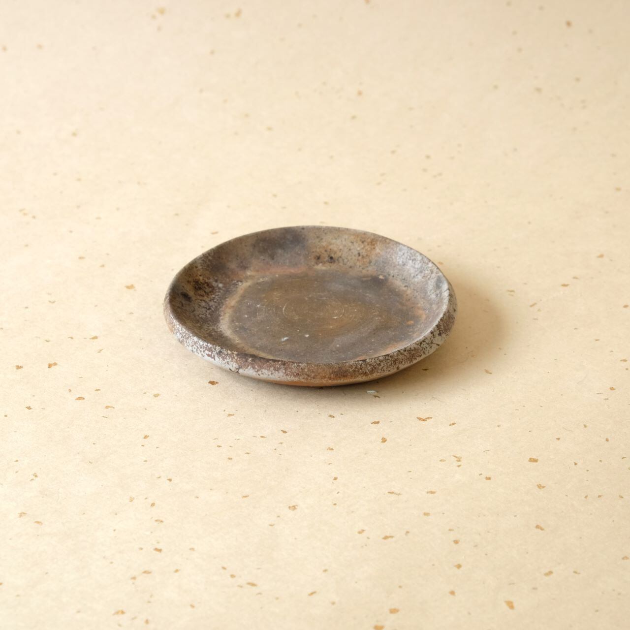 シンプルな丸形の豆皿です。縁を軽く曲げているので汁気のあるものでも盛り付けることができます。木炭とワラの影響を受け、全体的に落ち着いた雰囲気に仕上がっています。