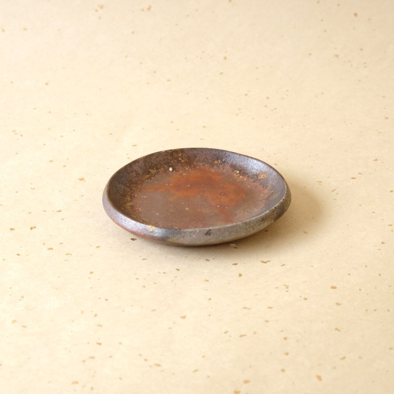 シンプルな丸形の豆皿です。縁を軽く曲げているので汁気のあるものでも盛り付けることができます。木炭とワラの影響を受け、全体的に落ち着いた雰囲気に仕上がっています。