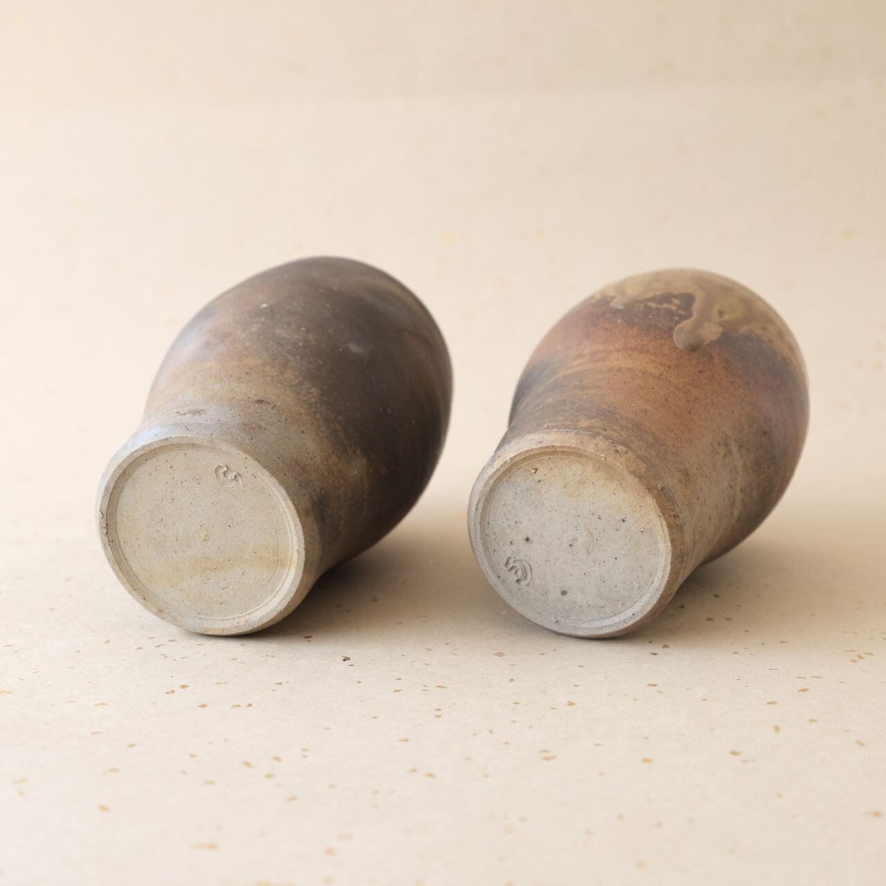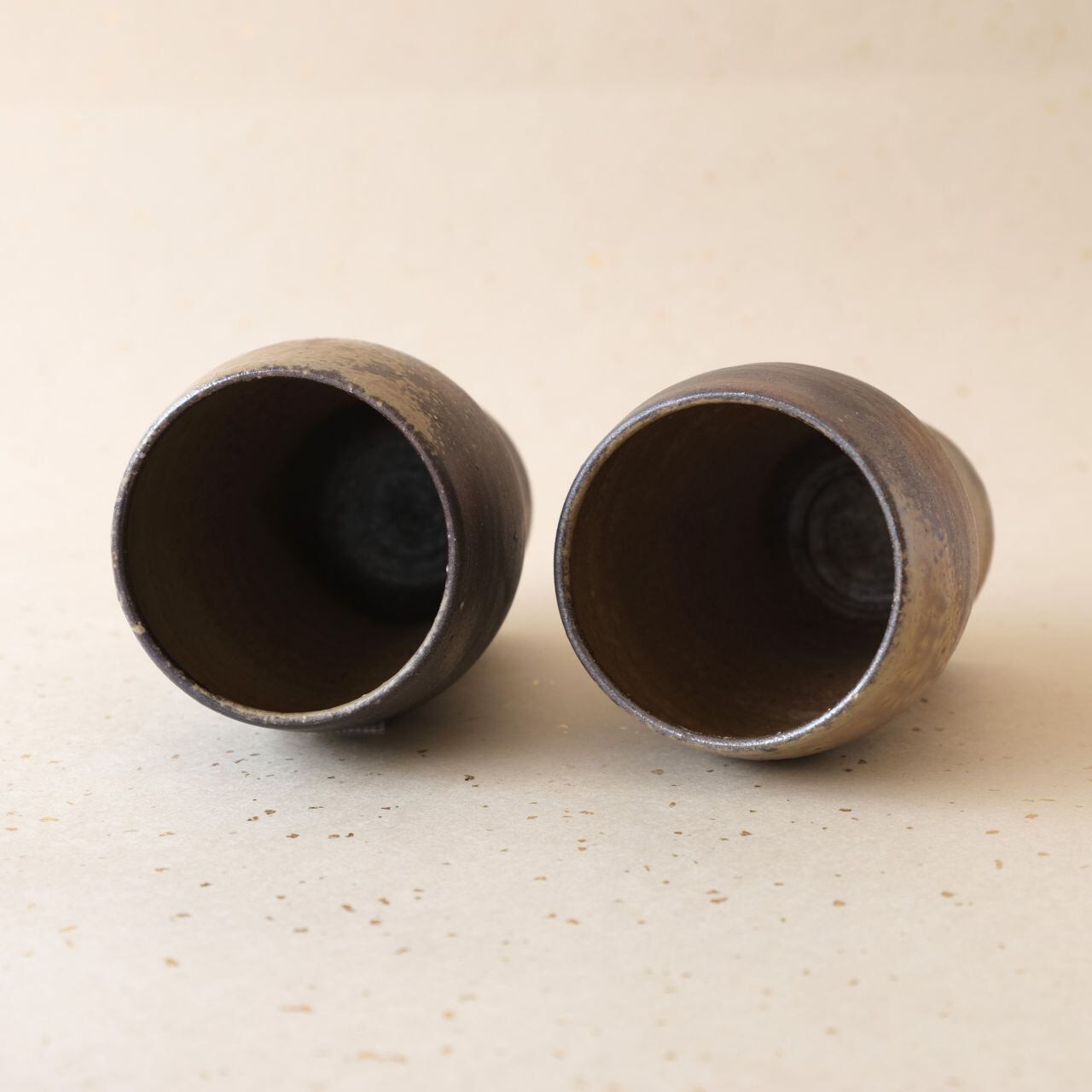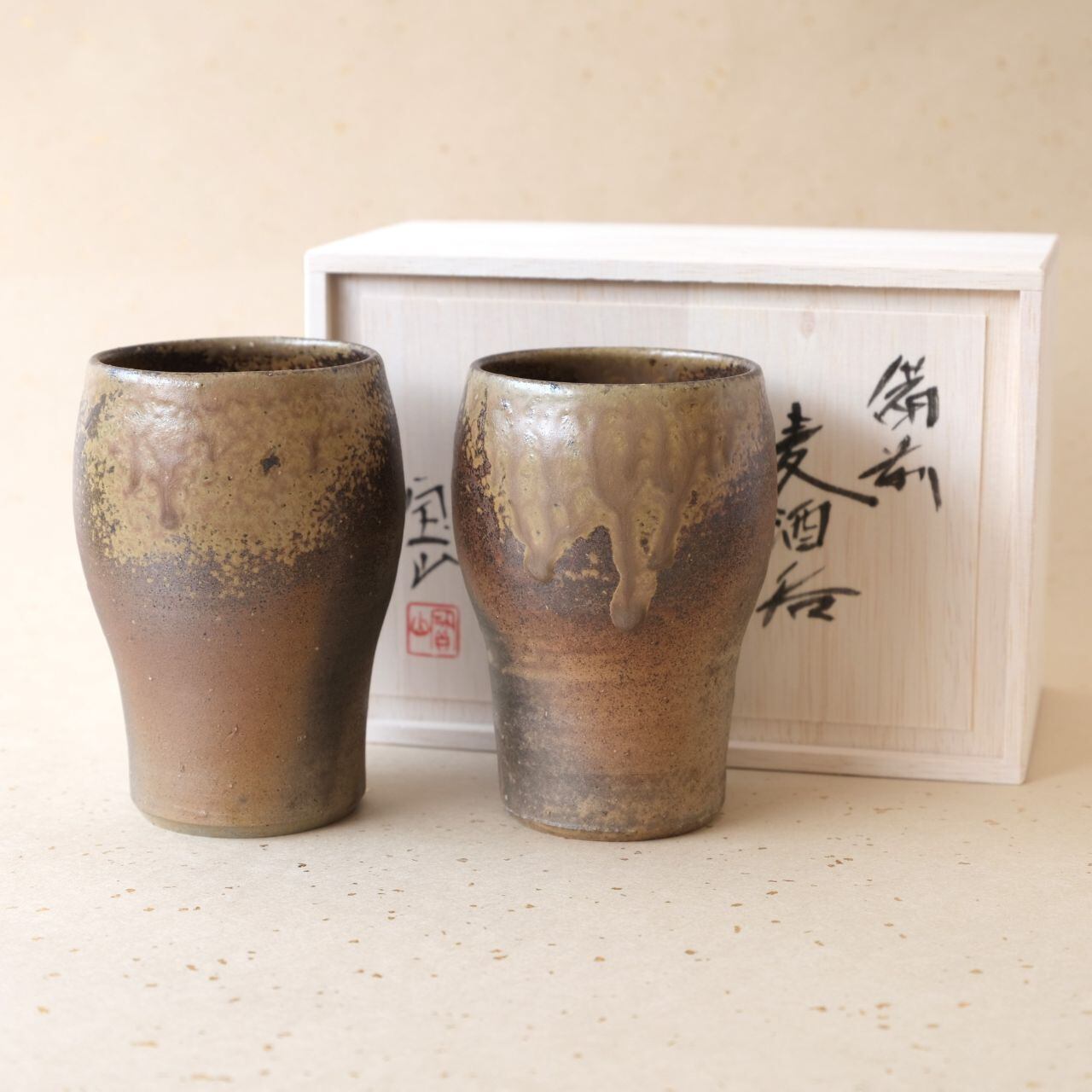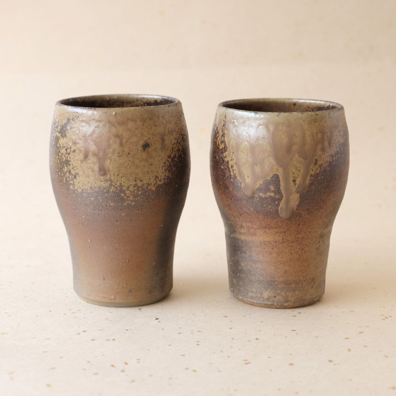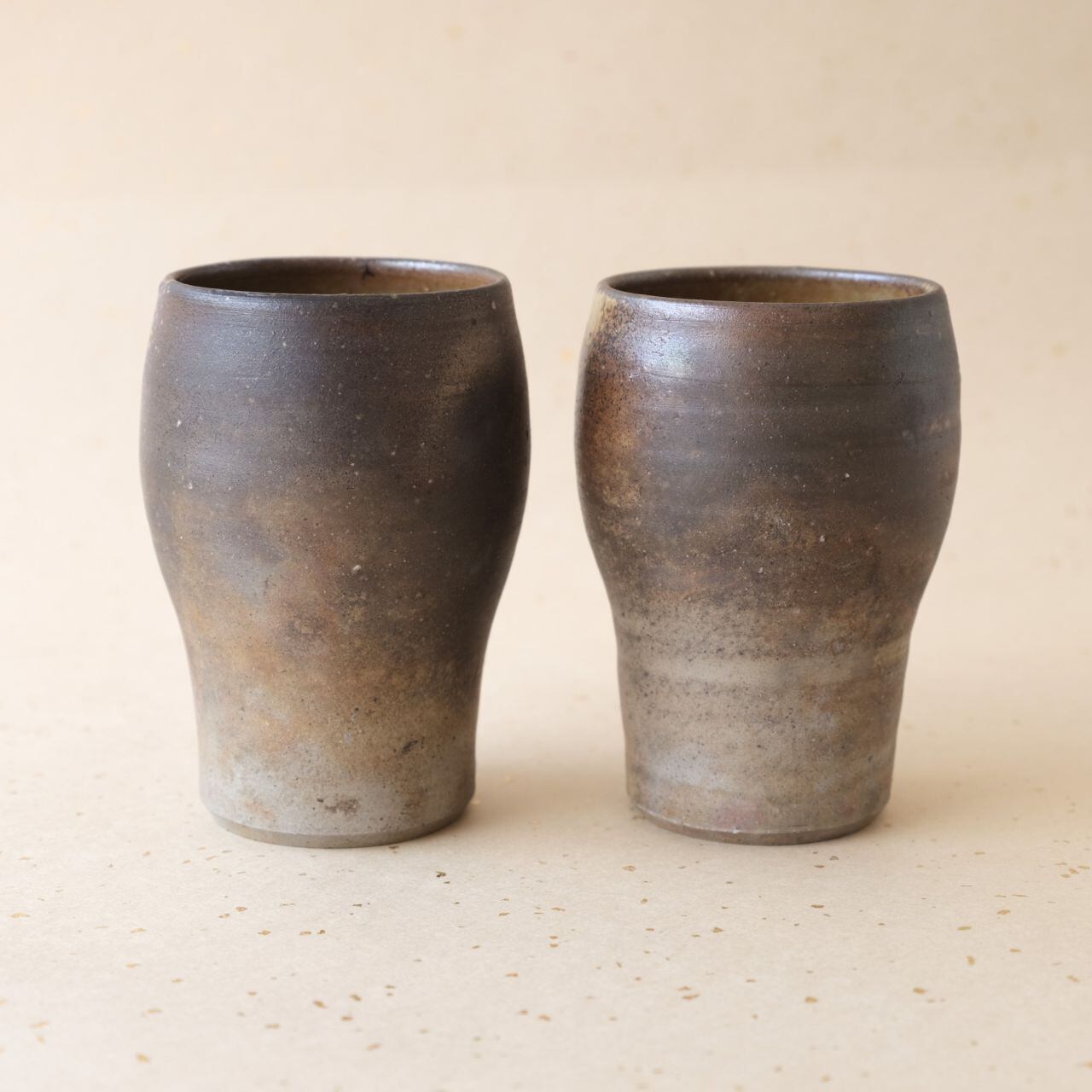 丸みおびたデザインのビアマグセットです。ビールが美味しくいただけると言われています。松割木の灰が付着した面と木炭のガスの作用により変化が出た面の両面をお楽しみいただけます。