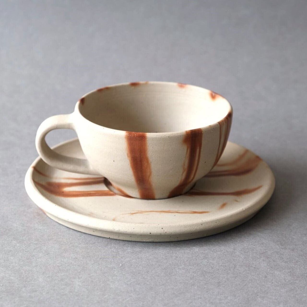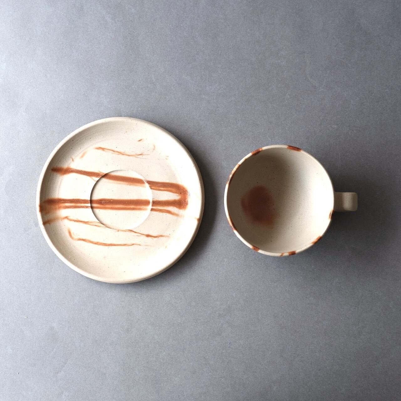 やや大きめのコーヒーカップです。紅茶碗としても使っていただけます。うつわの側面にワラを巻いた部分が赤く発色し、柔らかい雰囲気となっています。