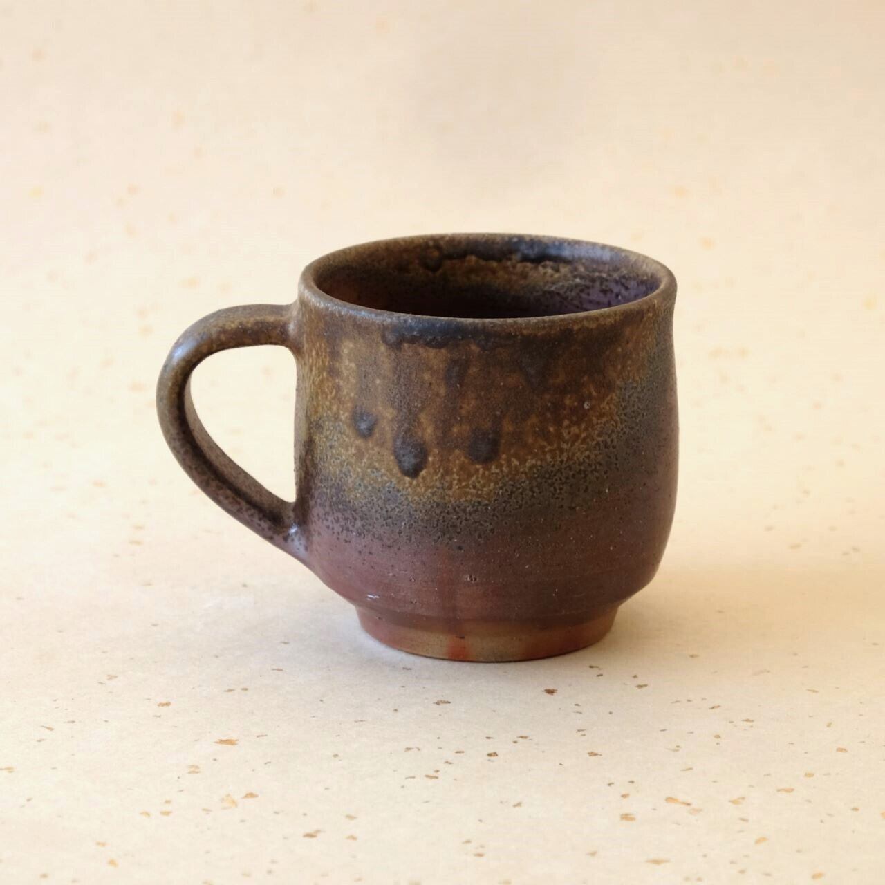 標準サイズのコーヒーカップです。コーヒーの苦味を和らげてくれると言われています。うつわの側面には、燃料の松割木の灰が付着し、黄味がかった色合いが現れています。