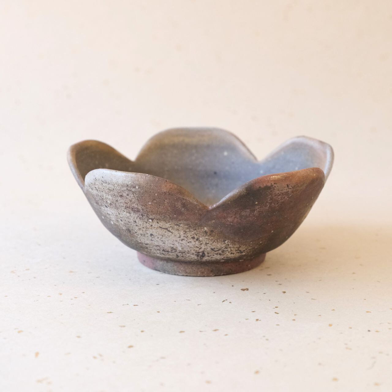 縁を花形にカッティングした小鉢です。サラダや煮物などを盛るうつわとして使っていただけます。木炭から発生するガスの影響などを受け、内外に多彩な変化が生まれています。