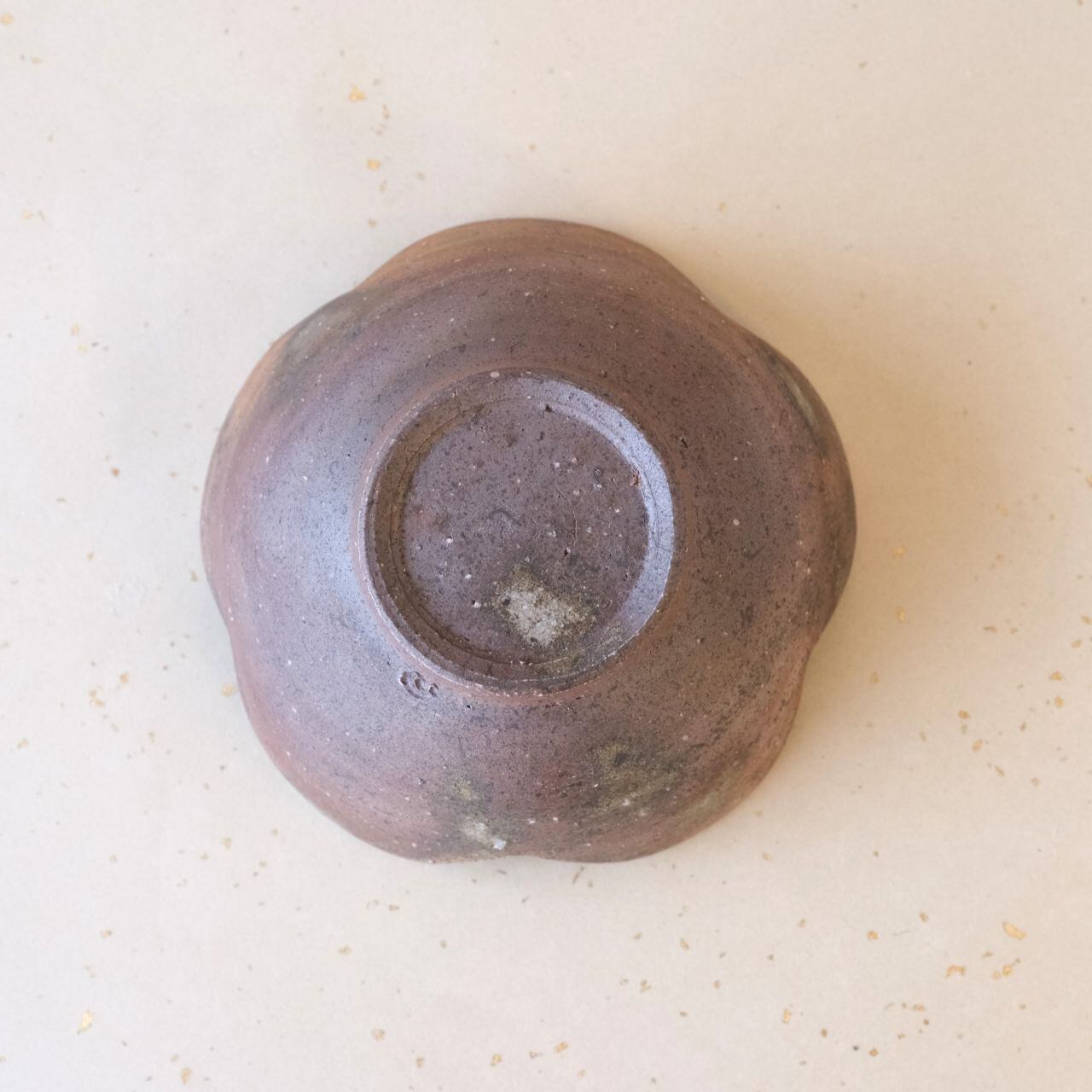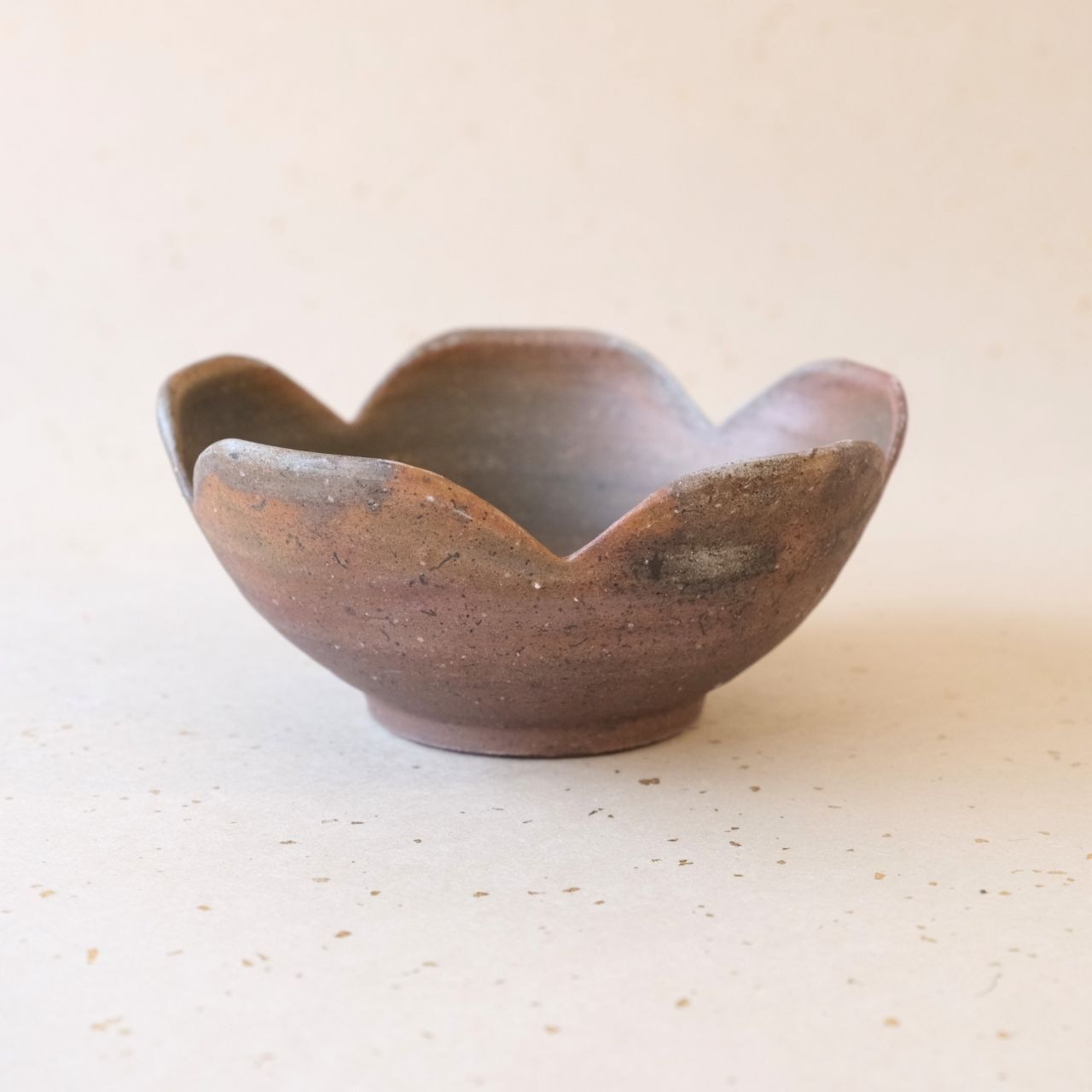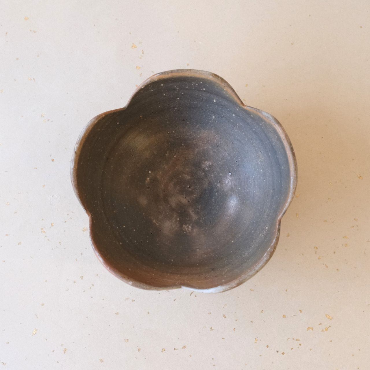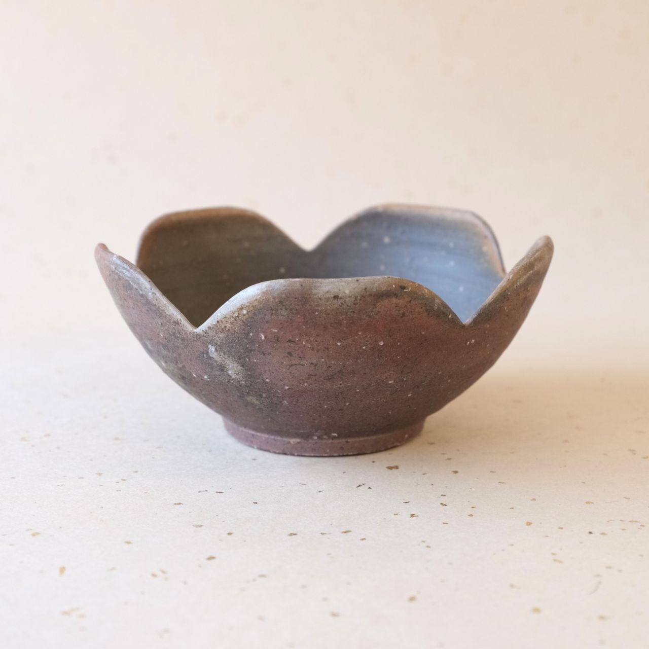 縁を花形にカッティングした小鉢です。サラダや煮物などを盛るうつわとして使っていただけます。木炭から発生するガスの影響などを受け、内外に多彩な変化が生まれています。