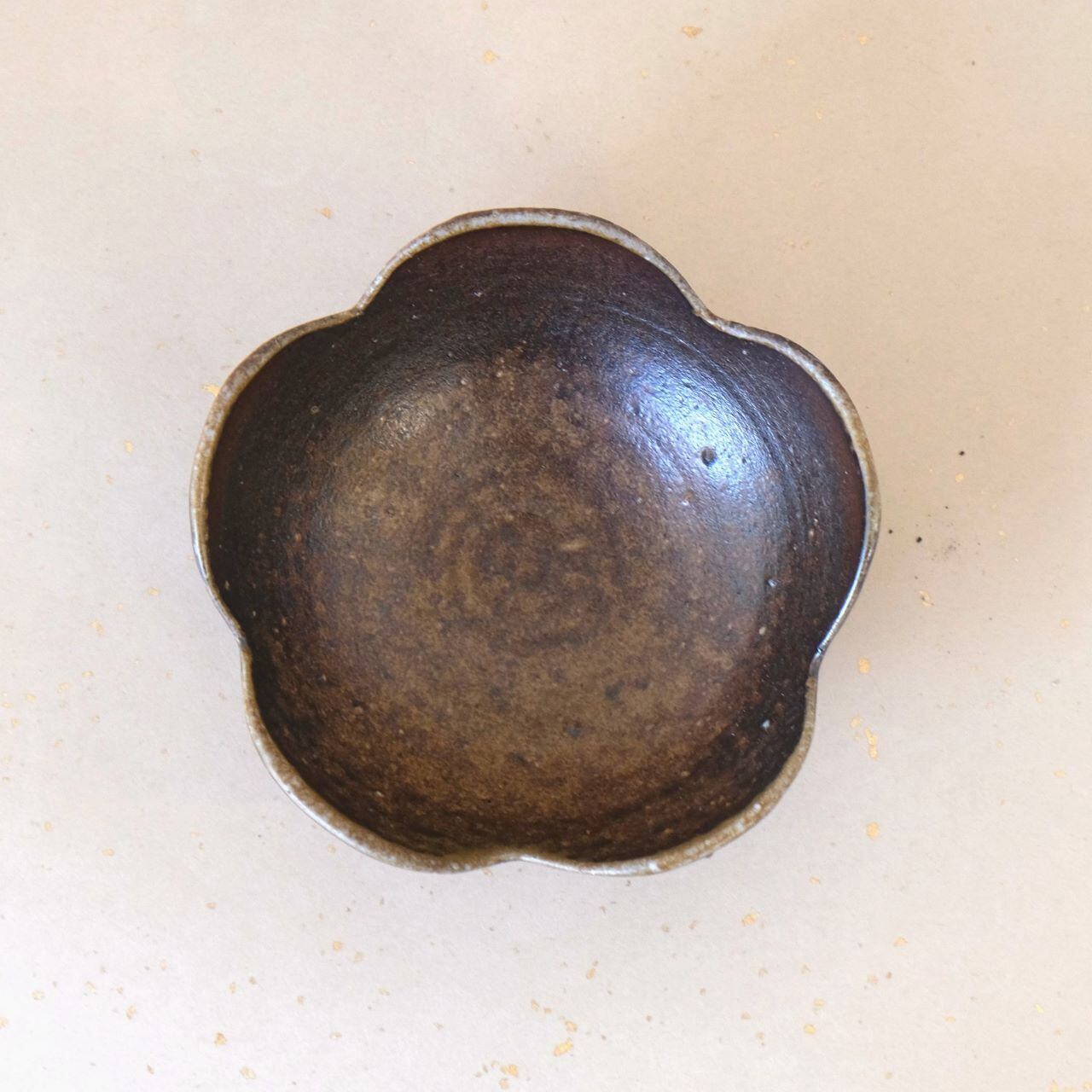 縁を花形にカッティングした小鉢です。サラダや煮物などを盛るうつわとして使っていただけます。燃料の松割木の灰が降りかかった部分には胡麻(ごま)という変化がうかがえます。