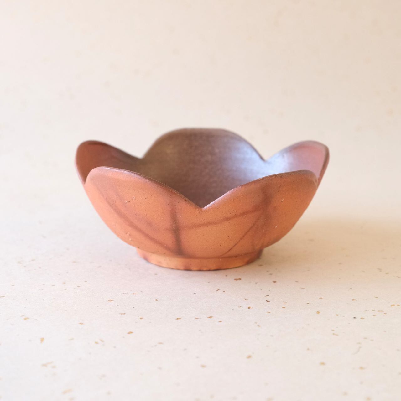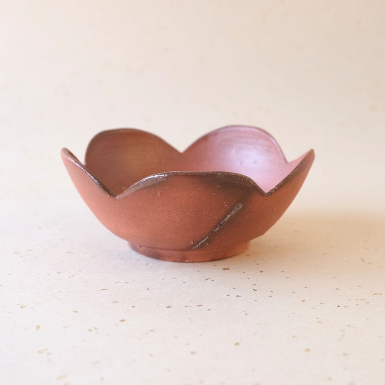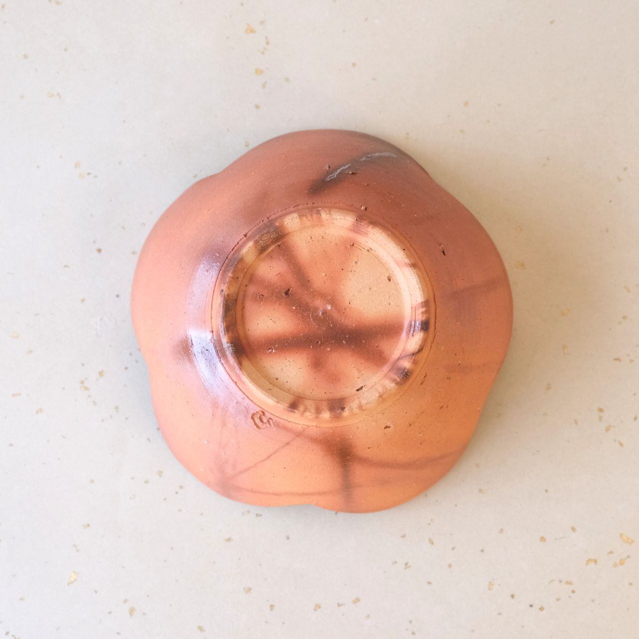 縁を花形にカッティングした小鉢です。サラダや煮物などを盛るうつわとして使っていただけます。ワラを巻いていた部分が濃い赤色に発色し、景色となっています。
