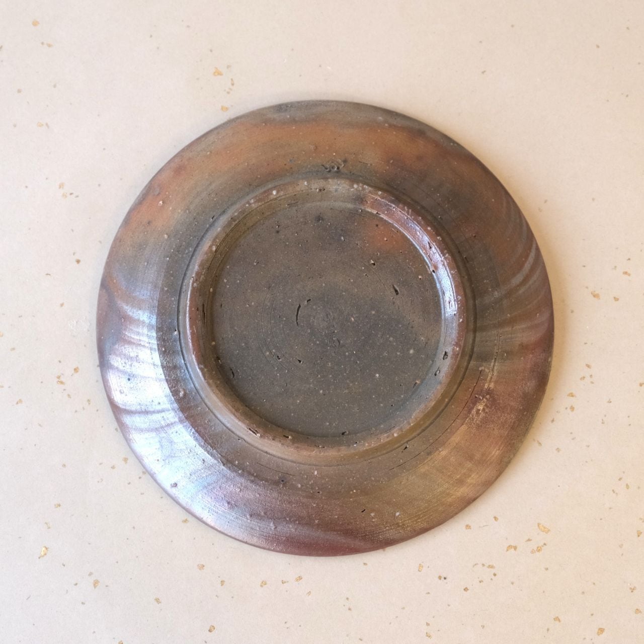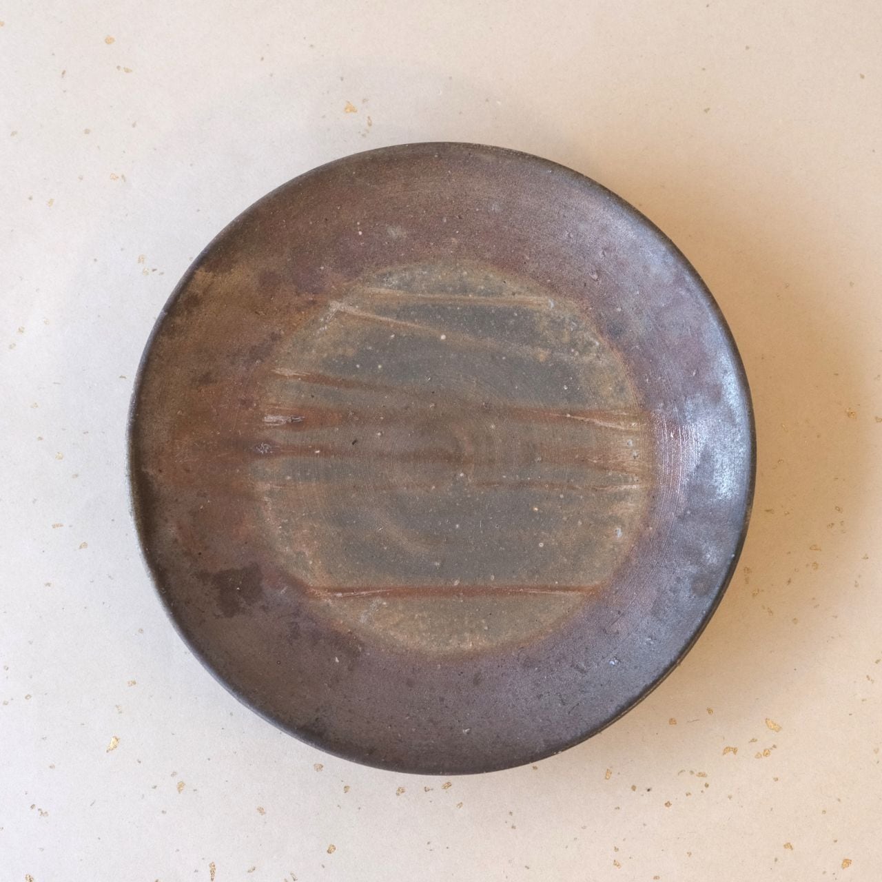 シンプルな丸形のお皿です。木炭とワラの影響を受け、全体的に落ち着いた雰囲気に仕上がっています。