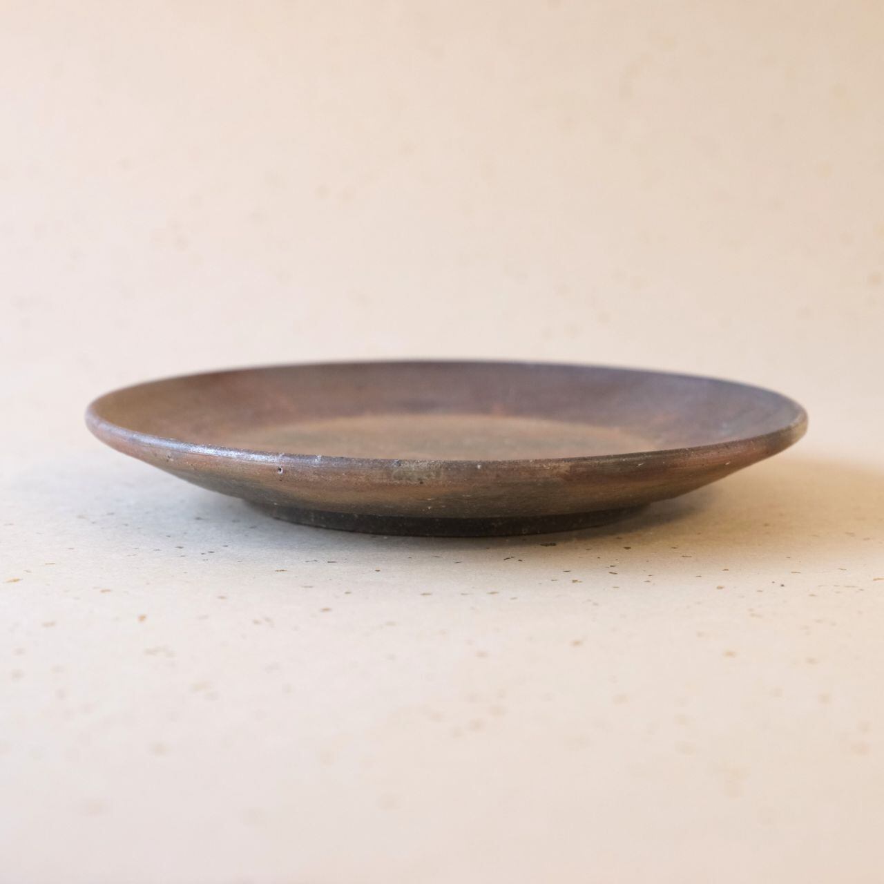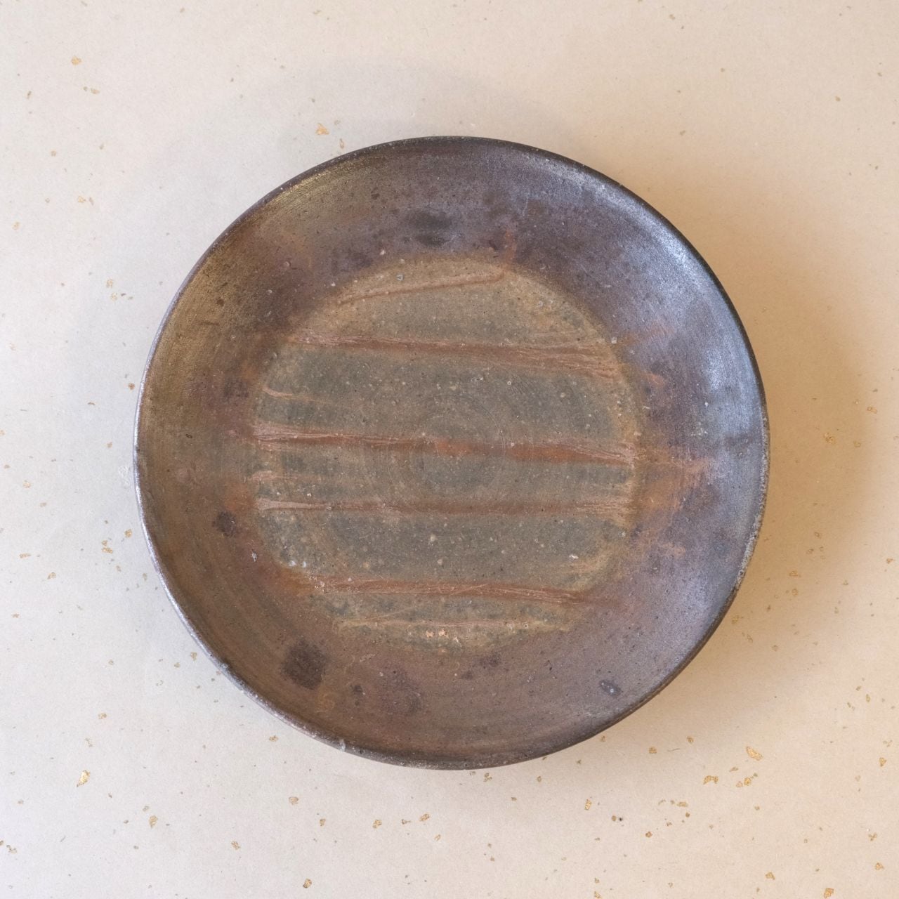 シンプルな丸形のお皿です。木炭とワラの影響を受け、全体的に落ち着いた雰囲気に仕上がっています。