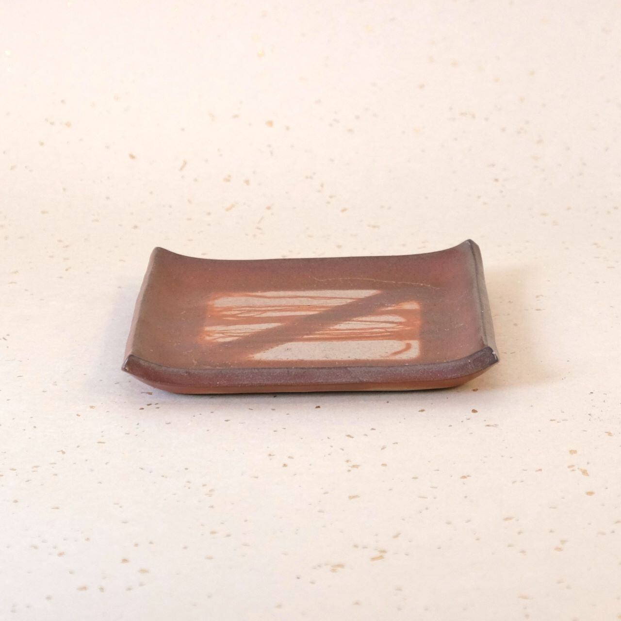 シンプルな正方形のお皿です。縁を軽く曲げているので汁気のあるものでも盛り付けることができます。登り窯焼成の緋襷模様が綺麗に発色しています。