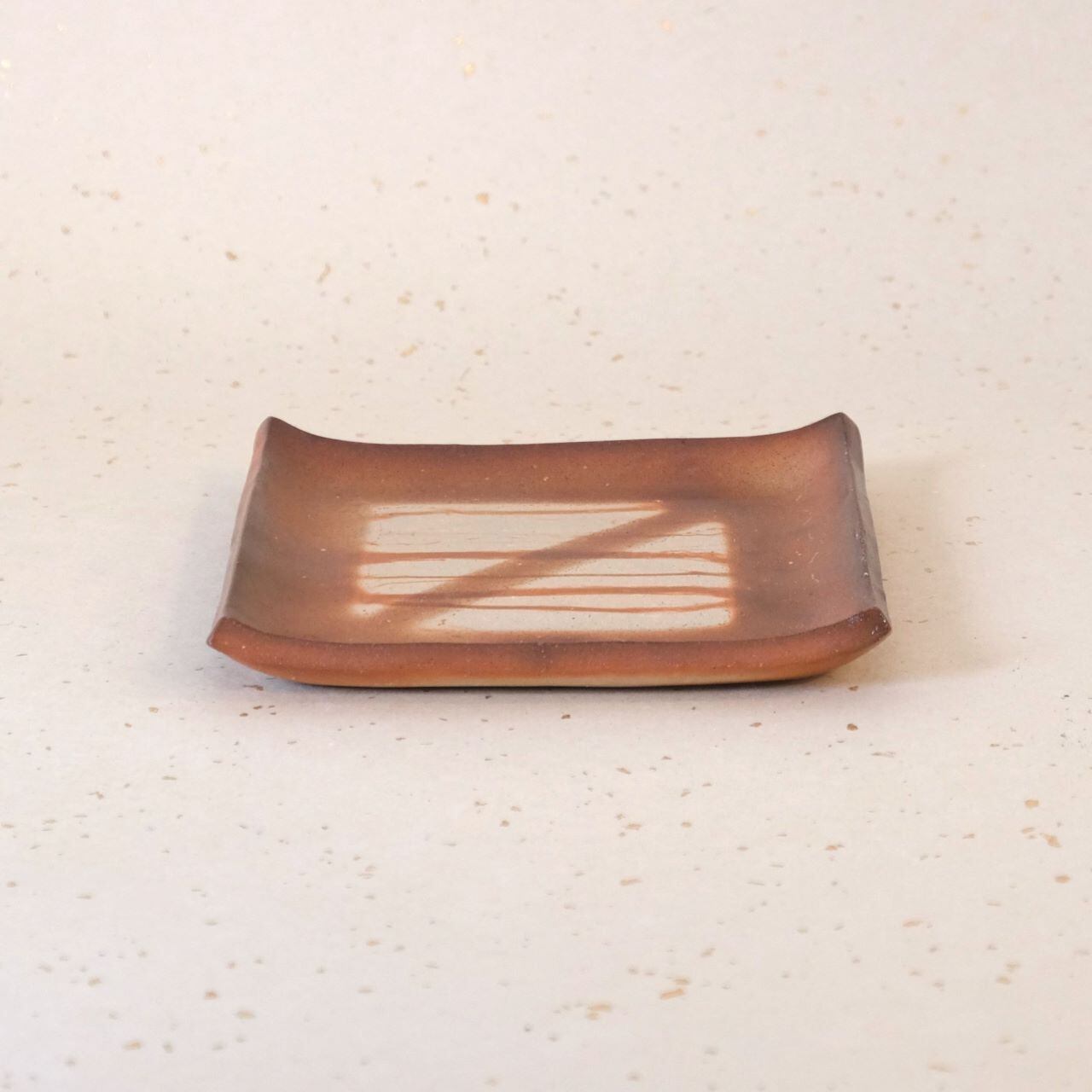 シンプルな正方形のお皿です。縁を軽く曲げているので汁気のあるものでも盛り付けることができます。登り窯焼成の緋襷模様が綺麗に発色しています。