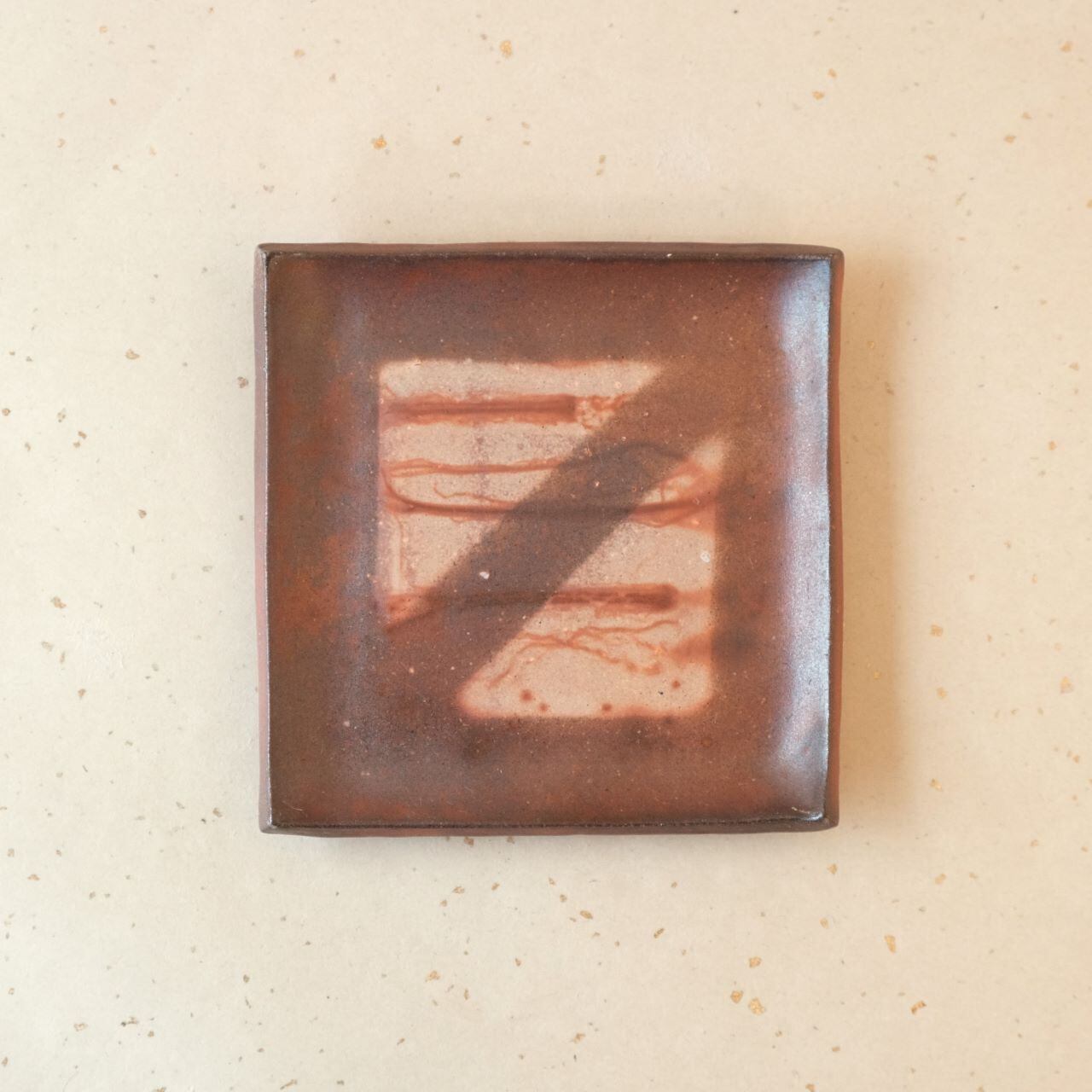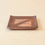 シンプルな正方形のお皿です。縁を軽く曲げているので汁気のあるものでも盛り付けることができます。登り窯焼成の緋襷模様が綺麗に発色しています。