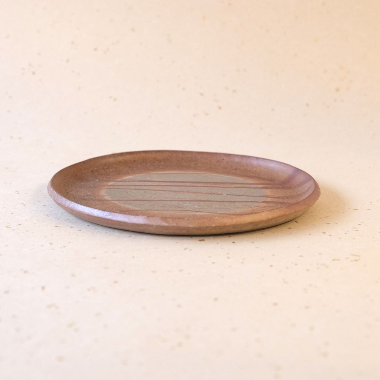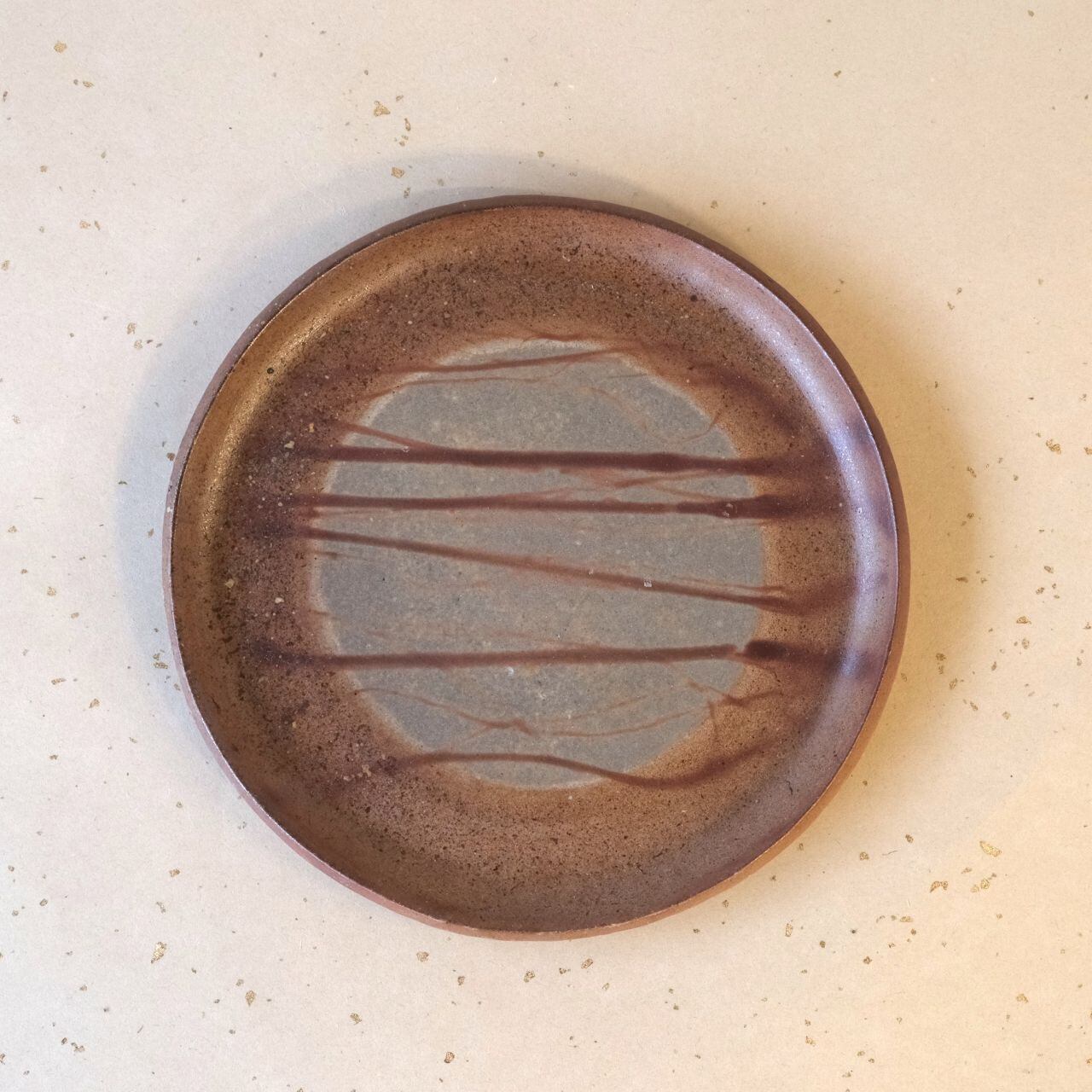 シンプルな丸形のお皿です。縁を軽く曲げているので汁気のあるものでも盛り付けることができます。ワラの接した部分が赤く発色し、明るい雰囲気に仕上がっています。