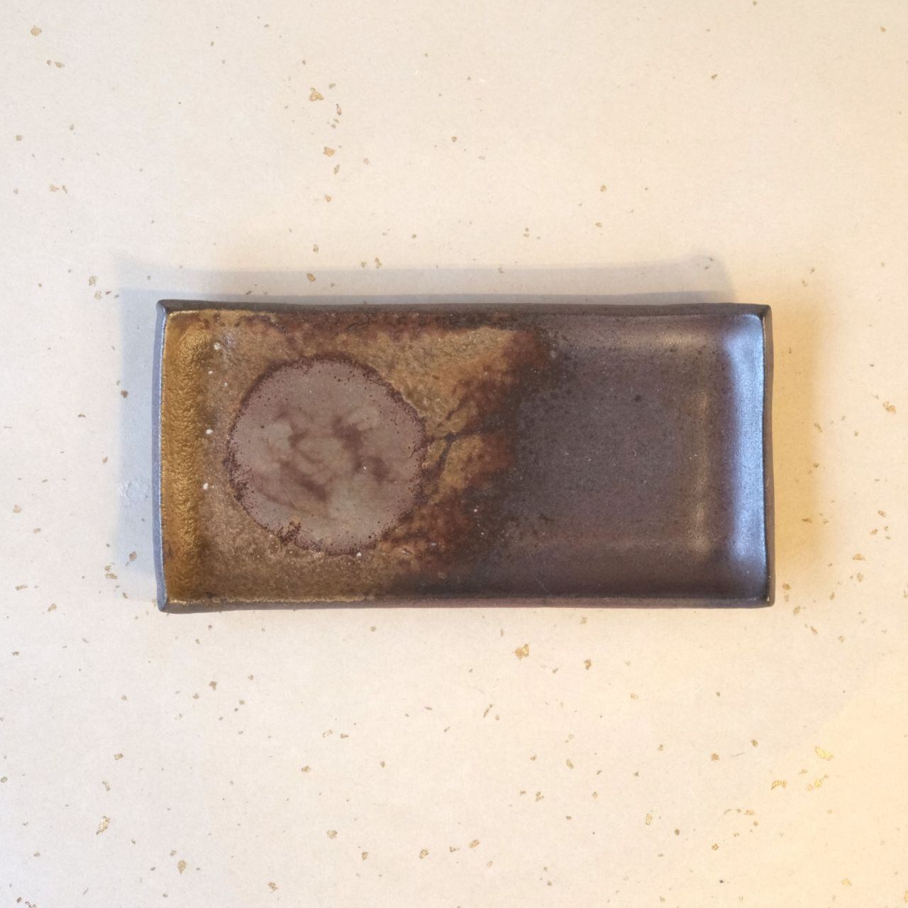 シンプルな長方形のお皿です。縁を軽く曲げているので汁気のあるものでも盛り付けることができます。片面には松割木の灰がかかり、丸い抜け模様(牡丹餅)がアクセントになっています。