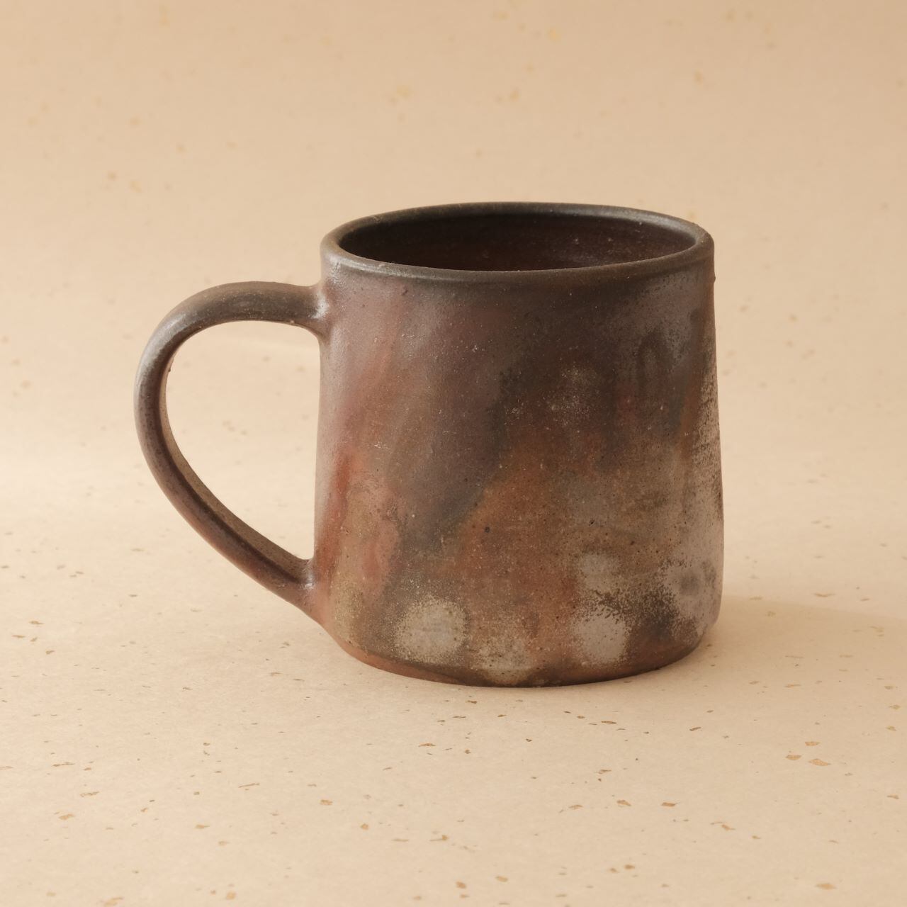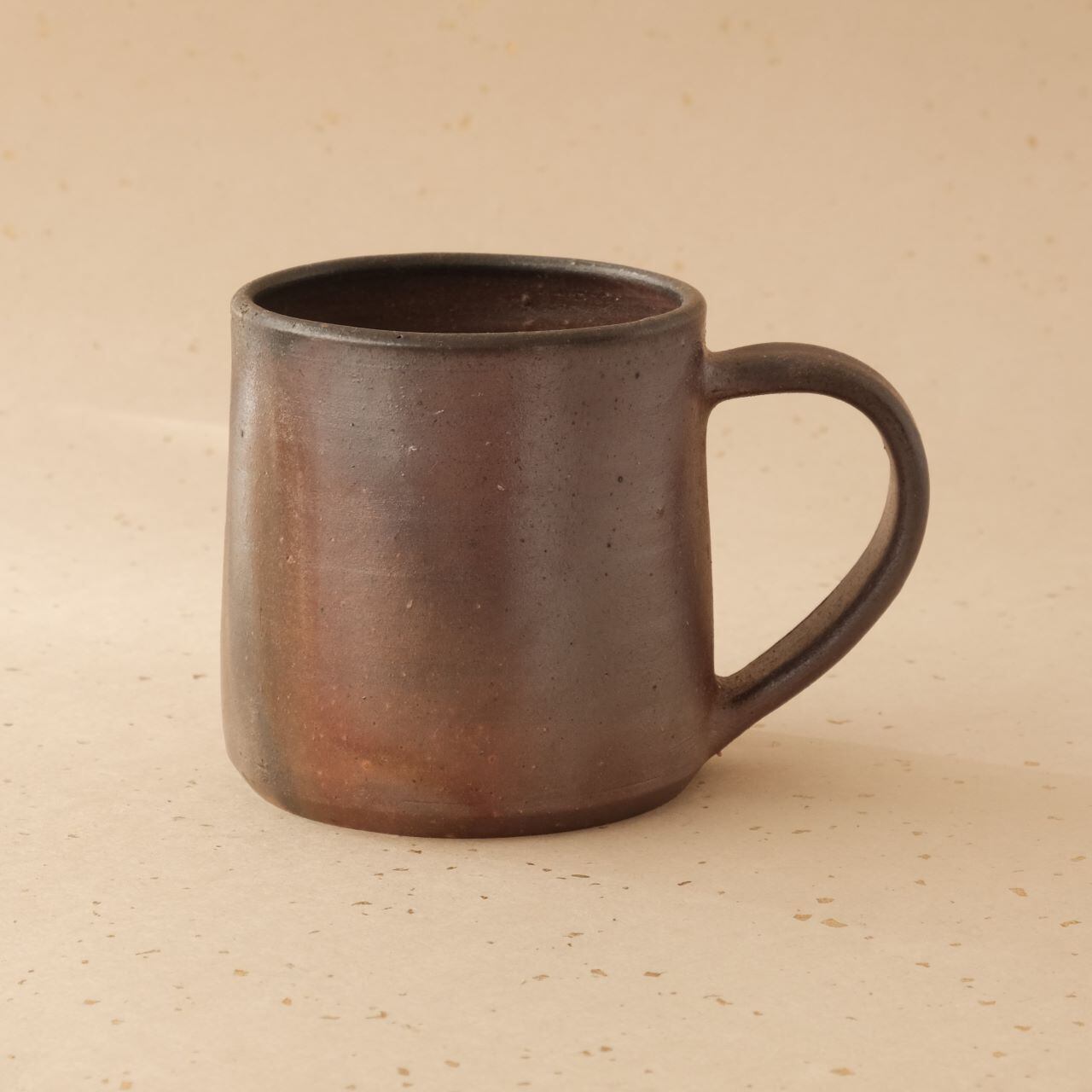 標準サイズのマグです。普段使いとしてもさまざまな用途でご使用いただけます。うつわの側面には、木炭のガスの作用により、青味がかった色合いが現れています。