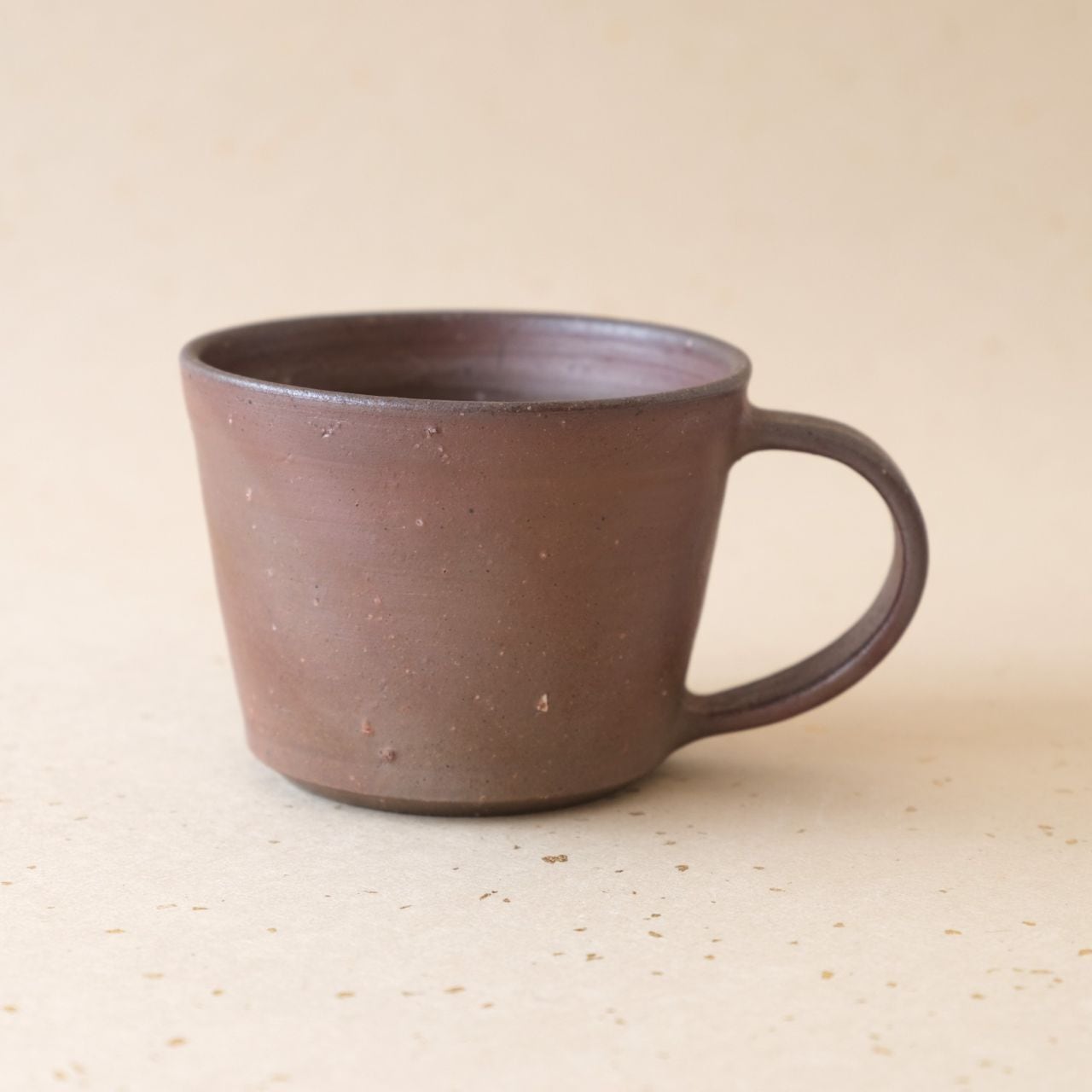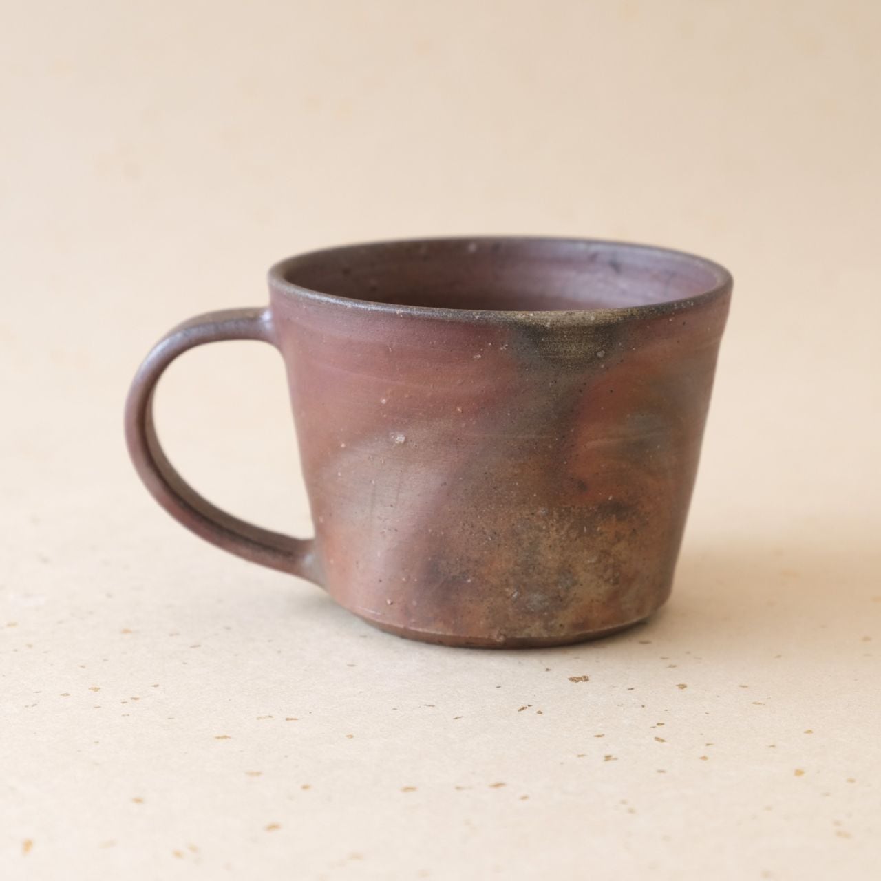 筒形のコーヒーカップです。コーヒーの苦味を和らげてくれると言われています。うつわの側面には、木炭のガスの作用により、さまざまな景色が現れています。