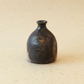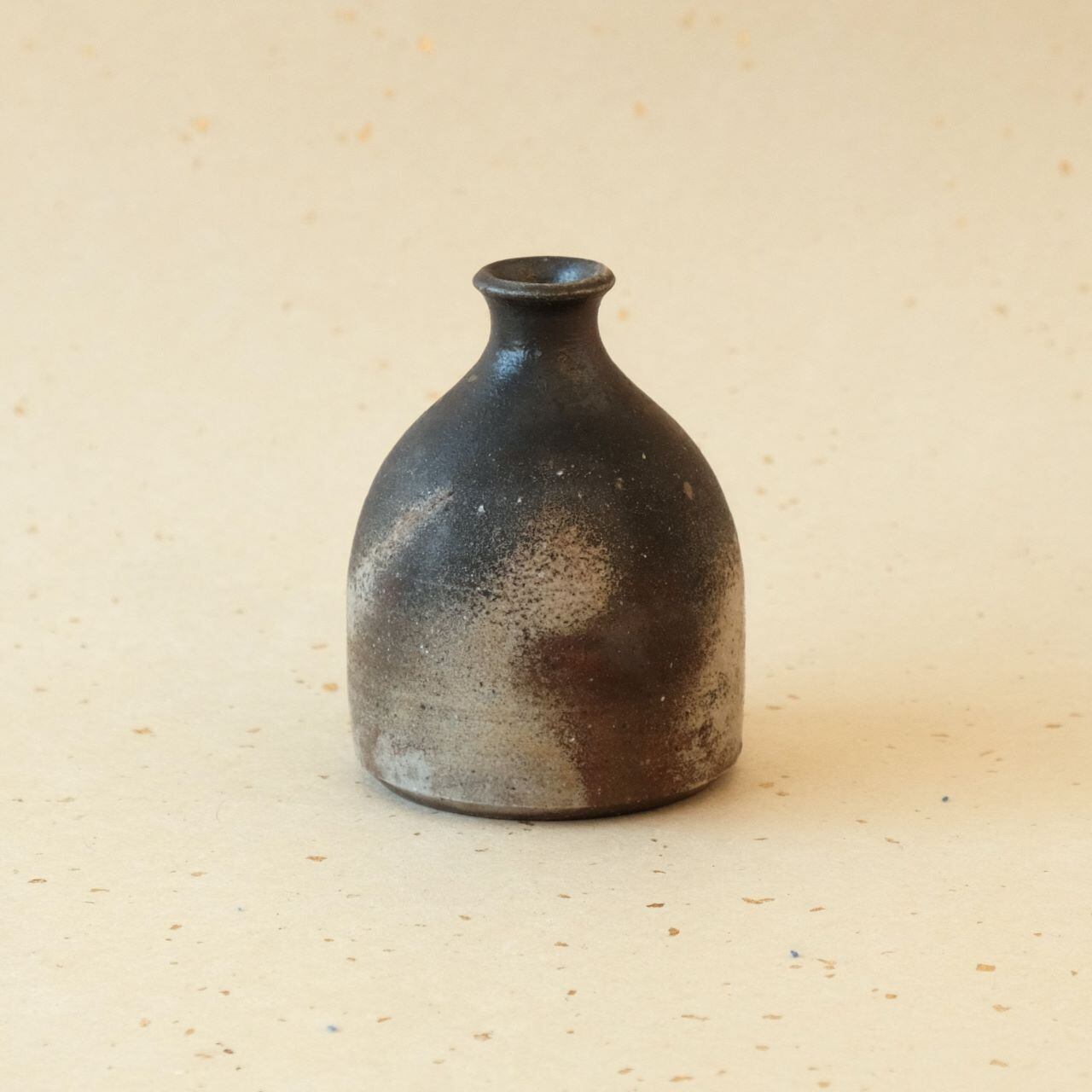一輪花入などに使っていただける小さな徳利です。窯の火を止める直前に、作品の周りへ木炭を振りかけることにより、ガスの作用を受け、青みがかった表情が生まれています。