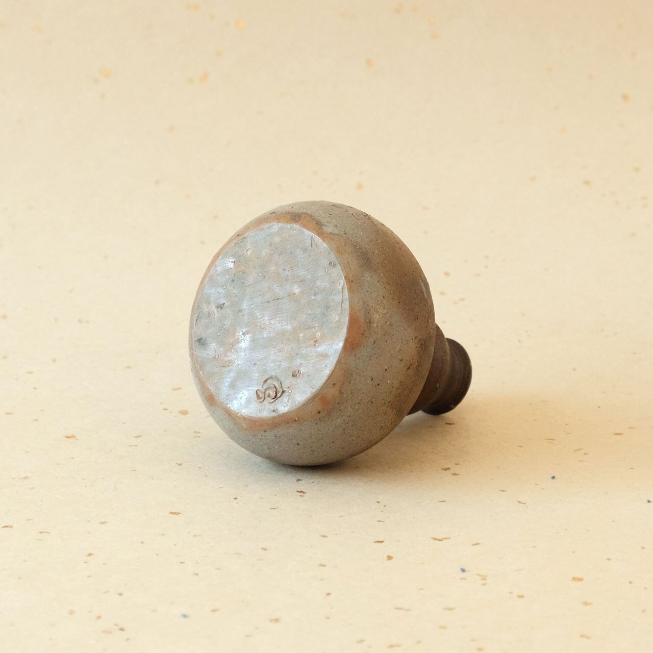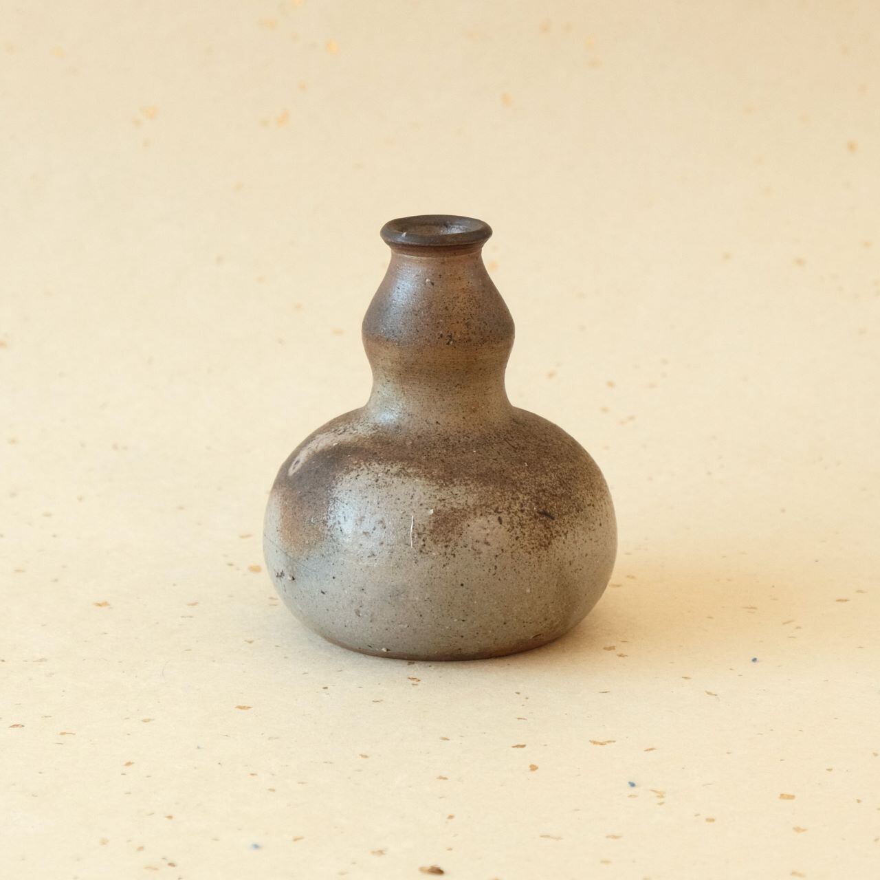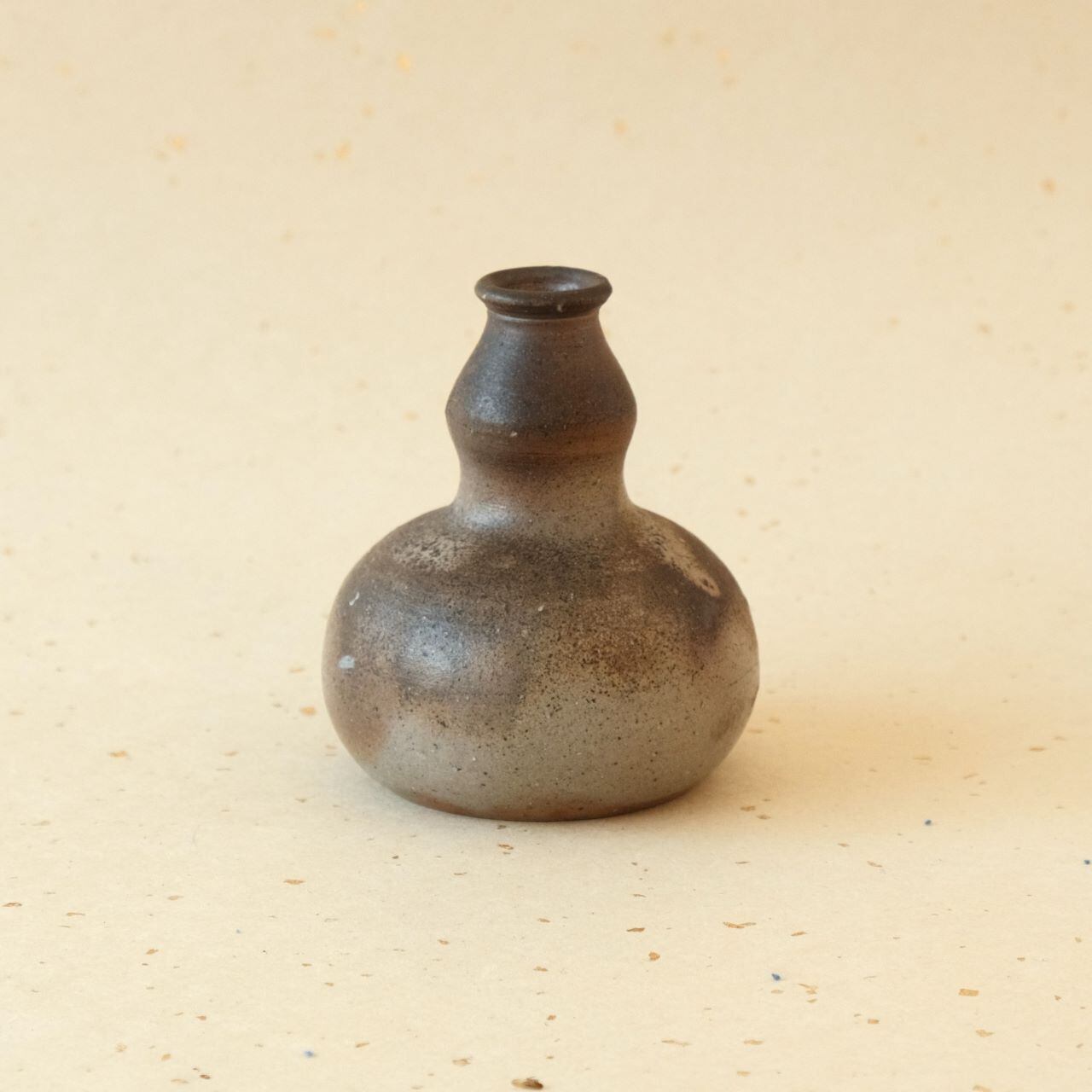 一輪花入などに使っていただける小さな徳利です。窯の火を止める直前に、作品の周りへ木炭を振りかけることにより、ガスの作用を受け、青みがかった表情が生まれています。