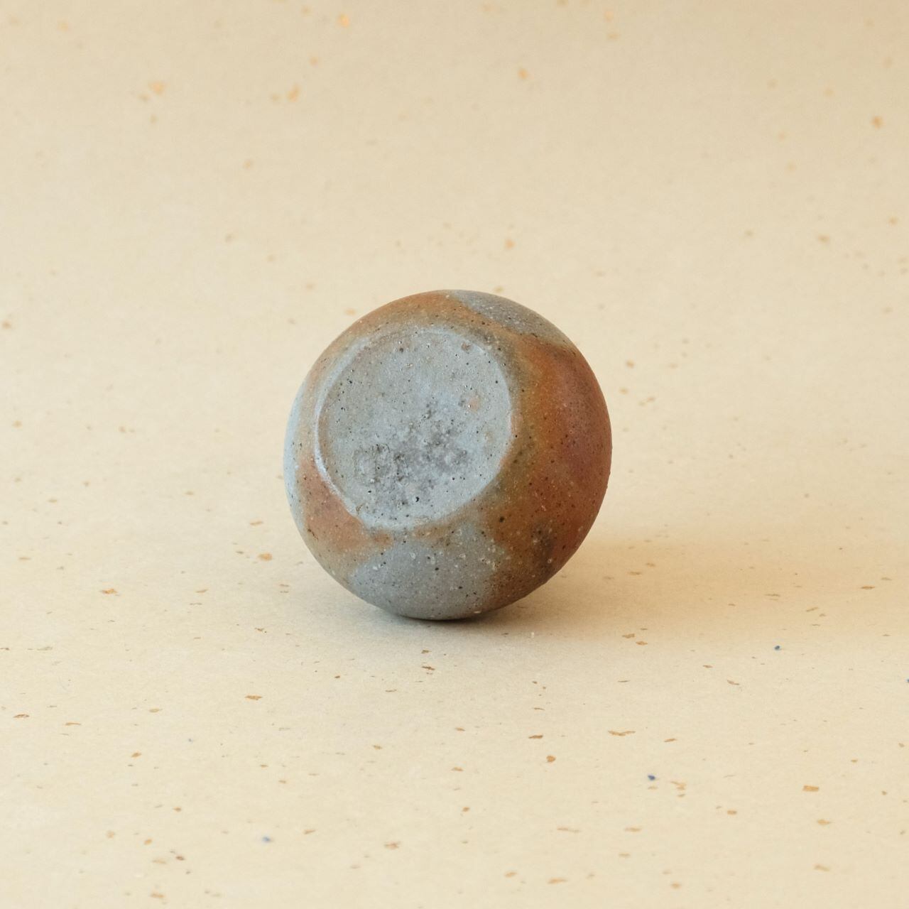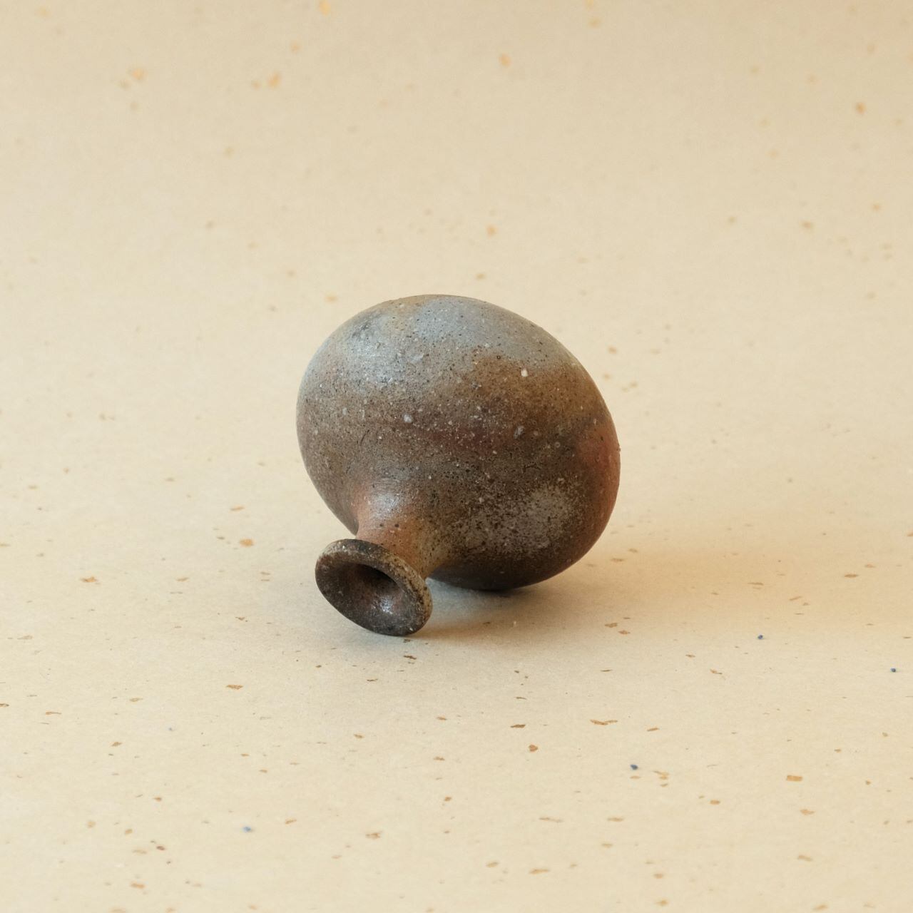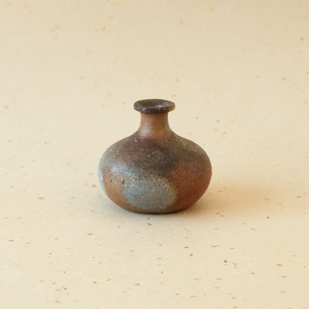 一輪花入などに使っていただける小さな徳利です。窯の火を止める直前に、作品の周りへ木炭を振りかけることにより、ガスの作用を受け、青みがかった表情が生まれています。