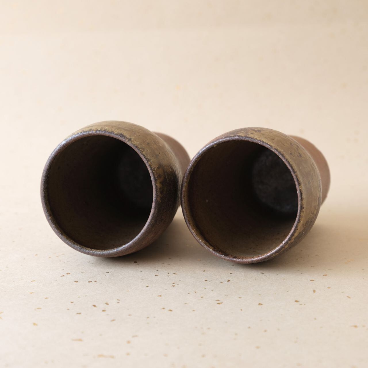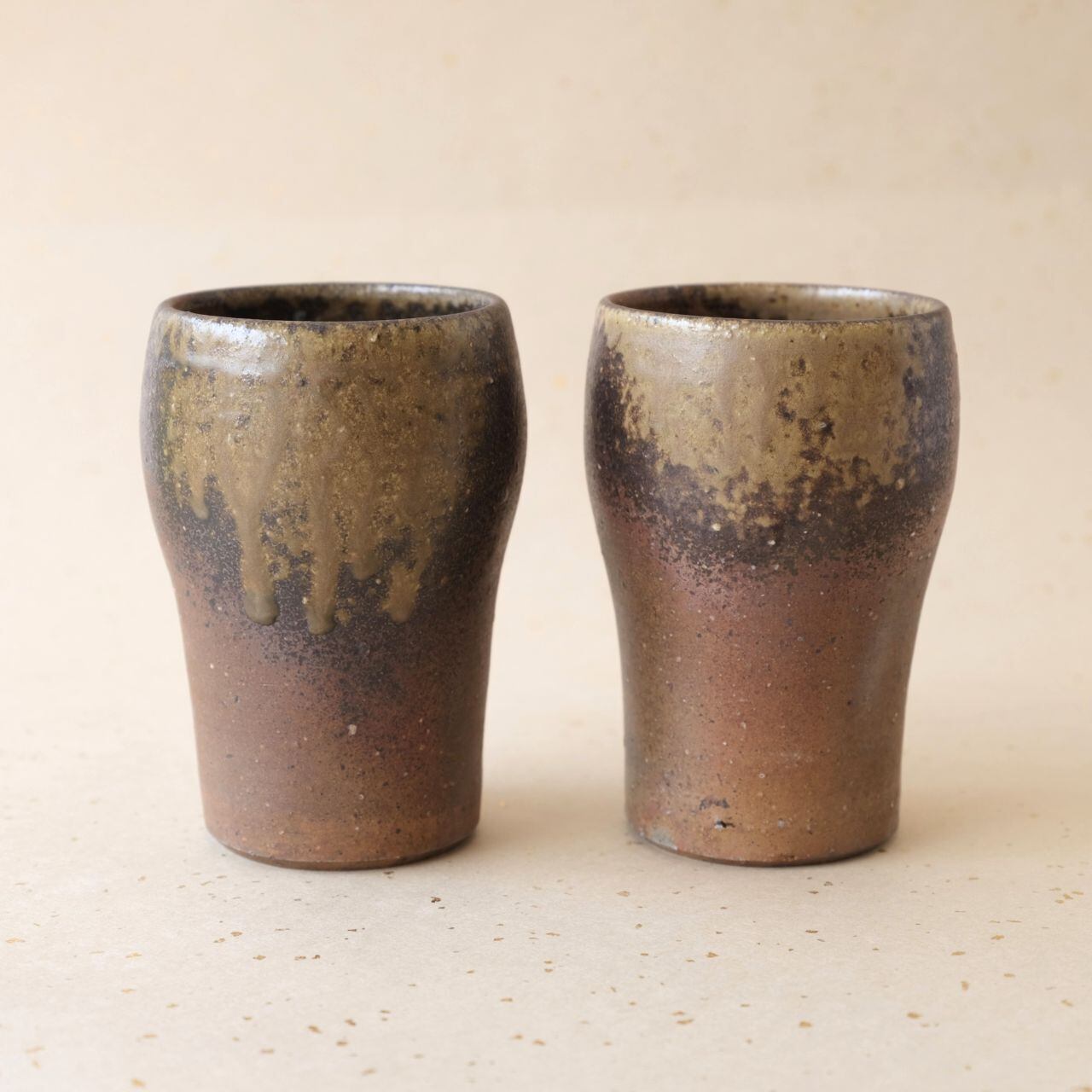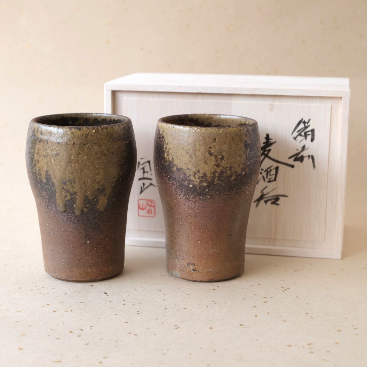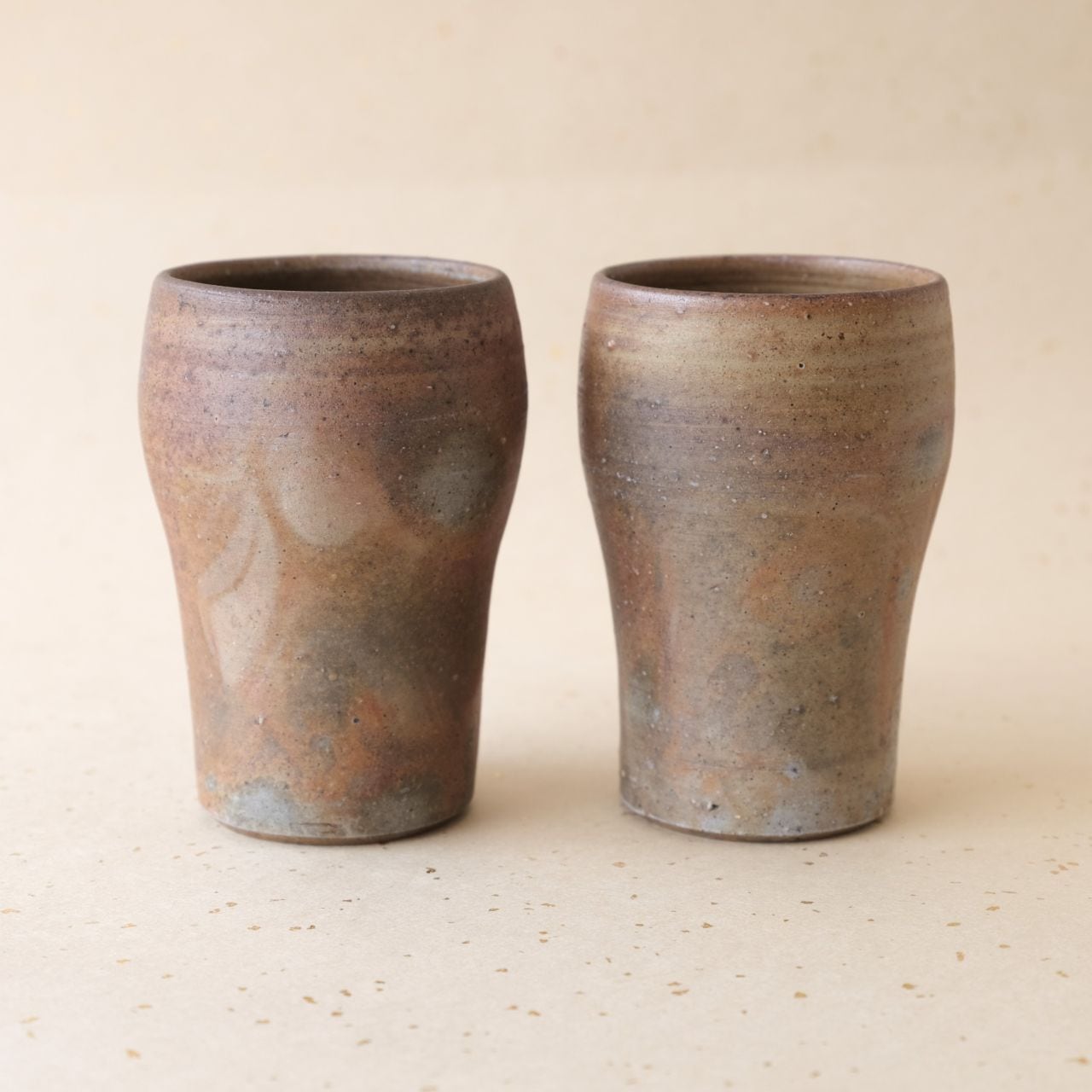 丸みおびたデザインのビアマグセットです。ビールが美味しくいただけると言われています。松割木の灰が付着した面と木炭のガスの作用により変化が出た面の両面をお楽しみいただけます。