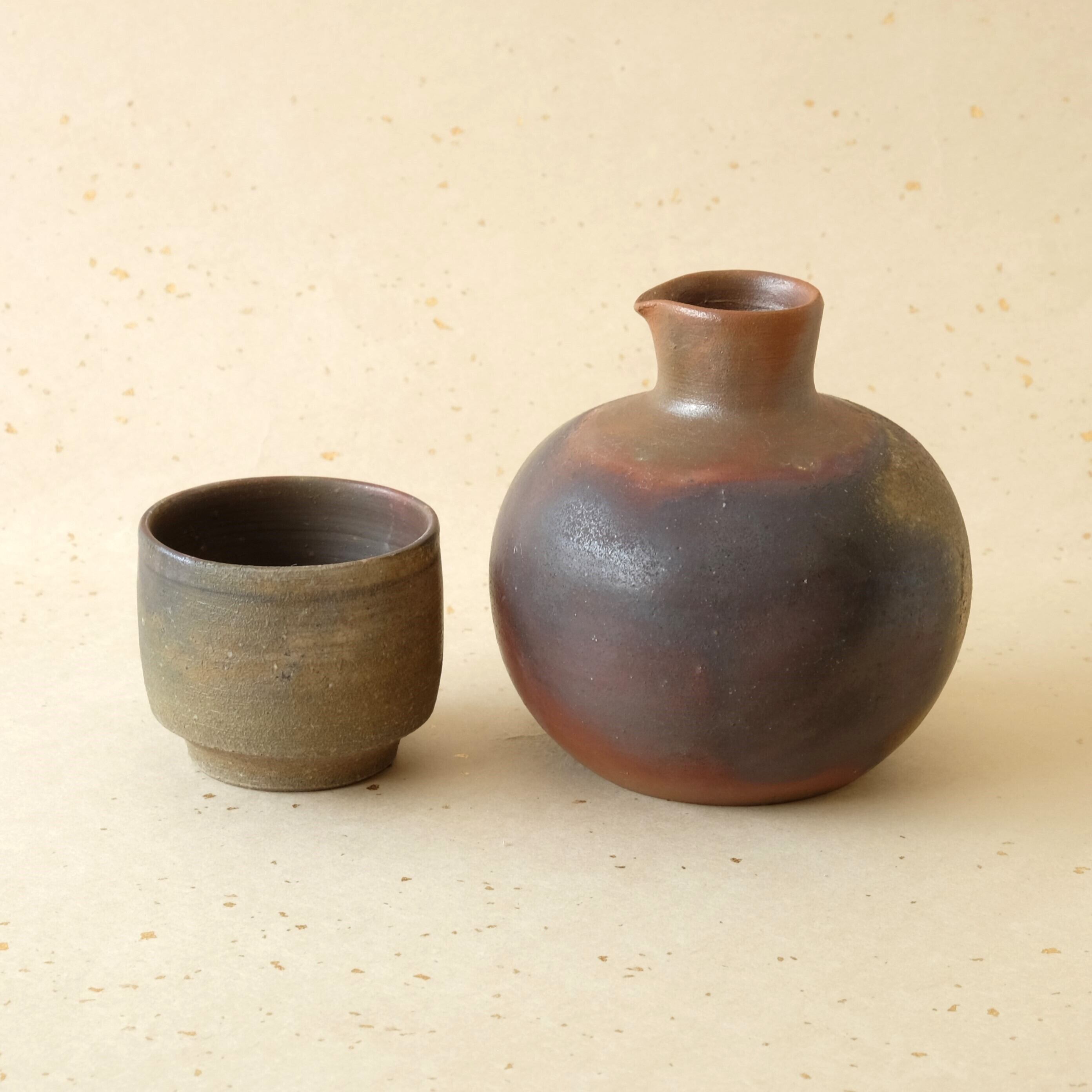 徳利とぐい呑のセットです。日本酒を美味しくいただけます。徳利にぐい呑をかぶせた状態で焼成したため、かぶさっていた部分が抜け模様になっています。