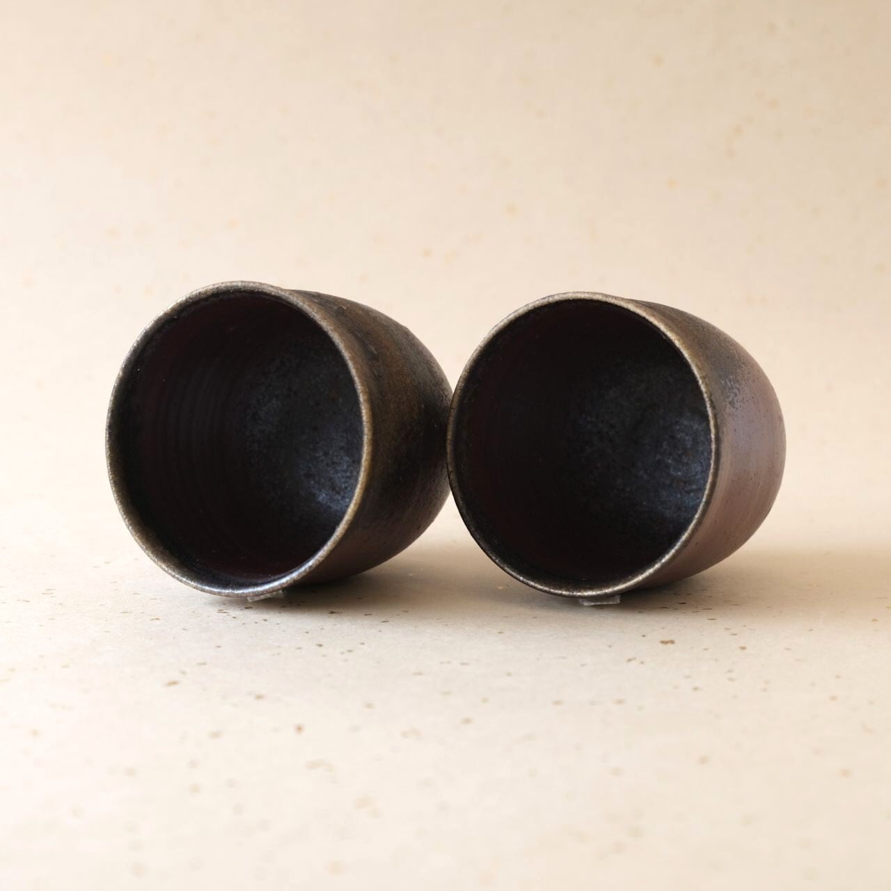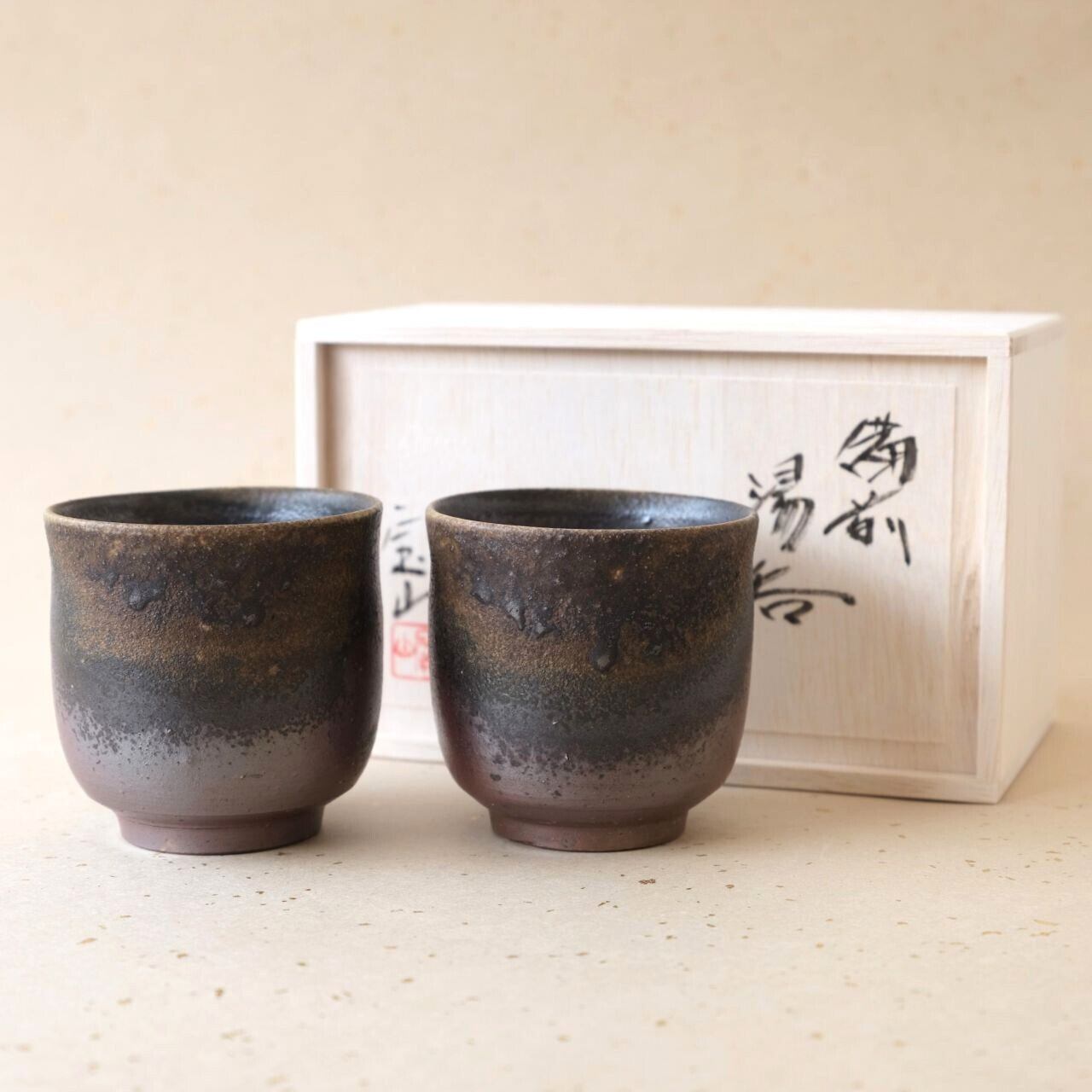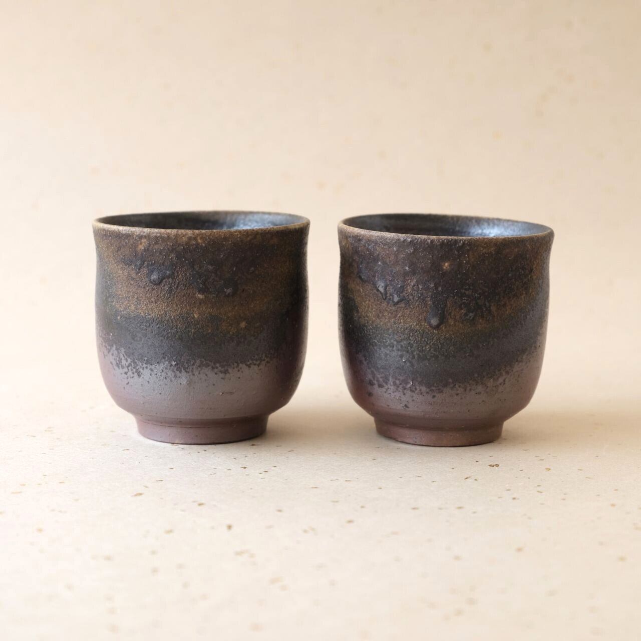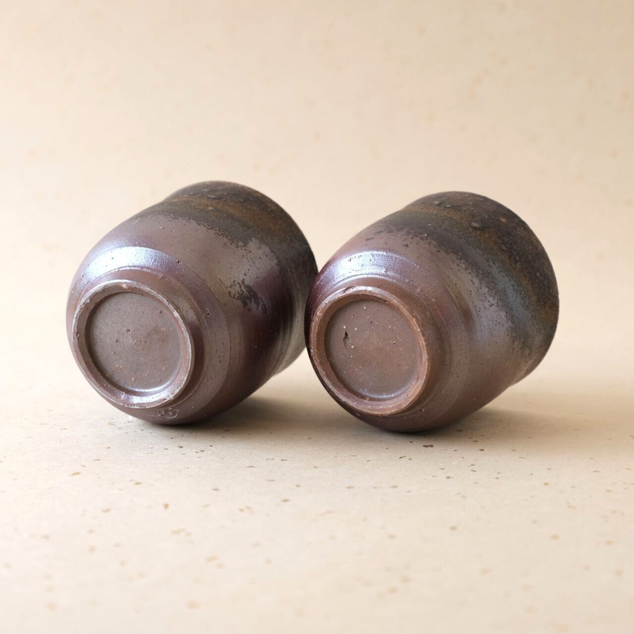 標準サイズの湯呑セットです。お茶だけでなく、さまざまな飲み物のうつわとしても使っていただけます。燃料の松割木の灰が付着した部分が黄土色に変化し、景色となっています。