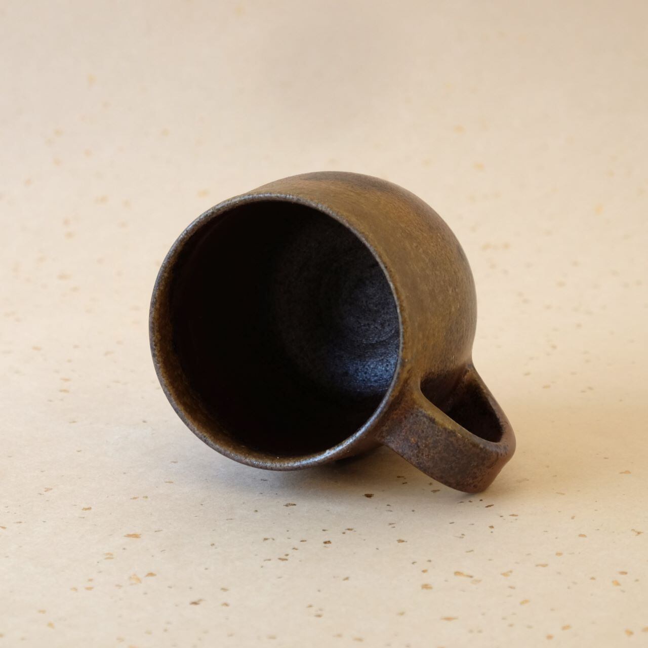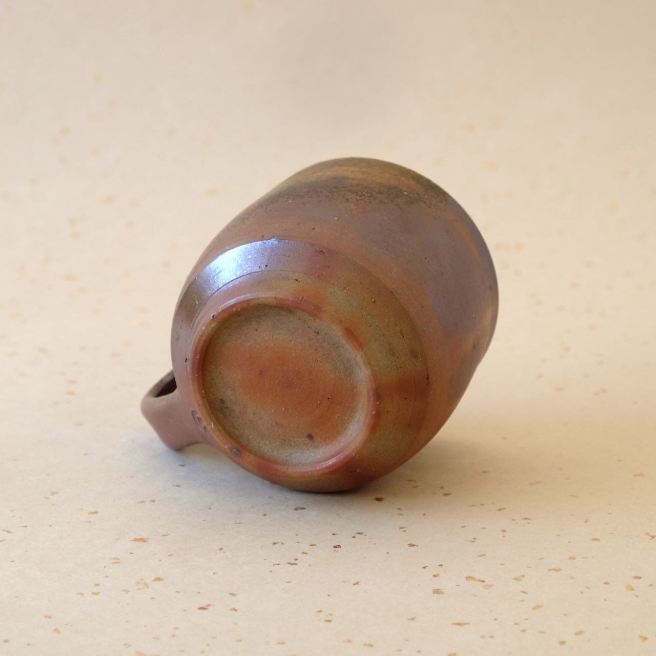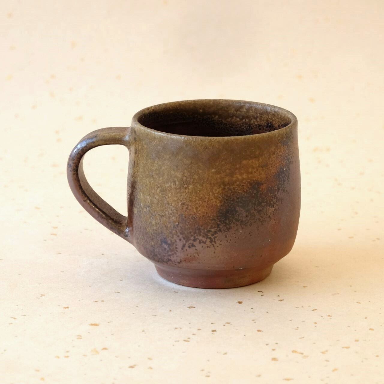 標準サイズのコーヒーカップです。コーヒーの苦味を和らげてくれると言われています。うつわの側面には、燃料の松割木の灰が付着し、黄味がかった色合いが現れています。