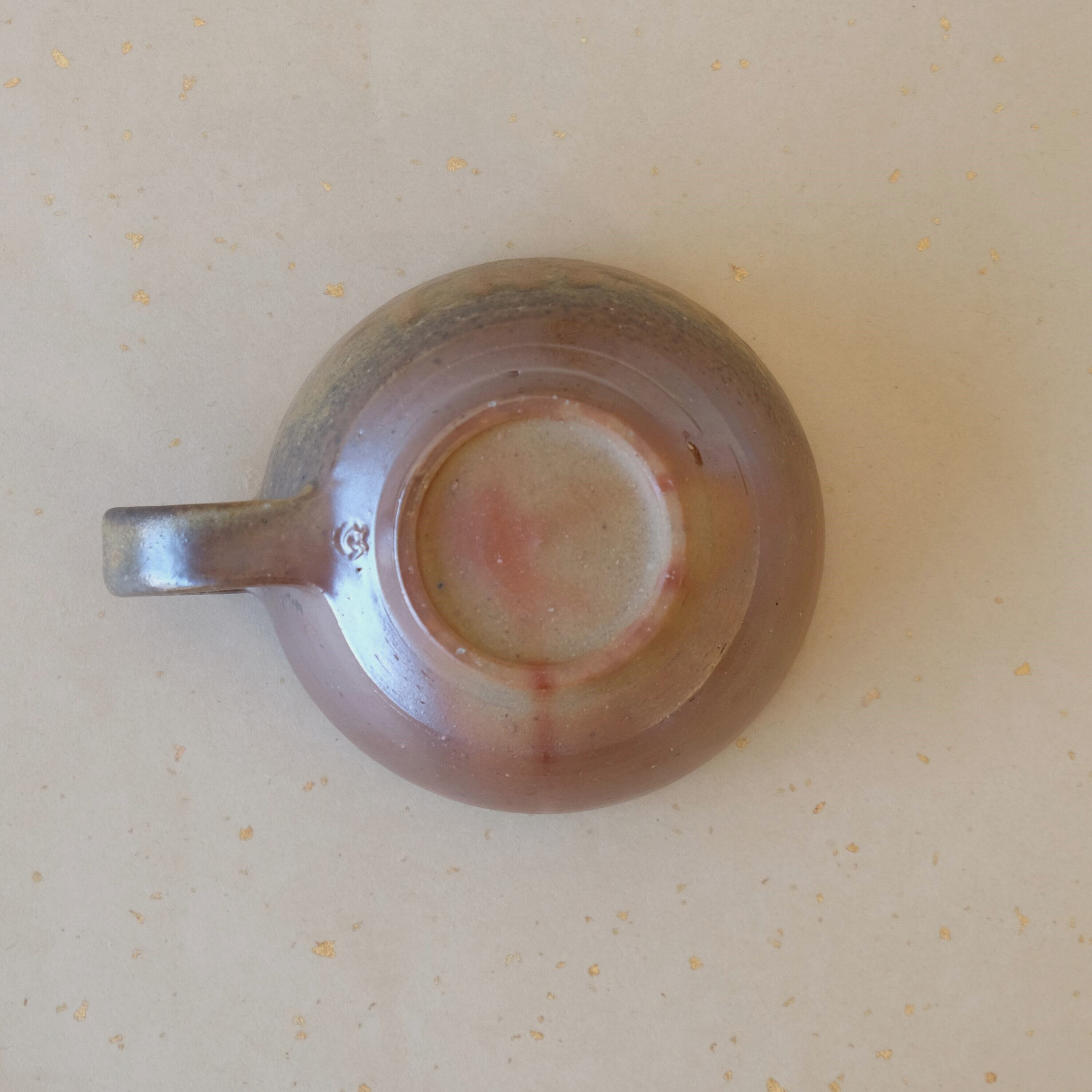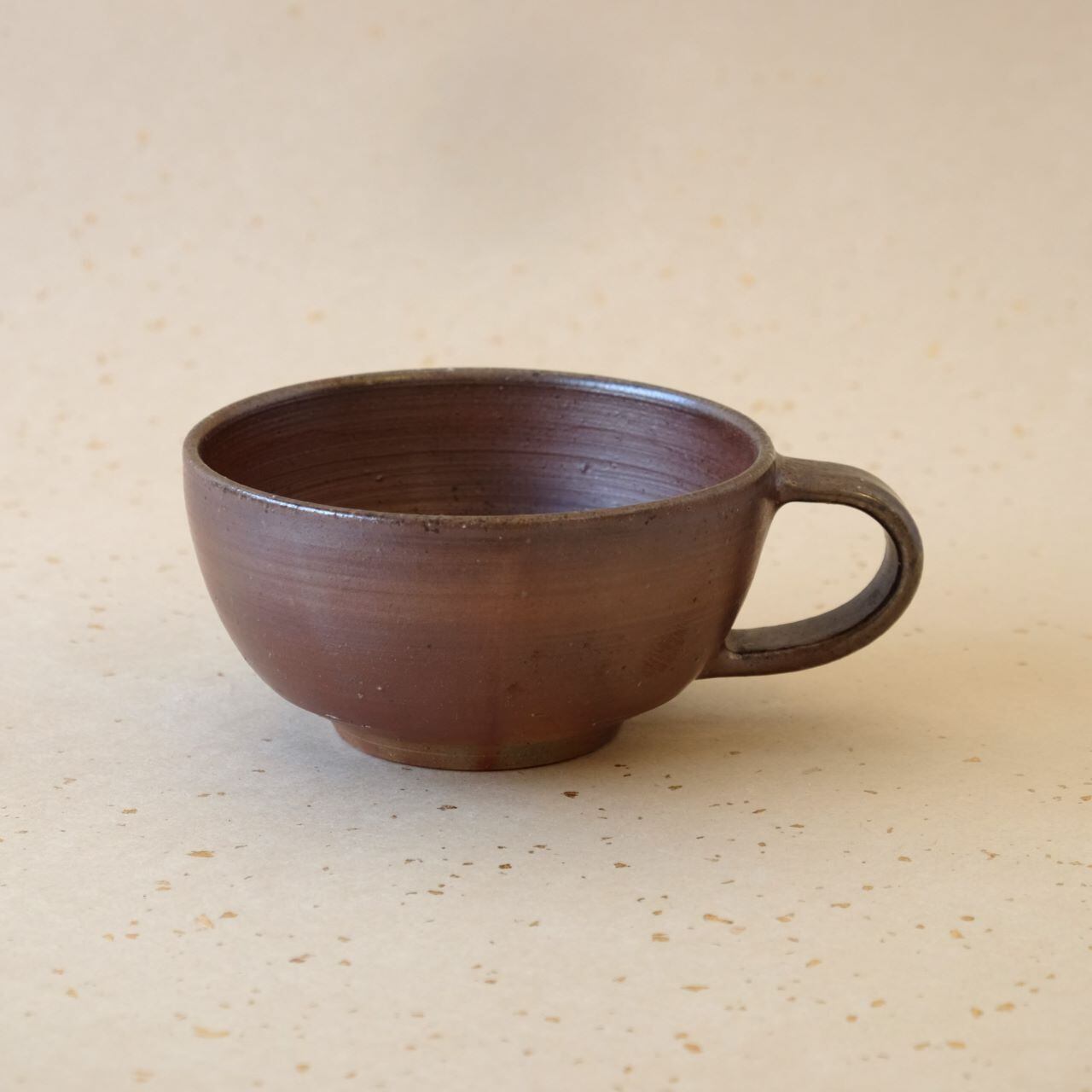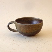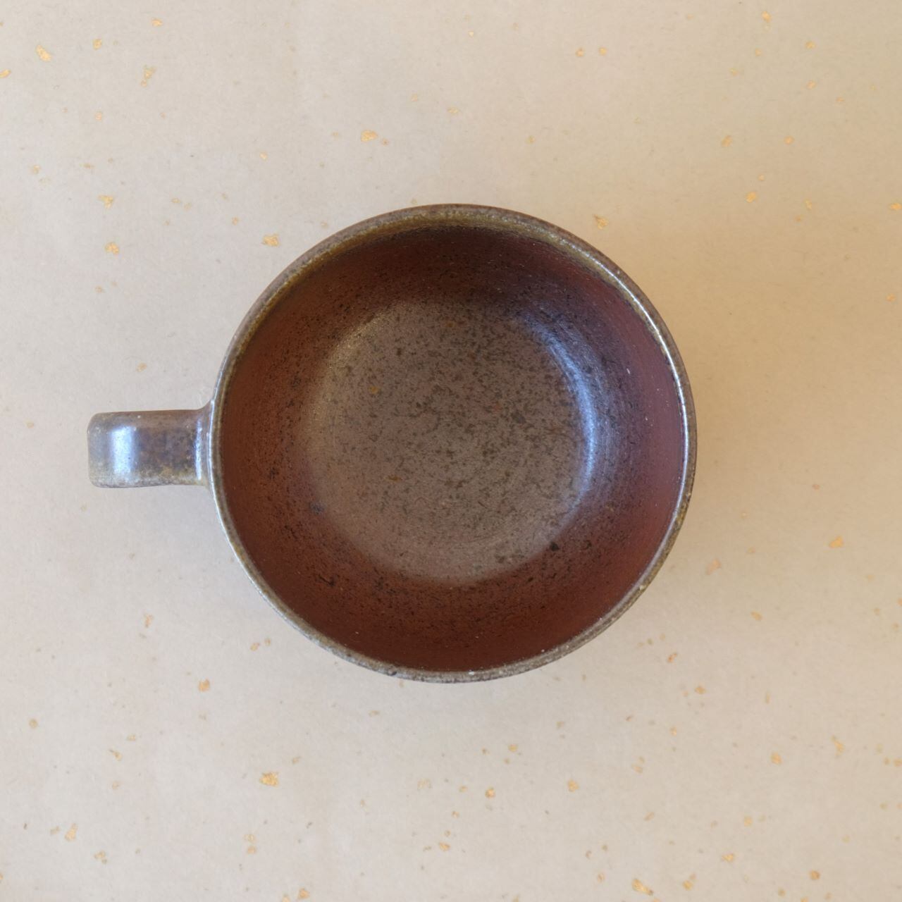 丸形のコーヒーカップです。コーヒーの苦味を和らげてくれると言われています。うつわの側面には、燃料の松割木の灰が付着し、黄味がかった色合いが現れています。