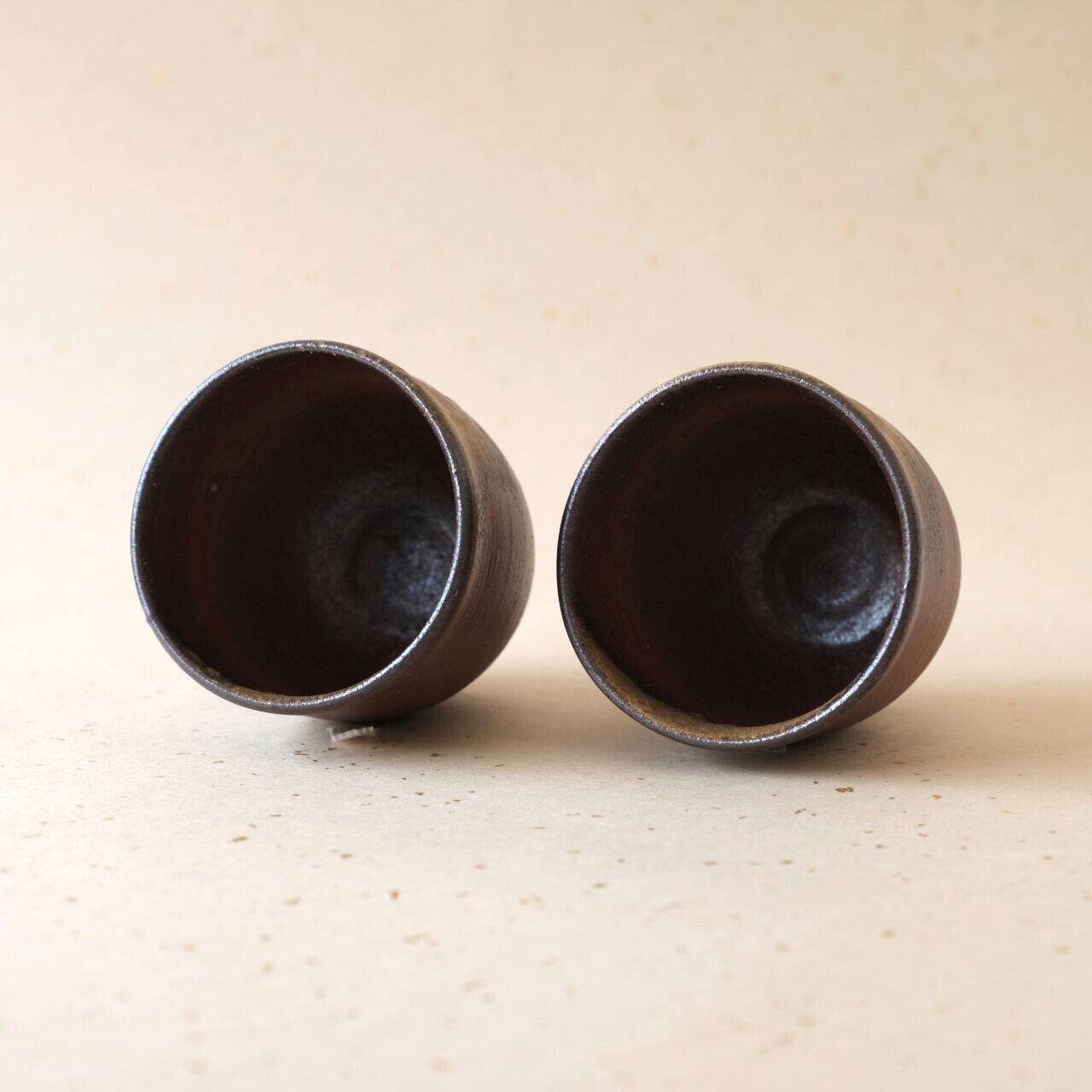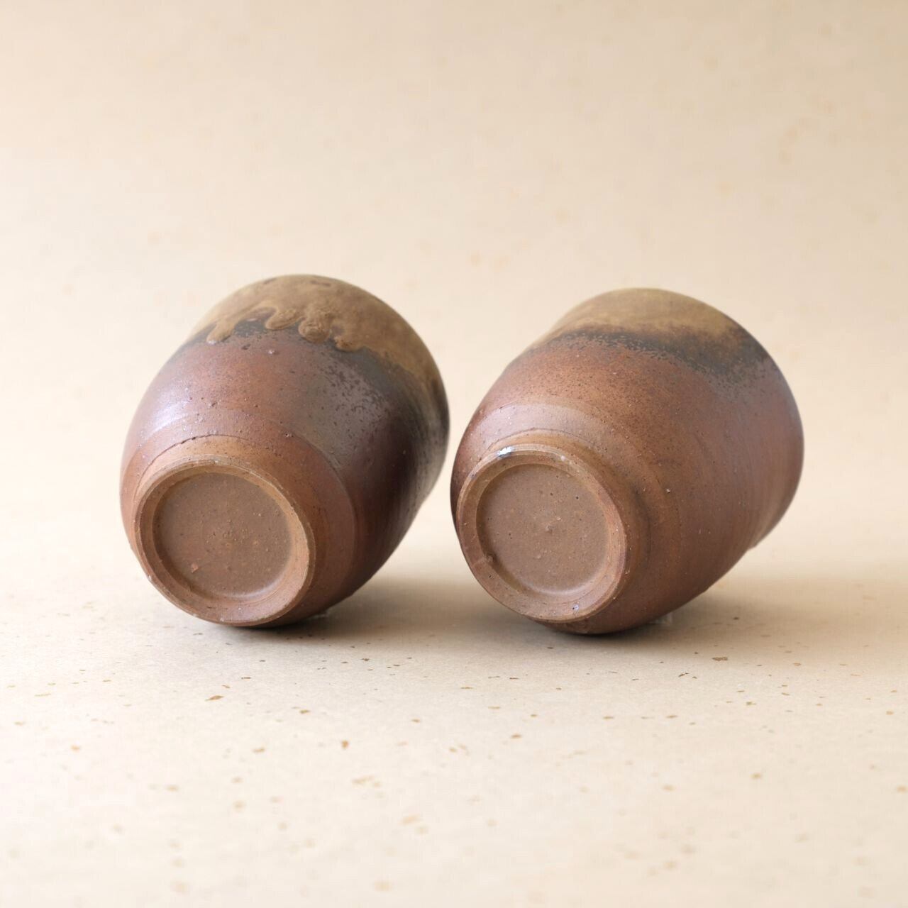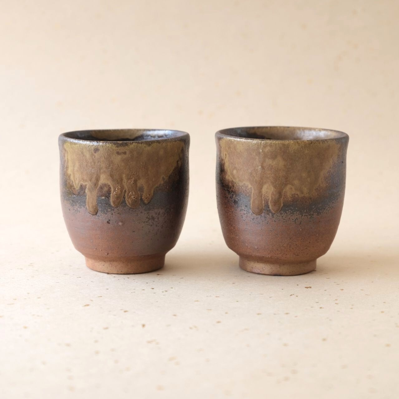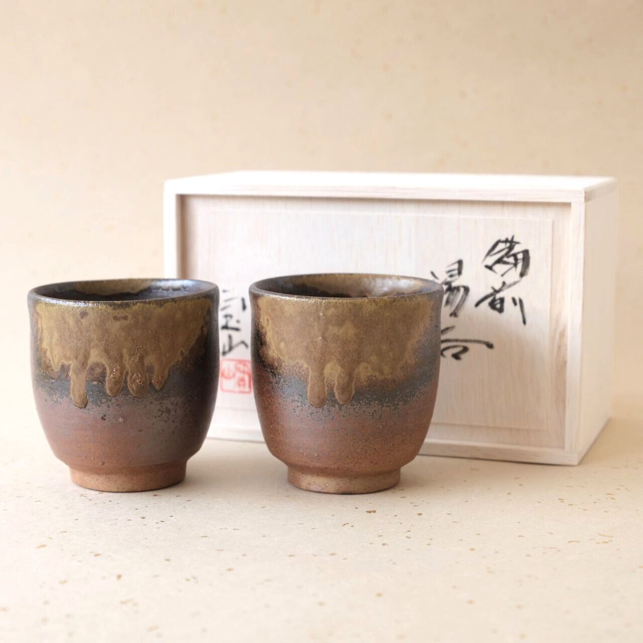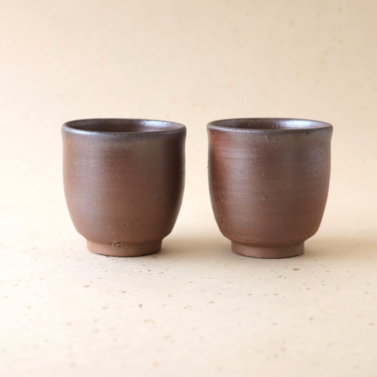 標準サイズの湯呑セットです。お茶だけでなく、さまざまな飲み物のうつわとしても使っていただけます。燃料の松割木の灰が付着した部分が黄土色に変化し、景色となっています。