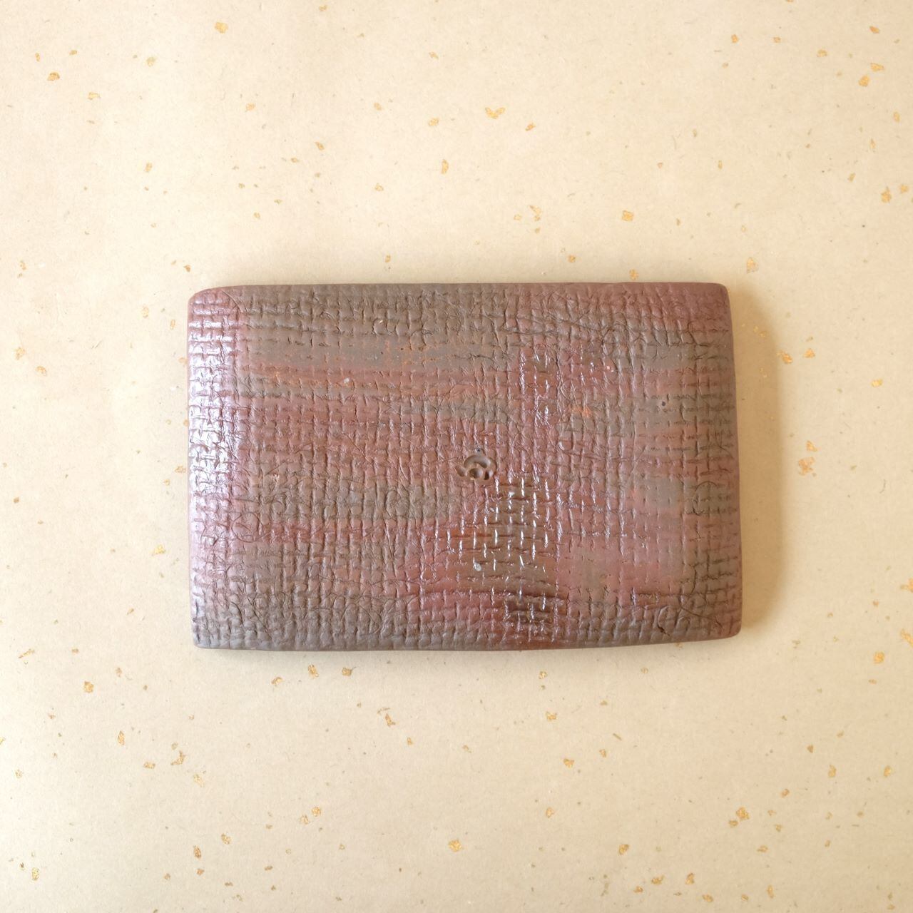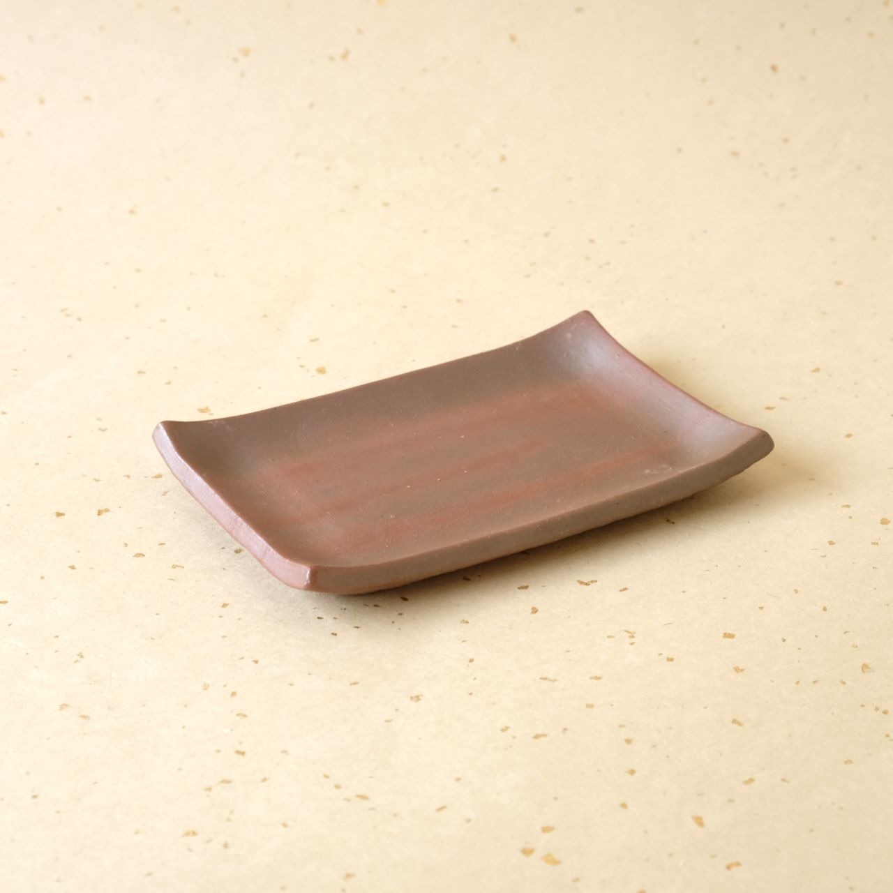 シンプルな長方形のお皿です。縁を軽く曲げているので汁気のあるものでも盛り付けることができます。ワラを置いていた部分が赤く発色し、景色となっています。