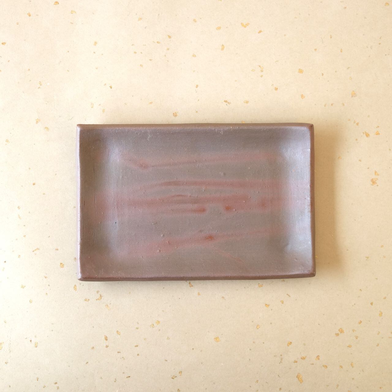 シンプルな長方形のお皿です。縁を軽く曲げているので汁気のあるものでも盛り付けることができます。ワラを置いていた部分が赤く発色し、景色となっています。