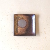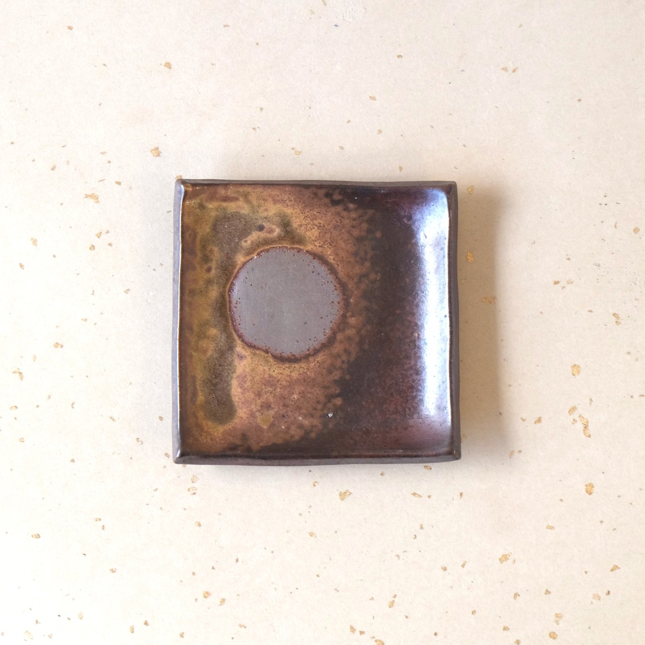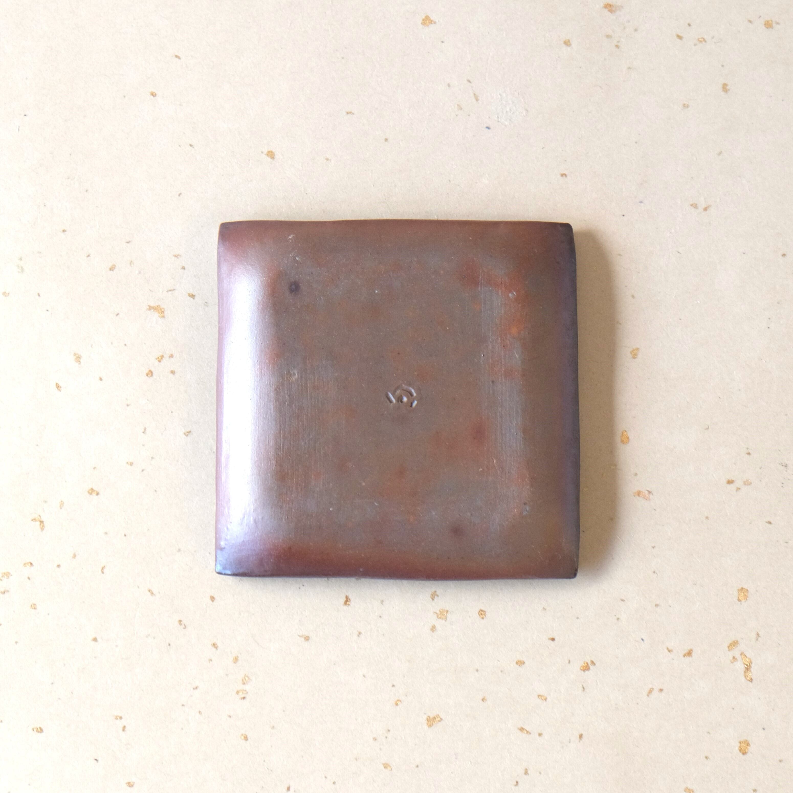 シンプルな正方形の豆皿です。縁を軽く曲げているので汁気のあるものでも盛り付けることができます。燃料の松割木の灰が溶けた部分と丸い抜け模様の部分がコントラストとなっています。