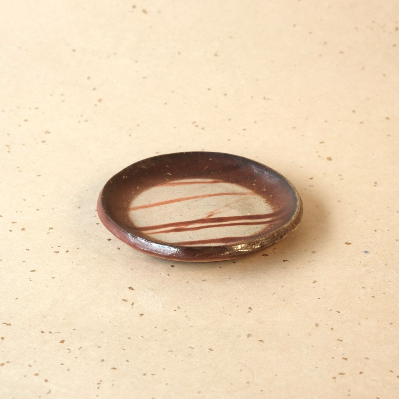 シンプルな丸形の豆皿です。縁を軽く曲げているので汁気のあるものでも盛り付けることができます。登り窯焼成により、全体的に落ち着いた雰囲気に仕上がっています。