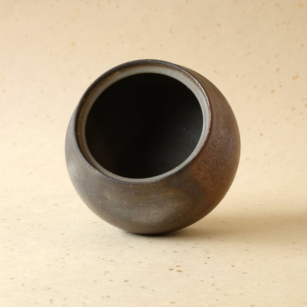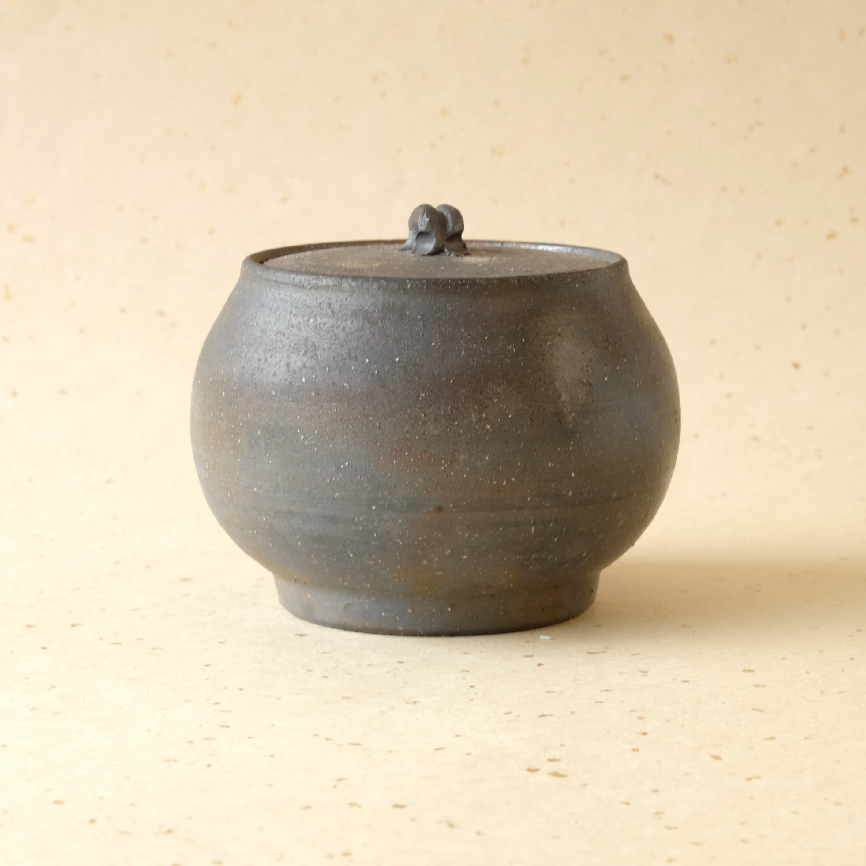 つまみのあるフタ付きのうつわです。漬物を入れたり、小物を入れたりとさまざまな用途で使っていただけます。木炭のガスの作用により、青味がかった色合いが出ています。