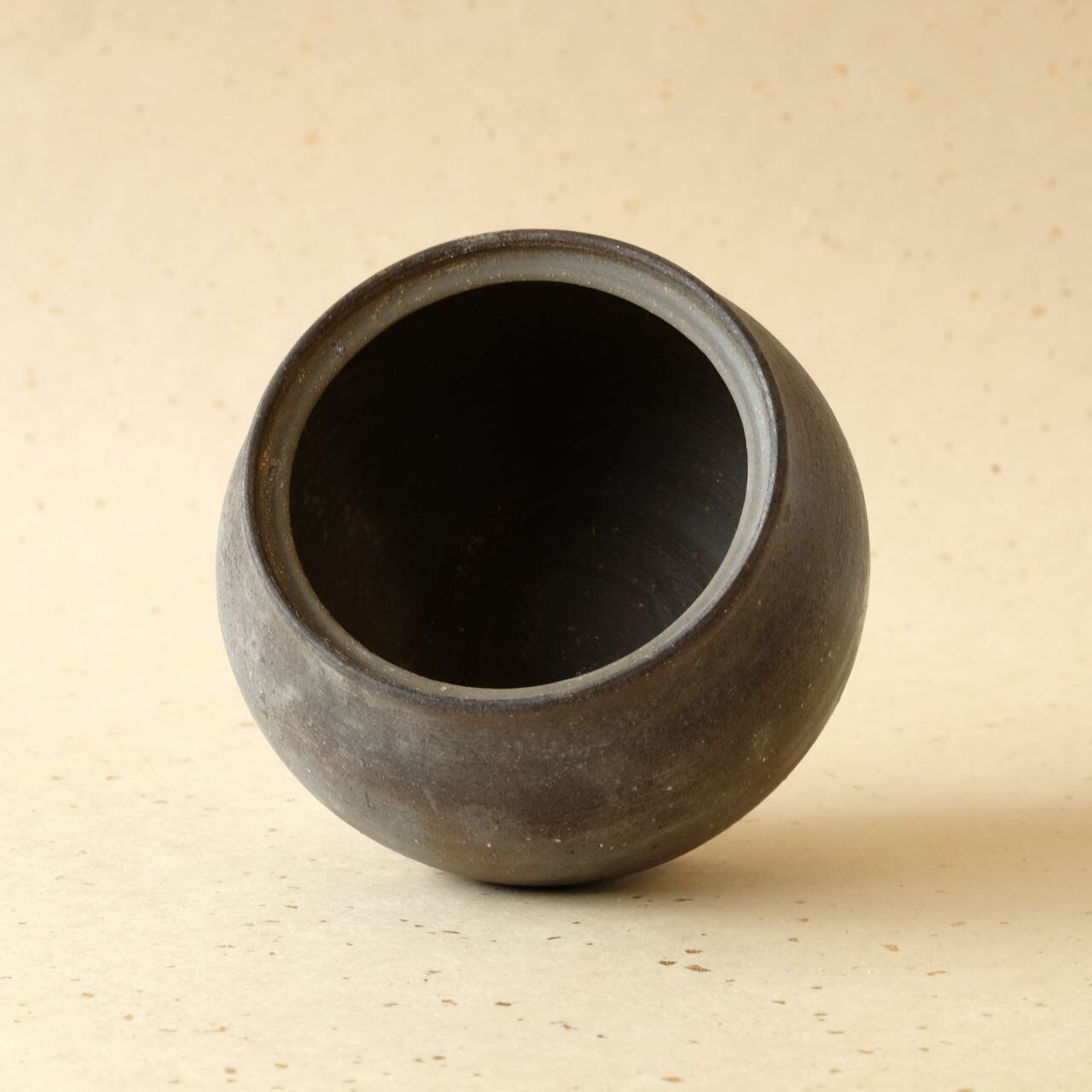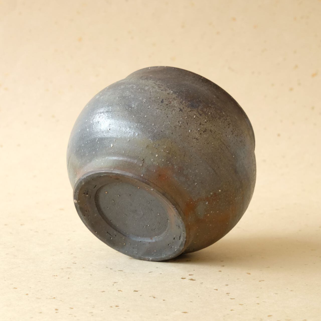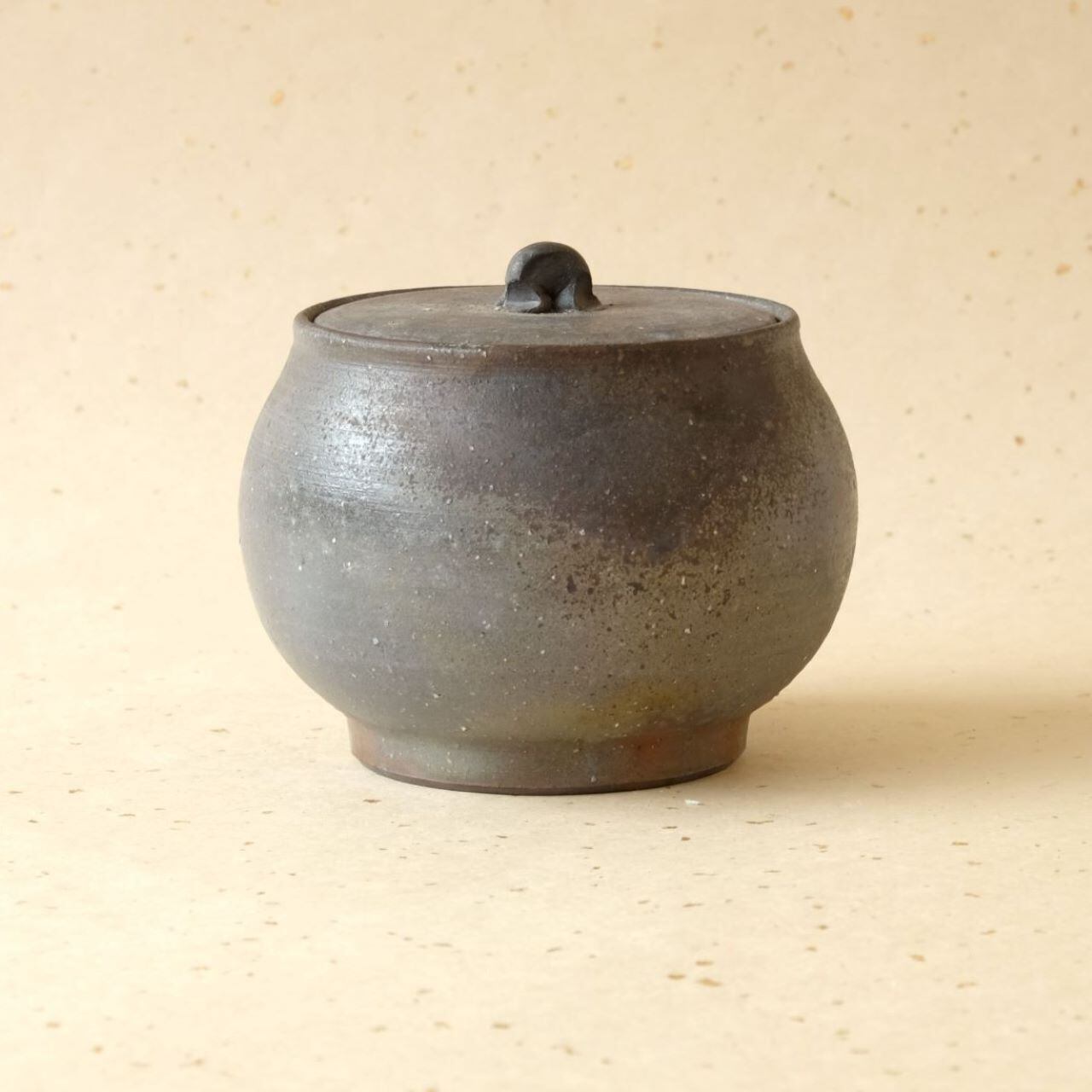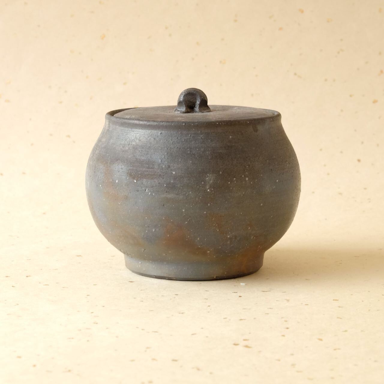 つまみのあるフタ付きのうつわです。漬物を入れたり、小物を入れたりとさまざまな用途で使っていただけます。木炭のガスの作用により、青味がかった色合いが出ています。