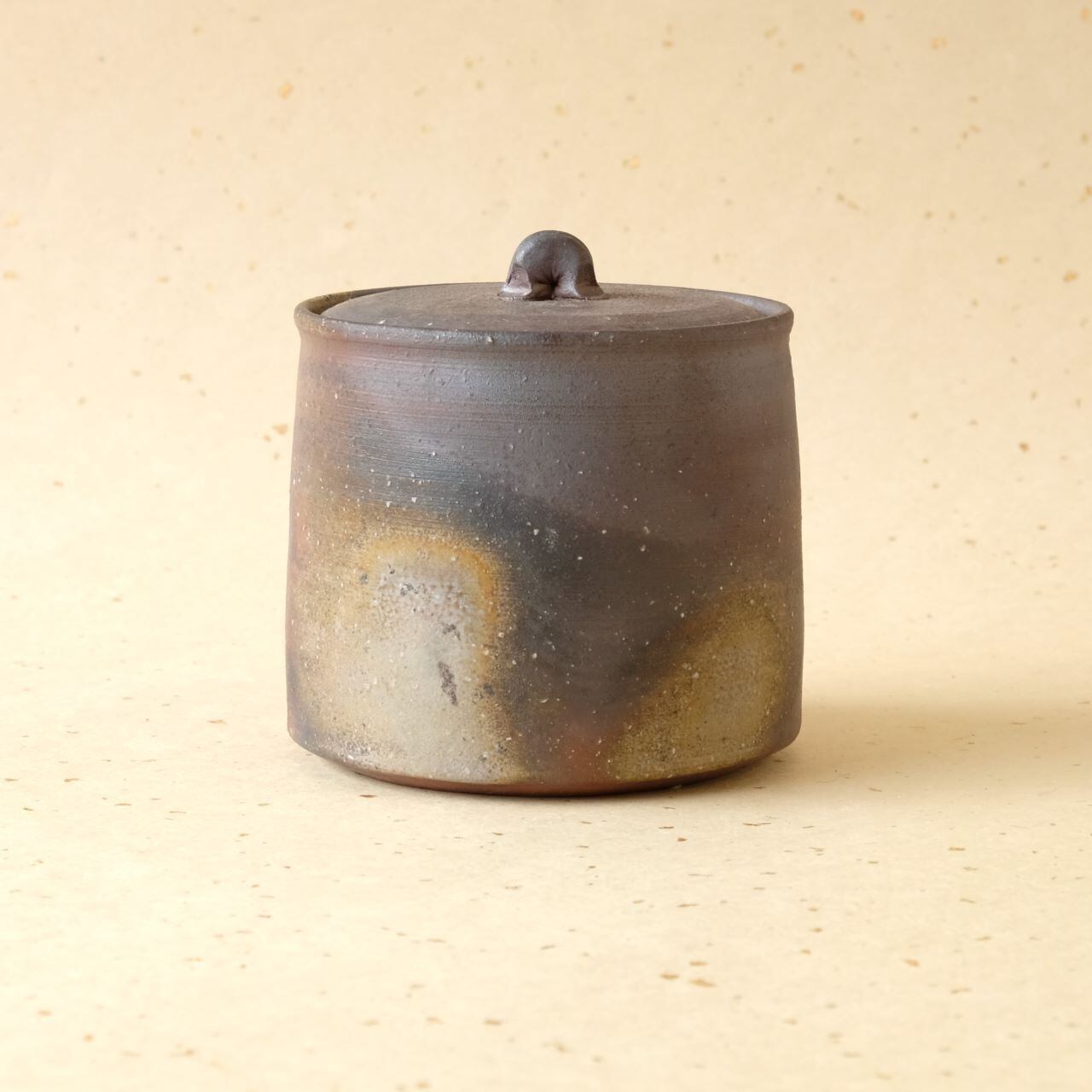 つまみのあるフタ付きのうつわです。漬物を入れたり、小物を入れたりとさまざまな用途で使っていただけます。木炭のガスの作用により、青味がかった色合いが出ています。