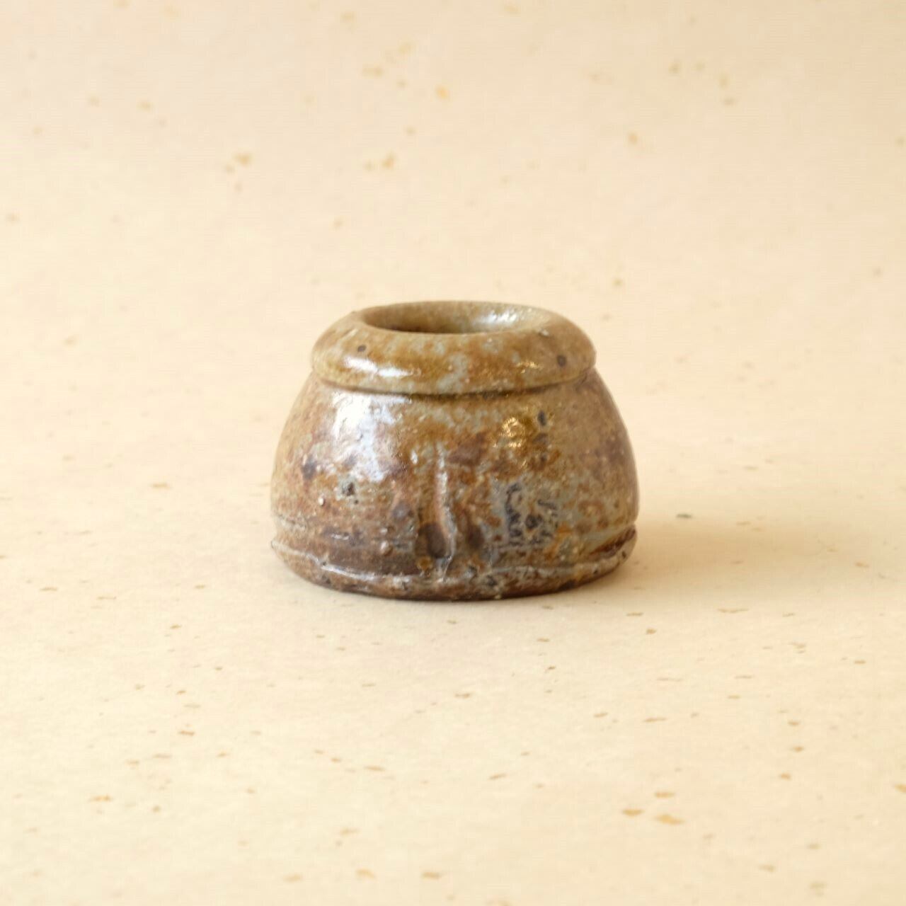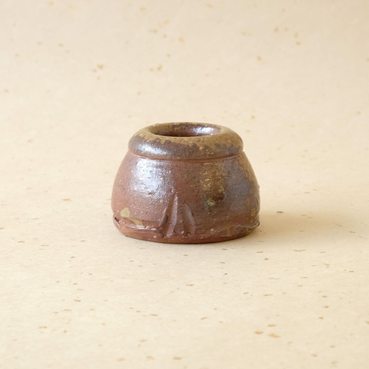 卓上花入にも使っていただける小品です。燃料の松割木の灰が降りかかり、溶けた部分が黄みがかった色合いになっています。