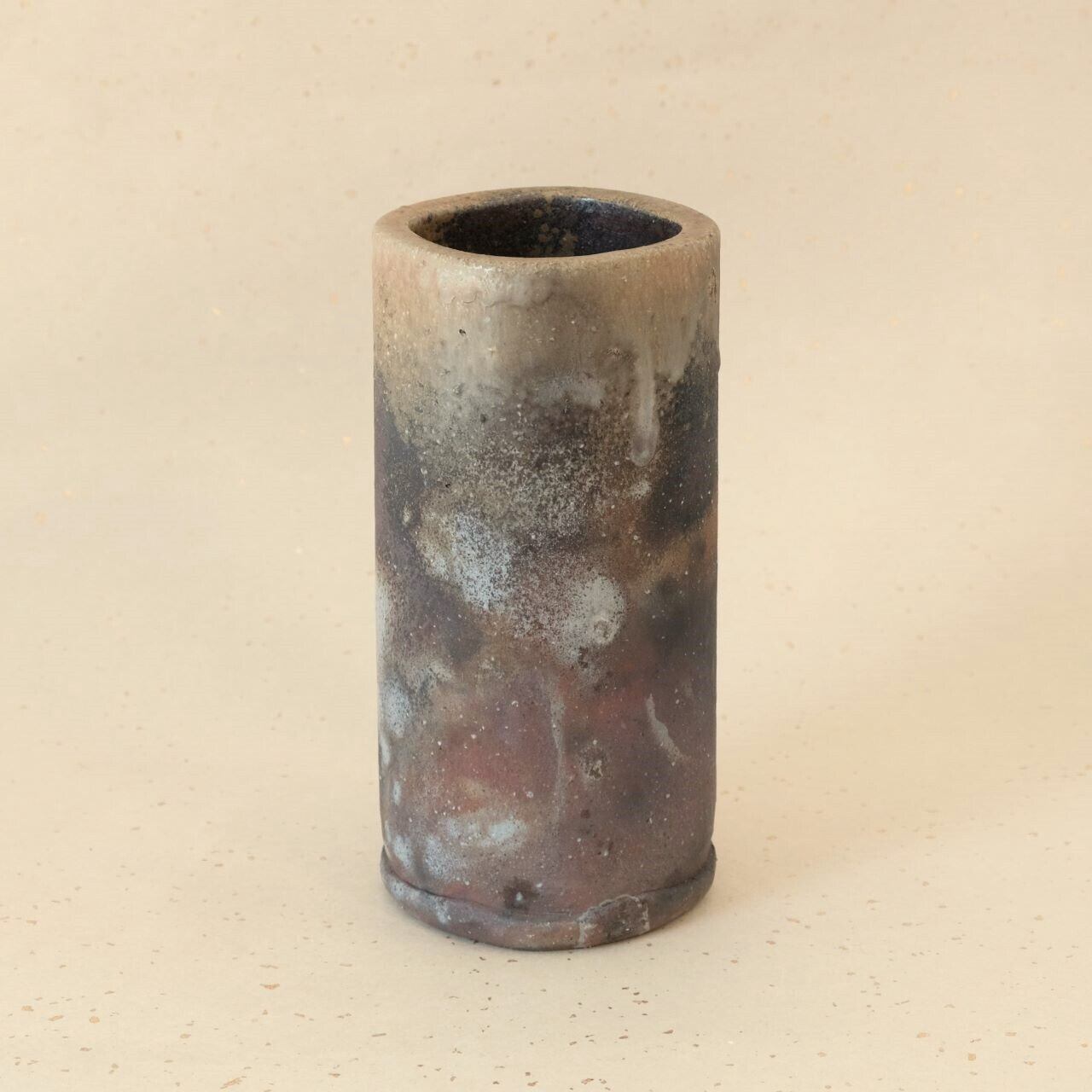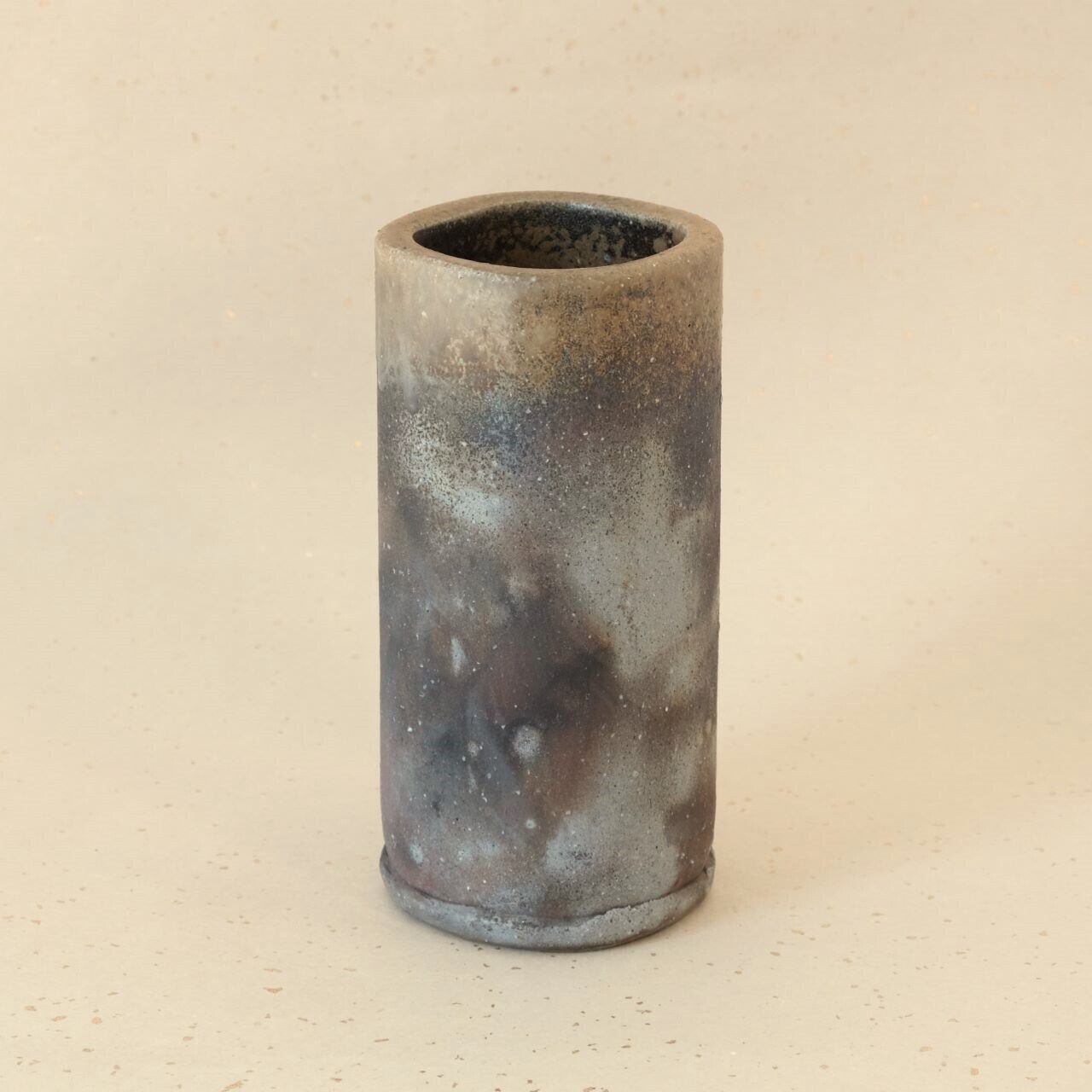 筒花入を軽く四角に変形させた花入です。口縁部は燃料の松割木の灰、側面は木炭から発せられるガスの影響を受けて、多彩な変化を見せています。