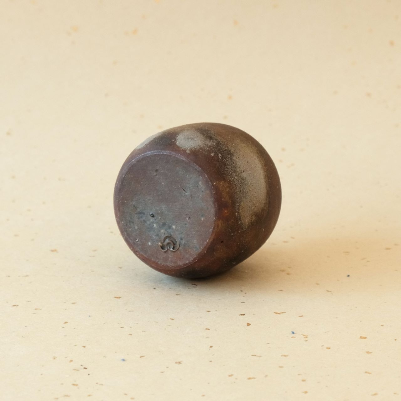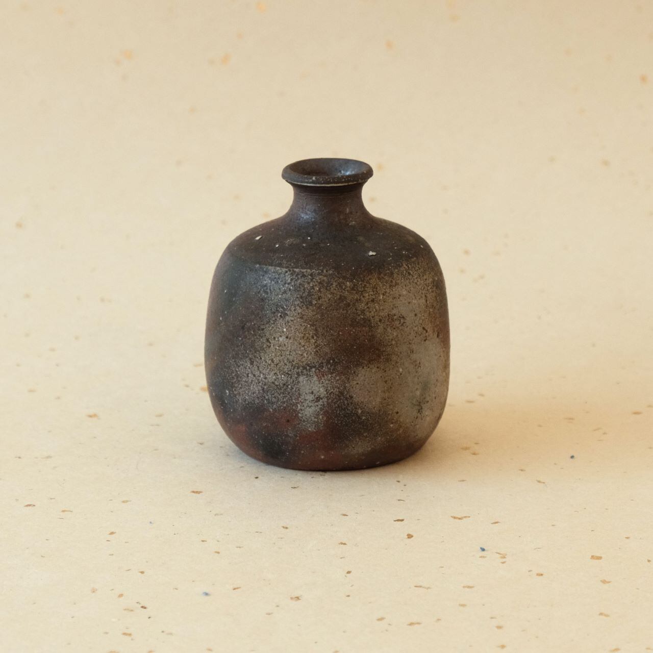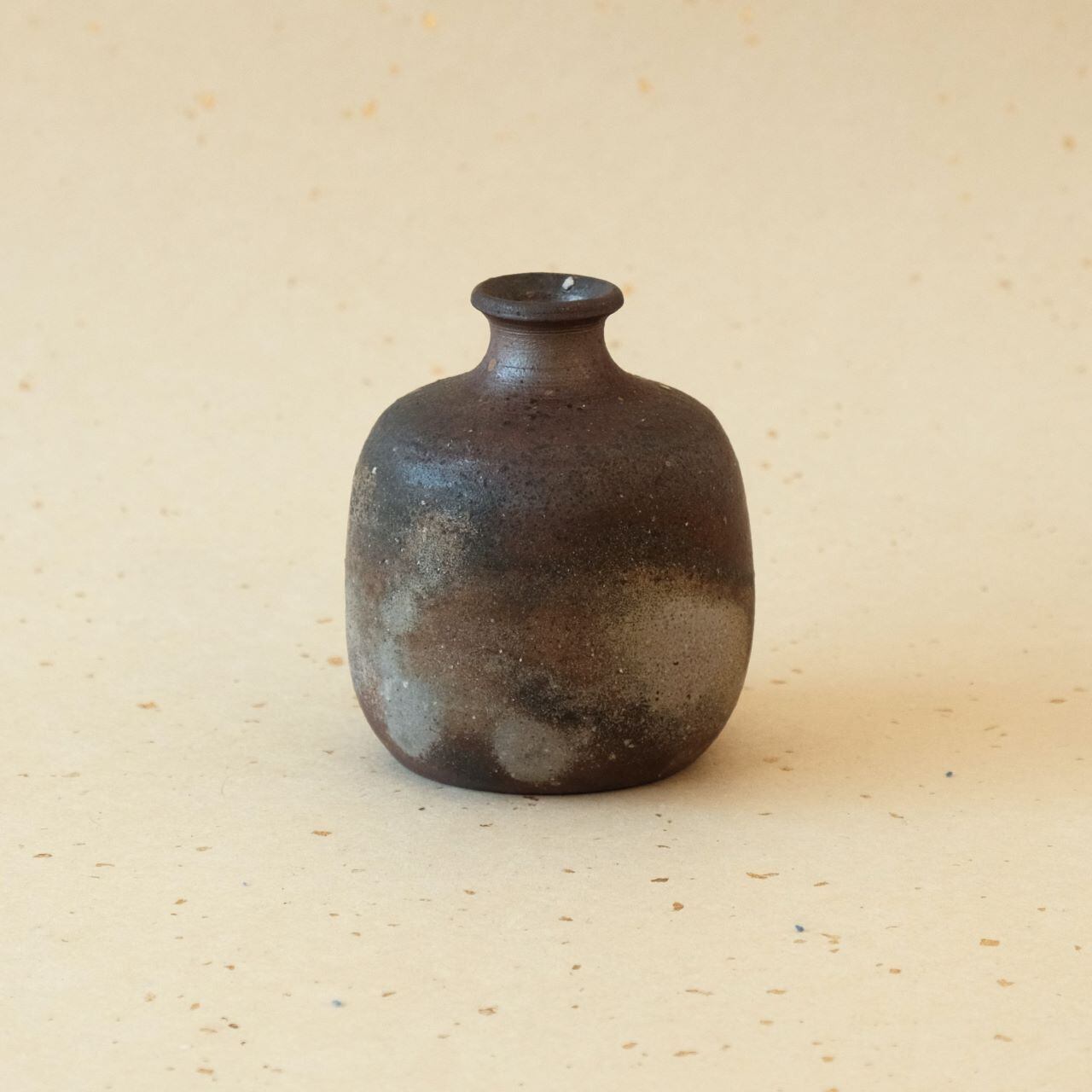 一輪花入などに使っていただける小さな徳利です。窯の火を止める直前に、作品の周りへ木炭を振りかけることにより、ガスの作用を受け、青みがかった表情が生まれています。