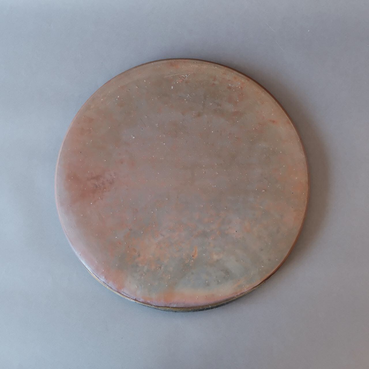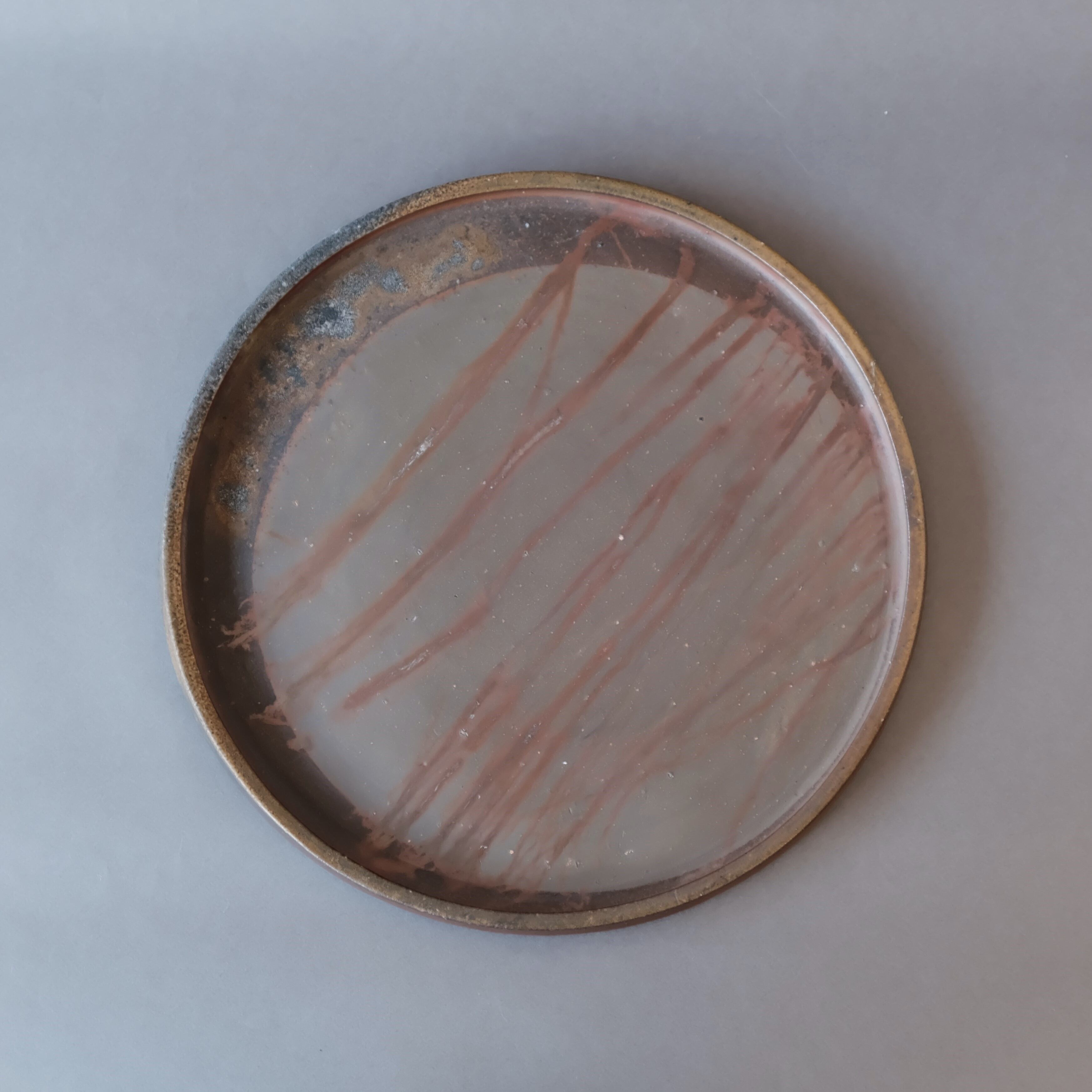 シンプルなデザインの丸形プレートです。ワラと接していた部分が赤く発色し、松割木の灰が付着した部分は黄みおびた色合いとなっています。