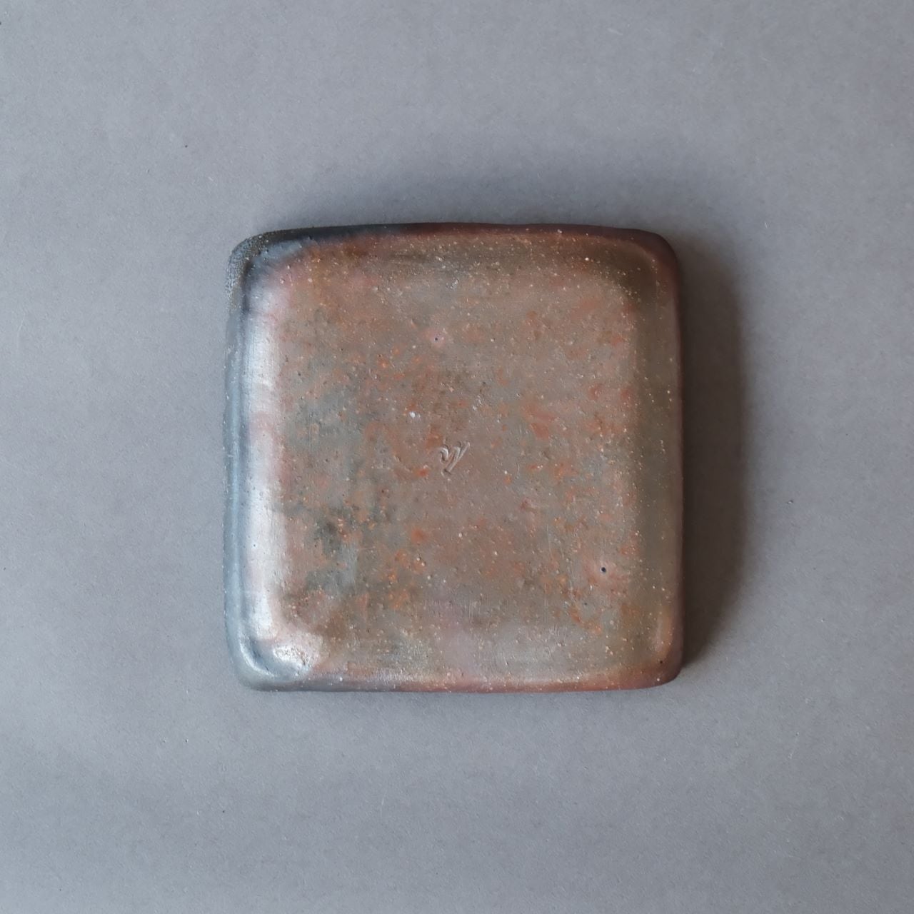 取り皿としても使える小皿です。縁を立てているので汁気のある料理でも対応可能です。燃料の松割木の灰が掛かった部分と、丸い抜け模様がアクセントになっています。