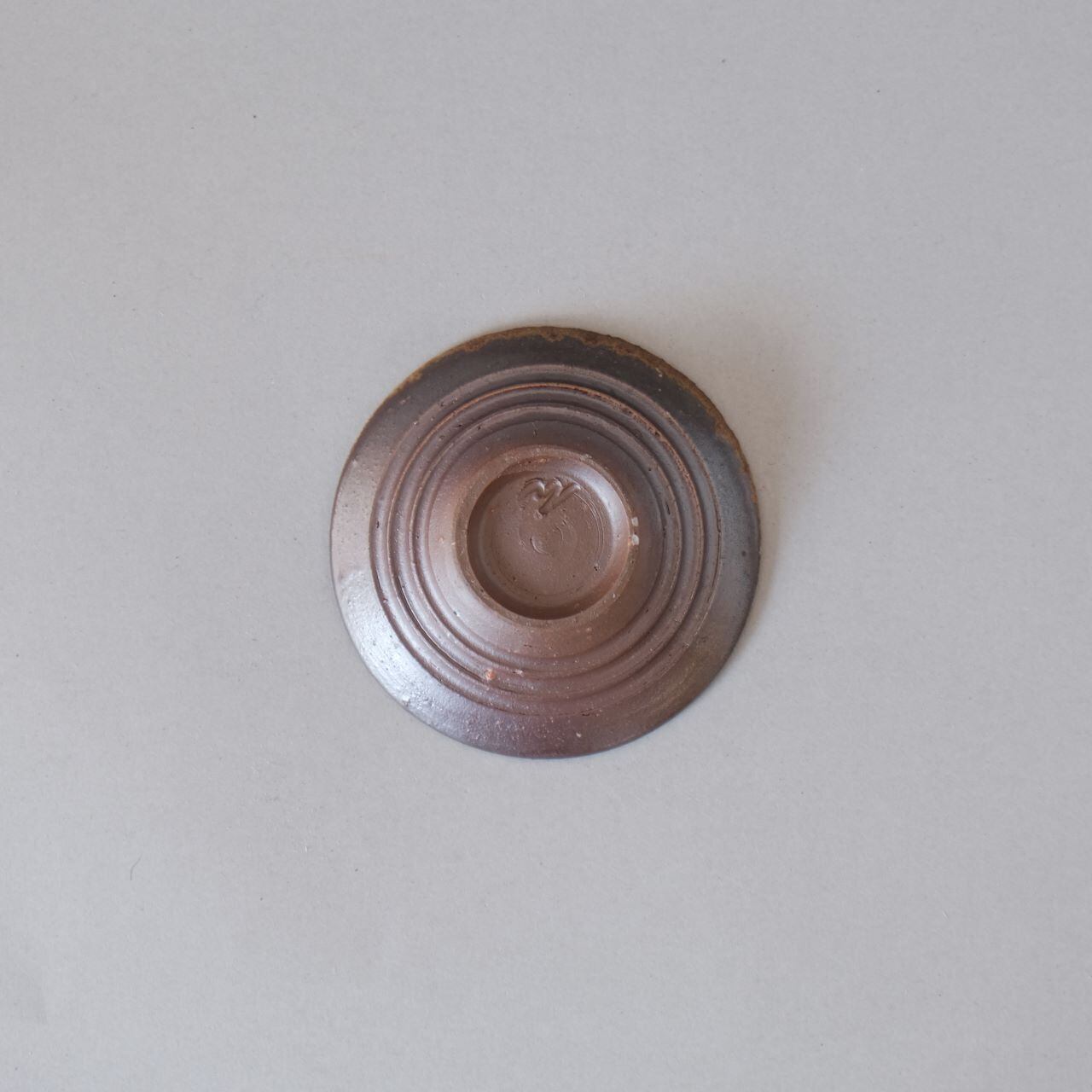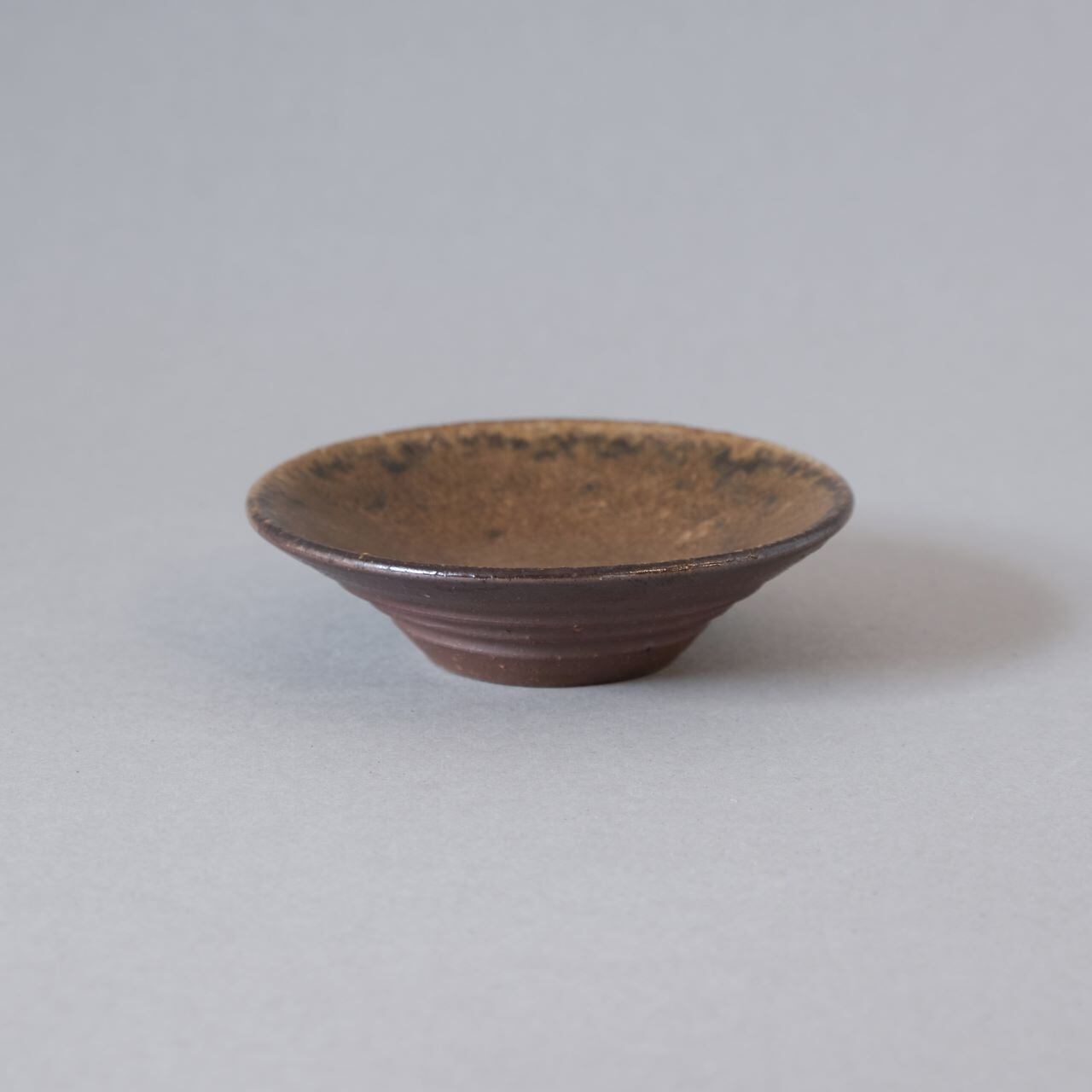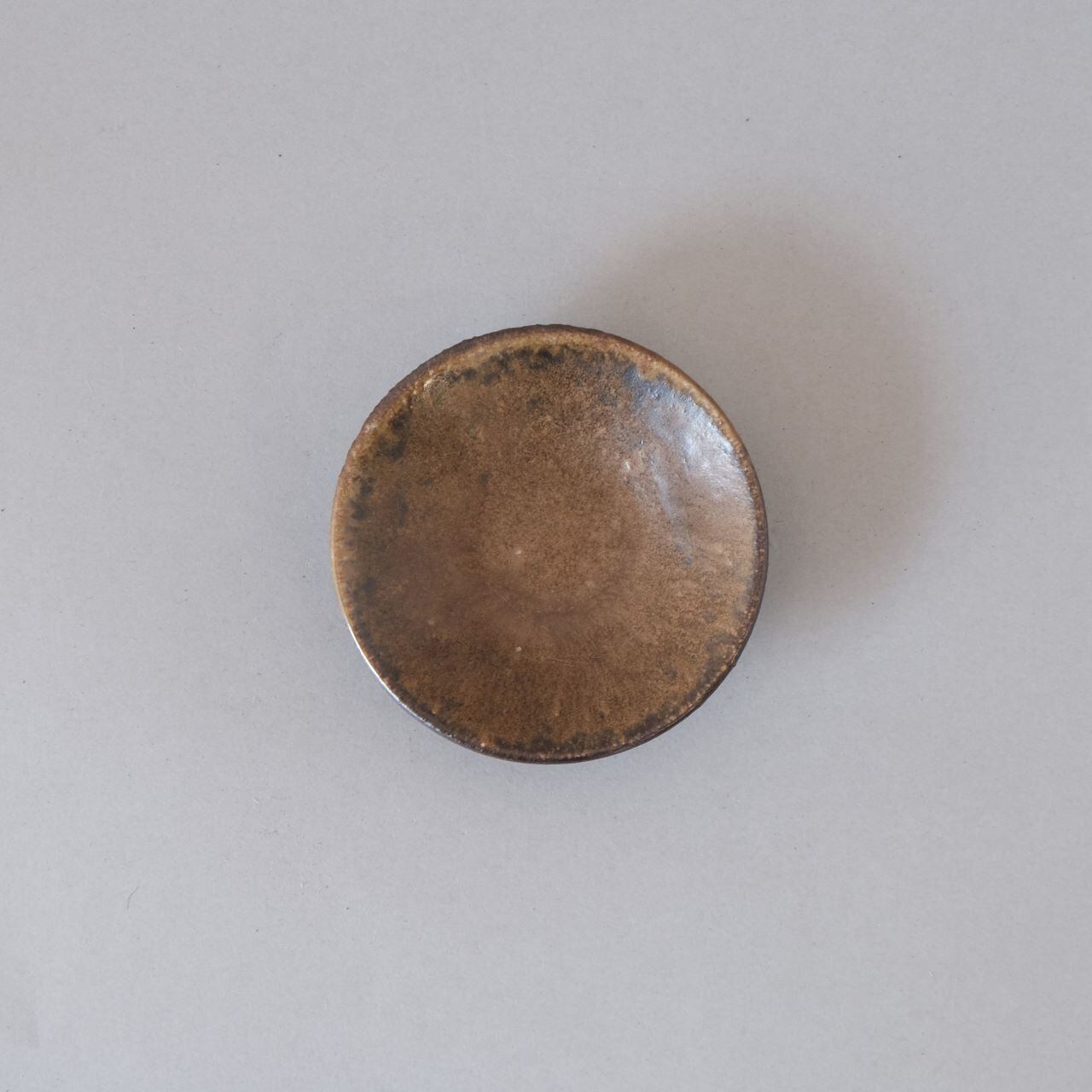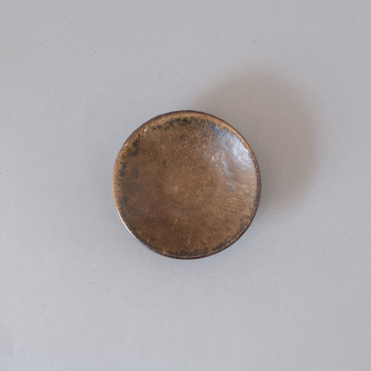 とても小さなサイズの豆皿です。深さがあるので汁気のあるものにも使えます。燃料の松割木の灰が降りかかり、溶けた部分が黄色く流れており、変化を見せています。
