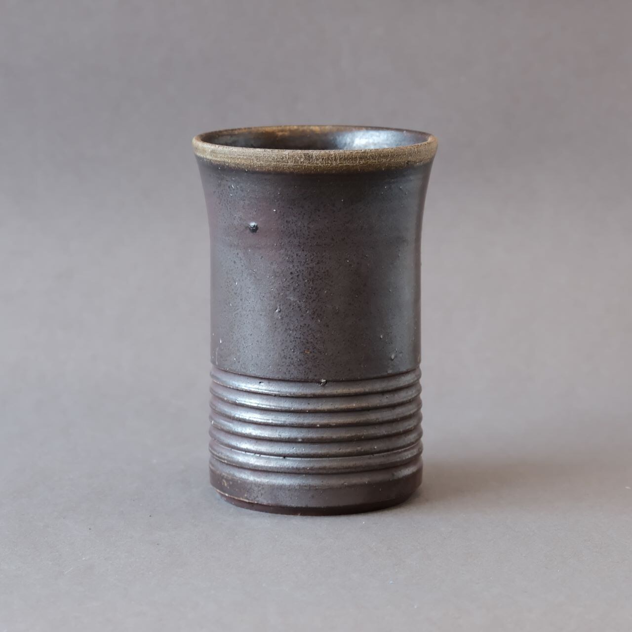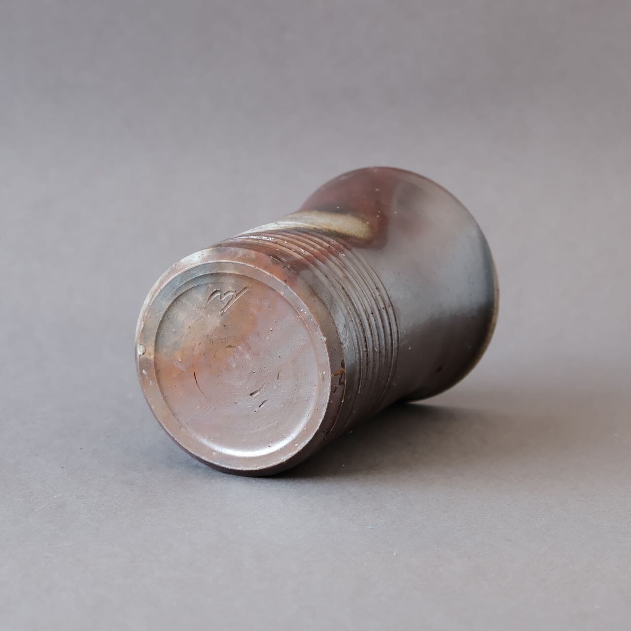 ビール呑などに使っていただける背の高いカップです。燃料の松割木の灰や木炭のガスの影響を受け、黄色や青みがかった変化が現れています。
