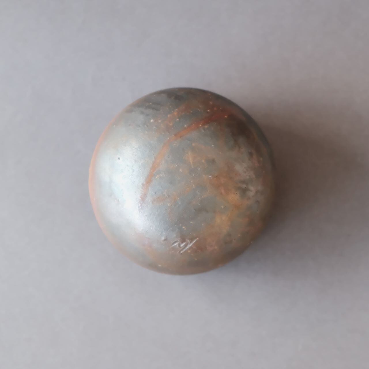底が丸く、ゆらゆらと揺れるカップです。窯の火を止める直前に投入する木炭のガスの影響を受け、緑色や青みがかった変化が現れています。