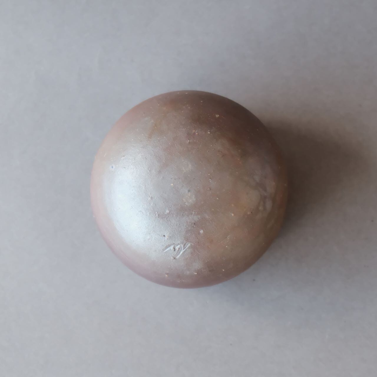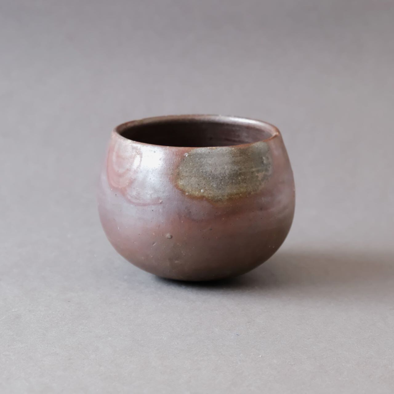 底が丸く、ゆらゆらと揺れるカップです。窯の火を止める直前に投入する木炭のガスの影響を受け、緑色や青みがかった変化が現れています。