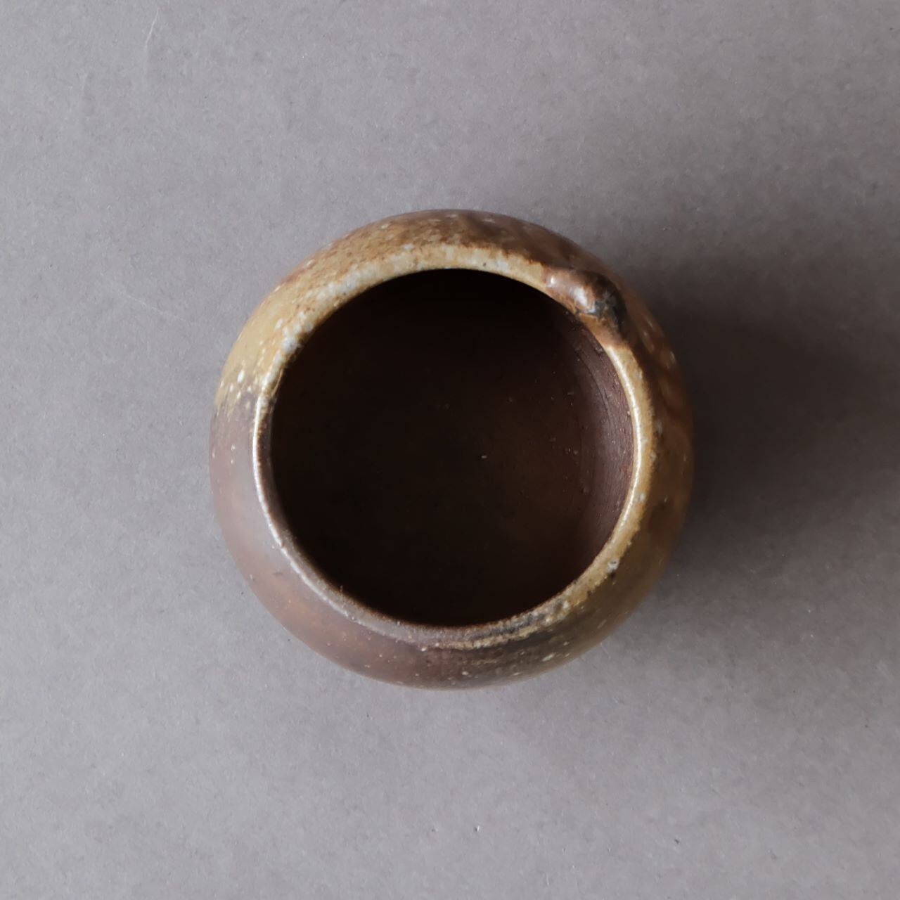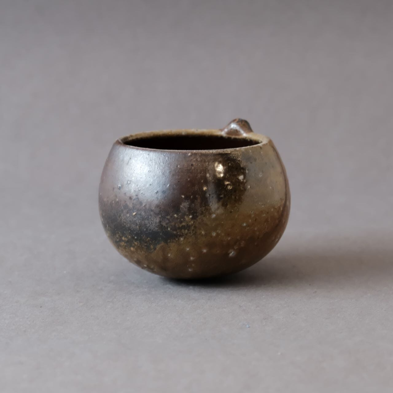ゆらゆらと揺れるぐい呑です。焚口の近くで焼成することにより、燃料の松割木の灰が降りかかり、溶け出した部分が景色となっています。