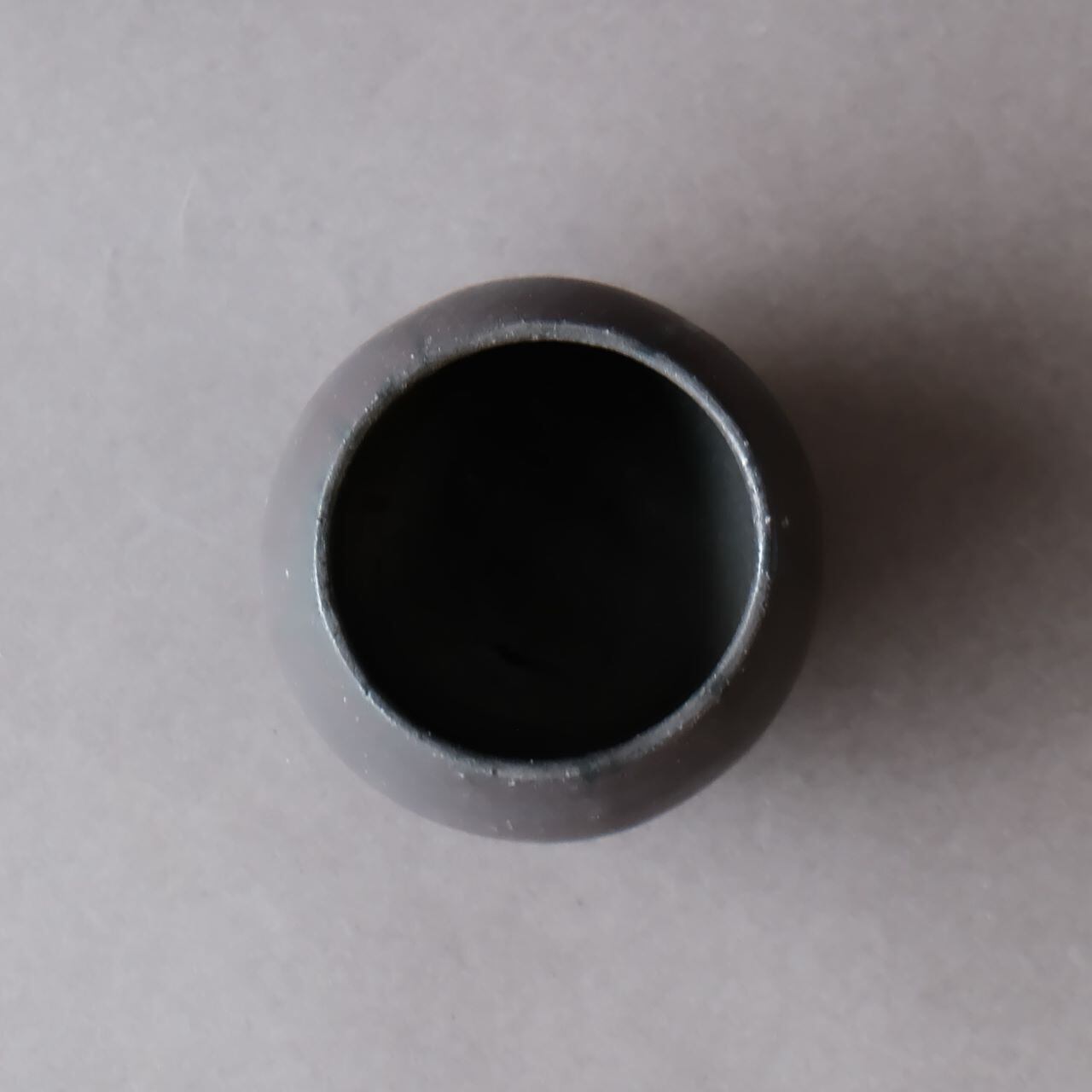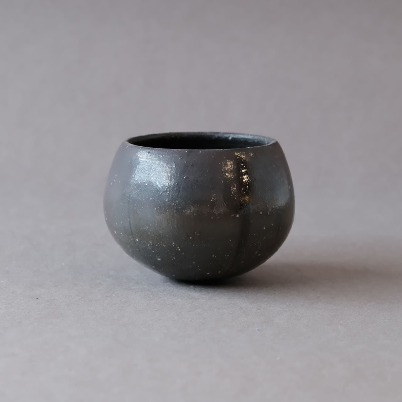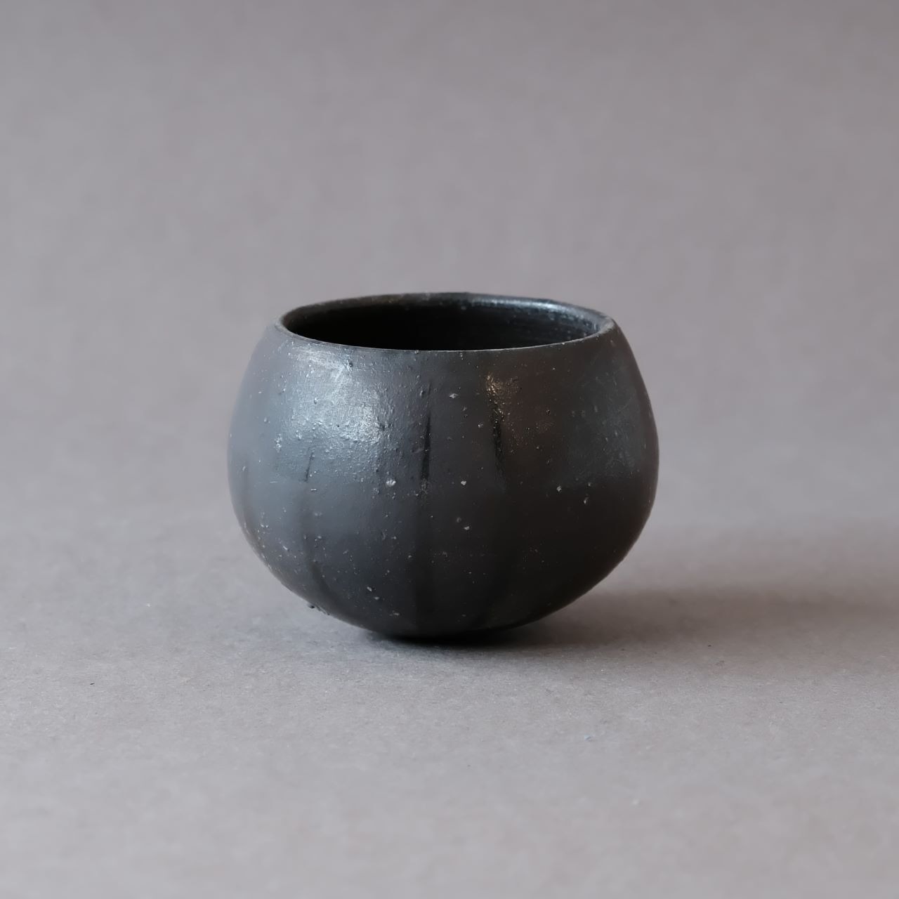 ゆらゆらと揺れるぐい呑です。窯内で炭に埋もれた状態で焼成されることにより、黒くマットな質感に仕上がっています。ワラの模様もうかがうことができます。